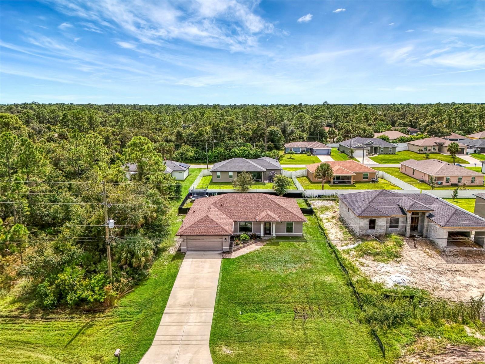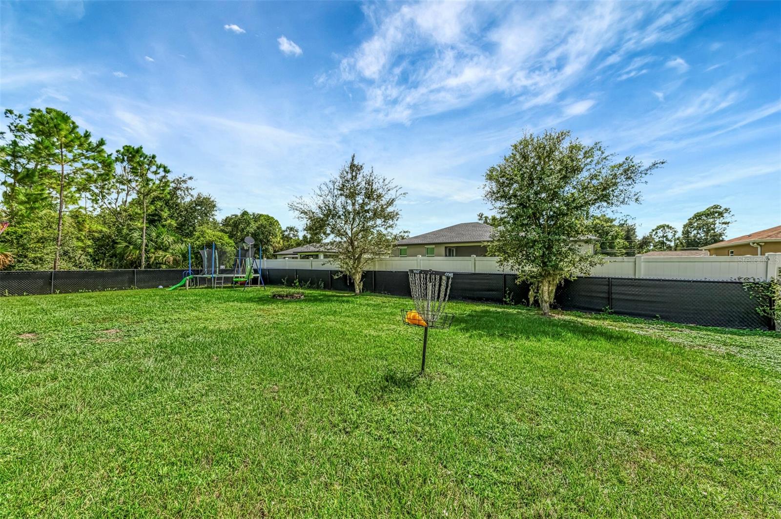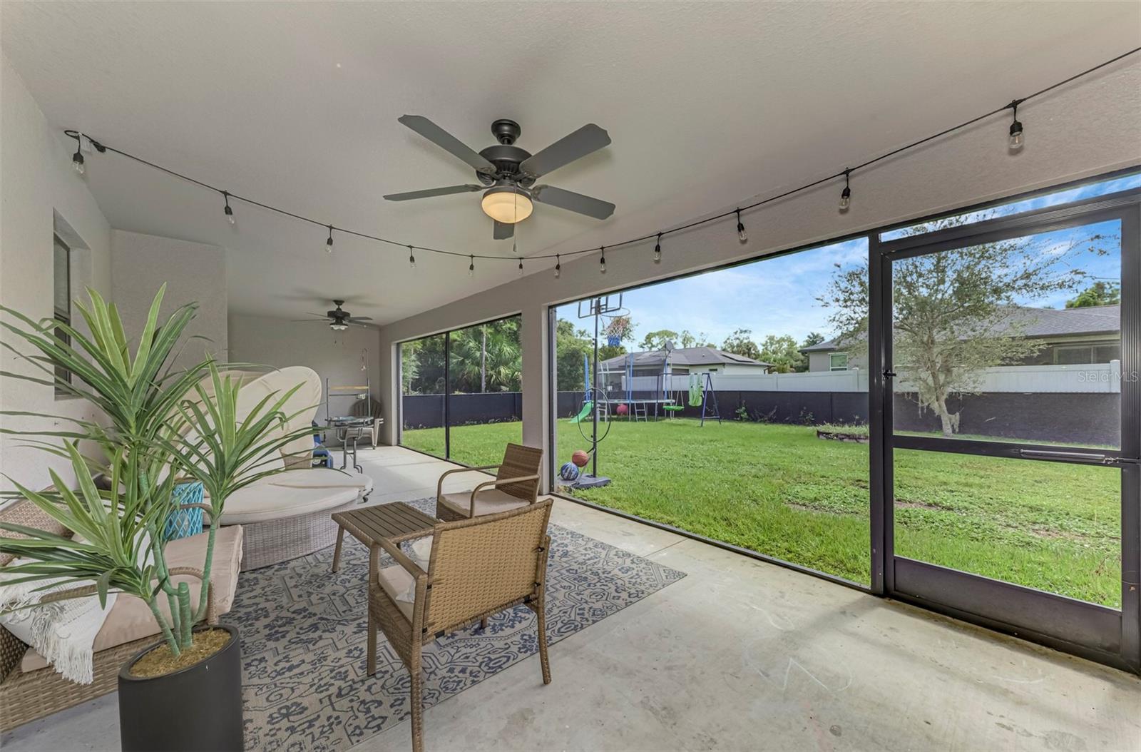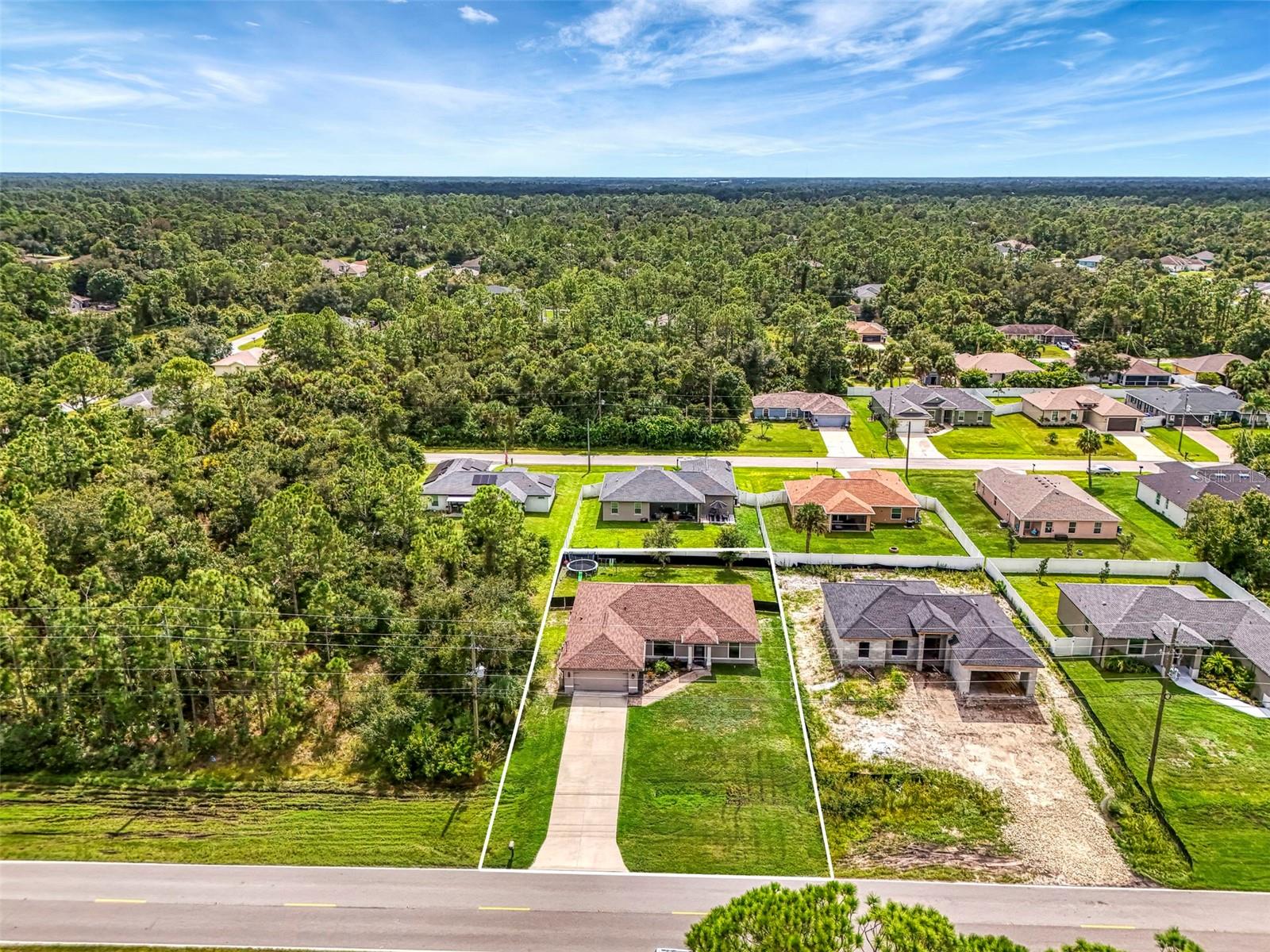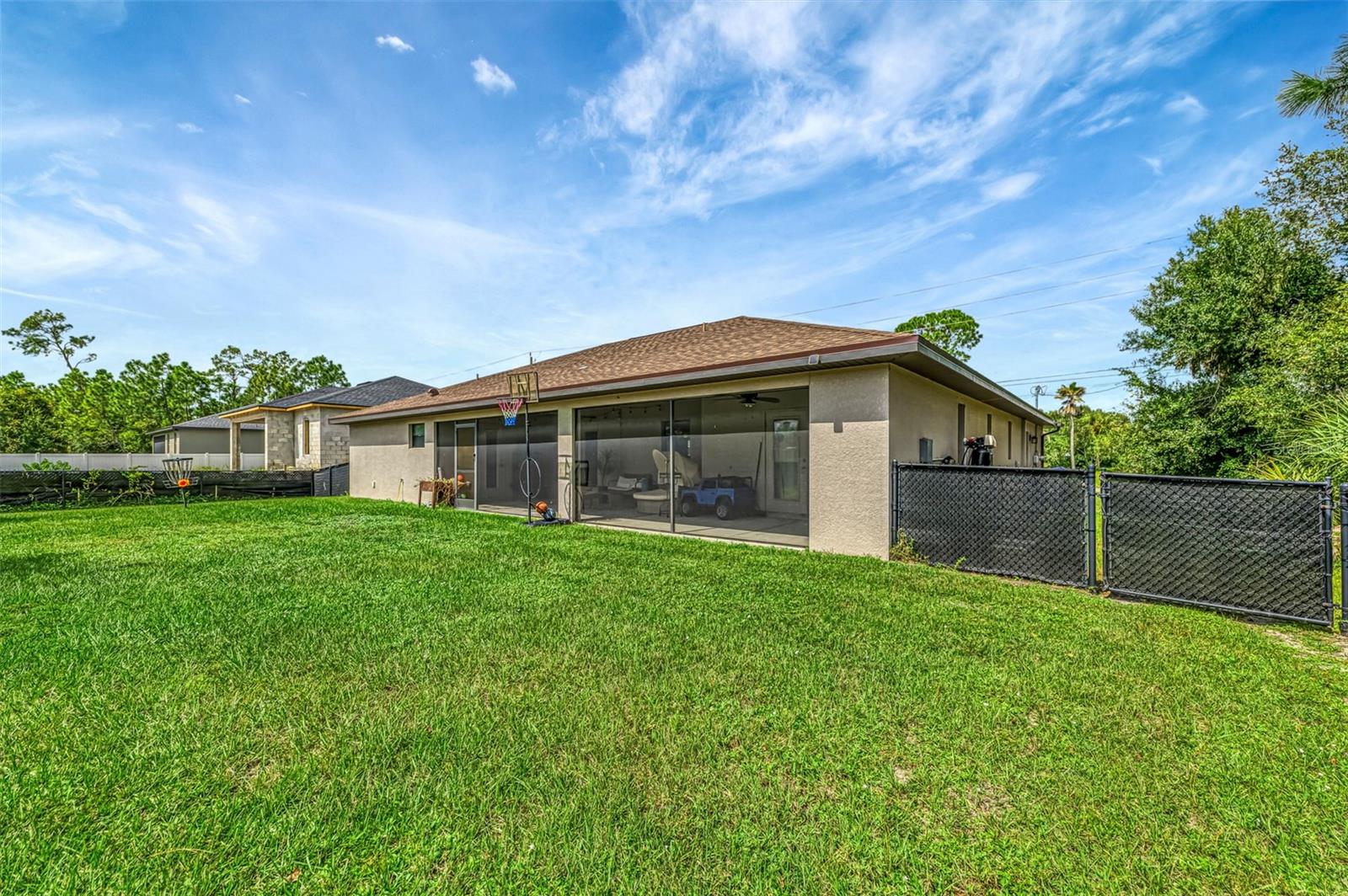 NORTH PORT ESTATES BEAUTY! Built in 2019 and offering nearly 1,700 square feet of UPGRADED living space, this 3-bedroom, 2-bathroom home—with an ADDITIONAL DEN OR OFFICE featuring a decorative BARN DOOR that can easily serve as a 4th bedroom—delivers the perfect blend of style, comfort, and practicality. With a NEW ROOF (2023), no HOA fees, and NO FLOOD ZONE, this property is ready for worry-free living. Step inside and feel the open flow of cathedral ceilings and elegant plank tile flooring throughout. The great room seamlessly connects to a gorgeous modern kitchen, complete with a CENTER ISLAND QUARTZ OPEN BREAKFAST BAR, SLOW-CLOSE WOOD CABINETRY WITH CROWN MOLDING, SUBWAY TILE BACKSPLASH & BLACK STAINLESS -STEEL APPLIANCES and UPGRADED PENDANT LIGHTING. Whether preparing a meal or entertaining, this kitchen makes it easy and enjoyable. The dining area’s FRENCH DOORS open to an HUGE OVERSIZED 12x37-FT. COVERED LANAI, overlooking a FENCED BACKYARD with room to relax, play, or garden. (Yes, the trampoline can stay!) Enjoy outdoor living all year long in privacy and peace. The primary suite is a showpiece with a tray ceiling, a large walk-in closet, and a luxurious ensuite featuring DUAL QUARTZ SINKS, a GARDEN TUB, and a MULTI HEAD SHOWER. Both guest bedrooms are generously sized—13x11—with walk-in closets and ceiling fans. The guest bath includes a tub/shower combo and stylish finishes. Additional highlights include: indoor laundry with washer and dryer, BRICK PAVER DRIVEWAY & WALKWAY, FULL HURRICANE PROTECTION, newer well, UPDATED A/C, WATER SOFTNOR, and SECURITY CAMERAS. Located in sought-after North Port Estates, you’ll enjoy the quiet country feel while being just minutes from city conveniences. Nearby Myakkahatchee Creek Environmental Park offers scenic walking and biking trails, horseback riding, fishing, and picnic areas. You’re also close to I-75, the new Sarasota Memorial Hospital, shopping, restaurants, and top local attractions. Move-in ready, beautifully maintained, and priced right—this home checks every box. FURNITURE IS NEGOTIALE! Schedule your private showing today!