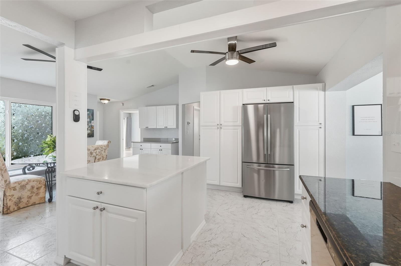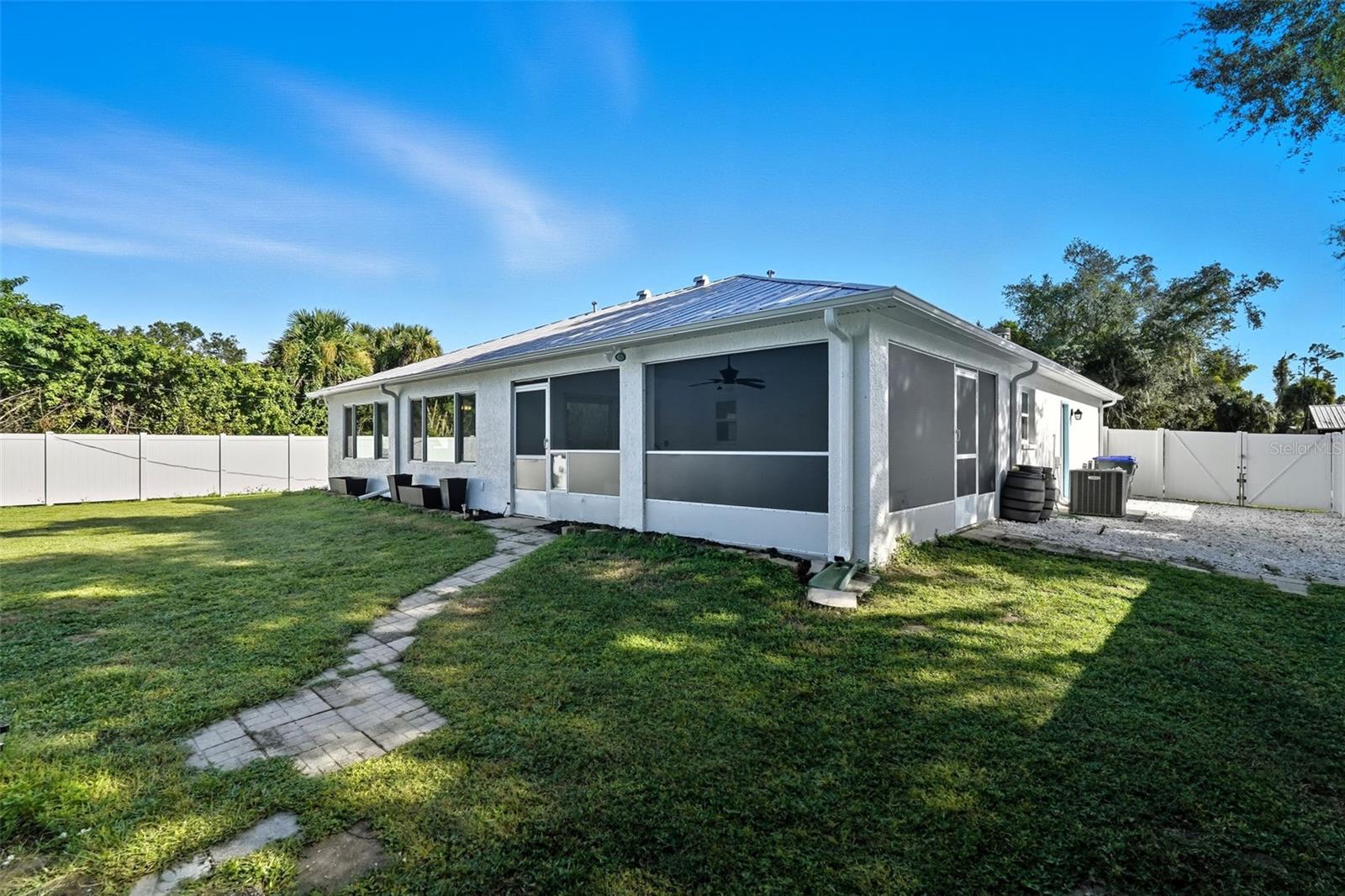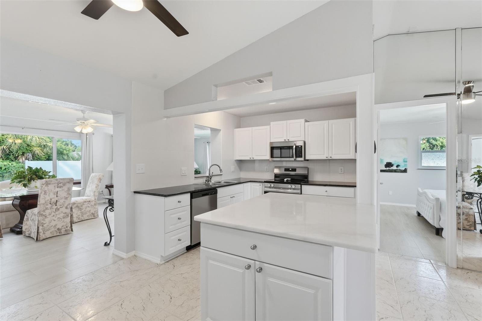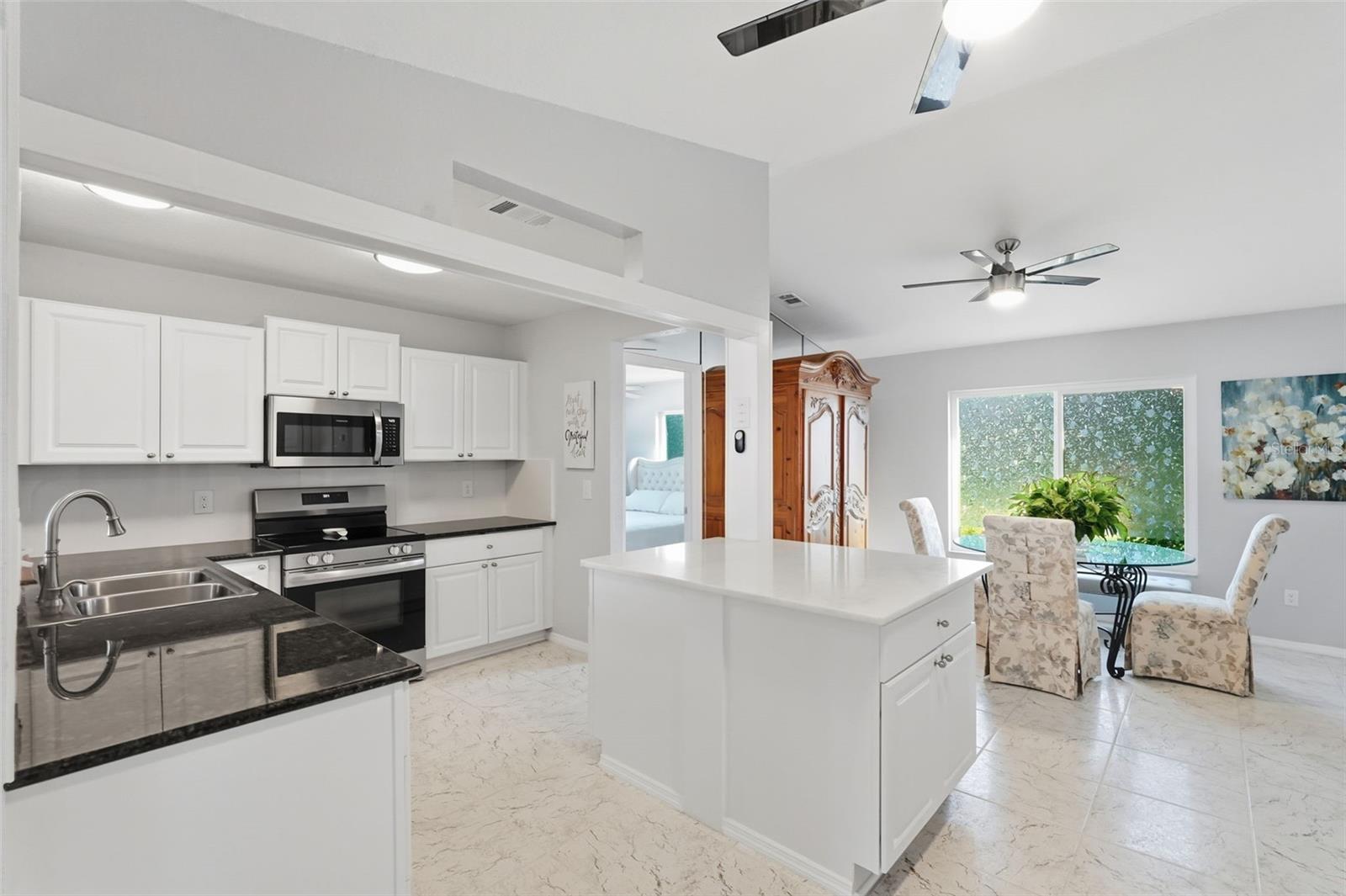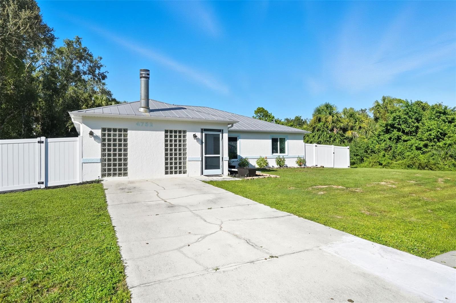 Welcome to this beautifully updated home in a desirable North Port location, just minutes from shopping, dining, schools, and easy access to I-75. With thoughtful upgrades inside and out, this residence is truly move-in ready. Step inside to discover a spacious 2-bedroom, 2-bathroom layout with a versatile family room with some storage, featuring a wood-burning fireplace—perfect for a cozy retreat, office, or den. The split floor plan provides privacy, while new tile flooring in the great room and both bedrooms adds a fresh, modern feel. The inviting great room is filled with natural light from the large windows and opens to the fully screened lanai through attractive sliding glass doors, creating the perfect flow for indoor-outdoor living. The kitchen has been refreshed with some new cabinets, and quartz countertops, an expanded island with elegant marble countertop (for it's heat resistance), offering both functionality and style for cooking, entertaining, and gathering. The interior and exterior have been freshly painted, giving the home a crisp, welcoming appeal. Additional updates include: new hurricane impact windows (2024), AC, hot water heater, and electrical panel (2023), plus a brand-new range/oven, dishwasher, washer, and dryer (2024). The durable metal roof (2007) provides peace of mind, and the property is not located in a flood zone. With modern finishes, low-maintenance living, and a convenient North Port location close to Gulf beaches, parks, and Warm Mineral Springs, this home is packed with character and ready for its new owner.