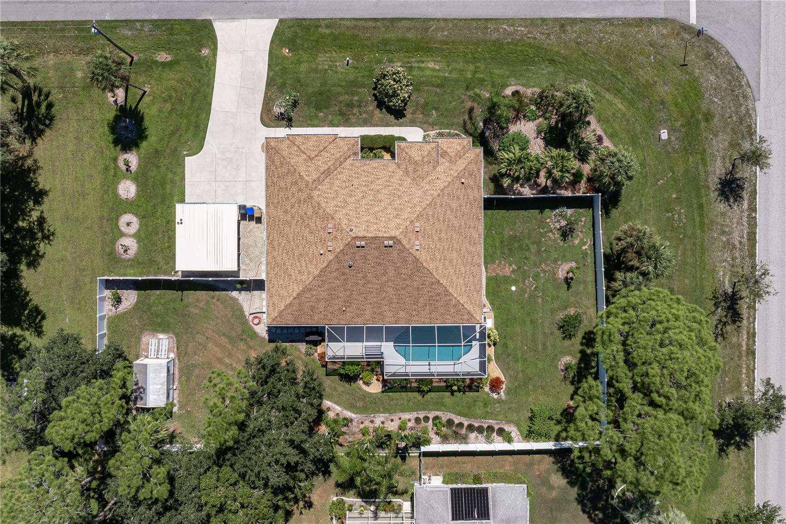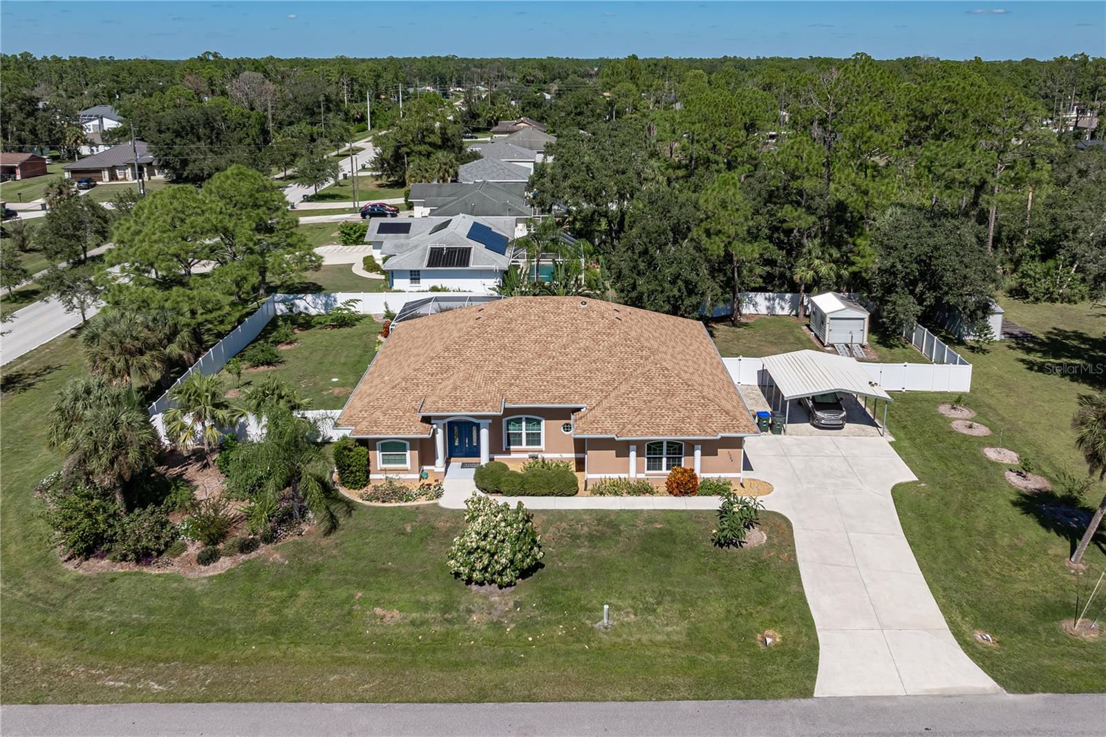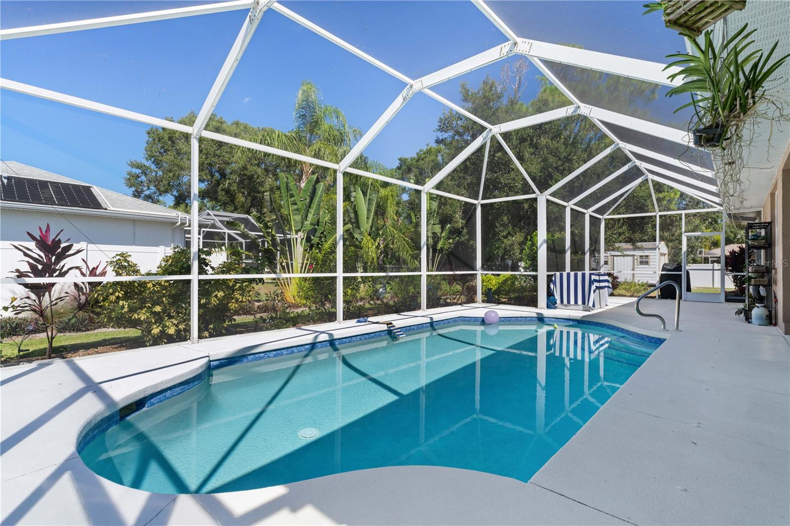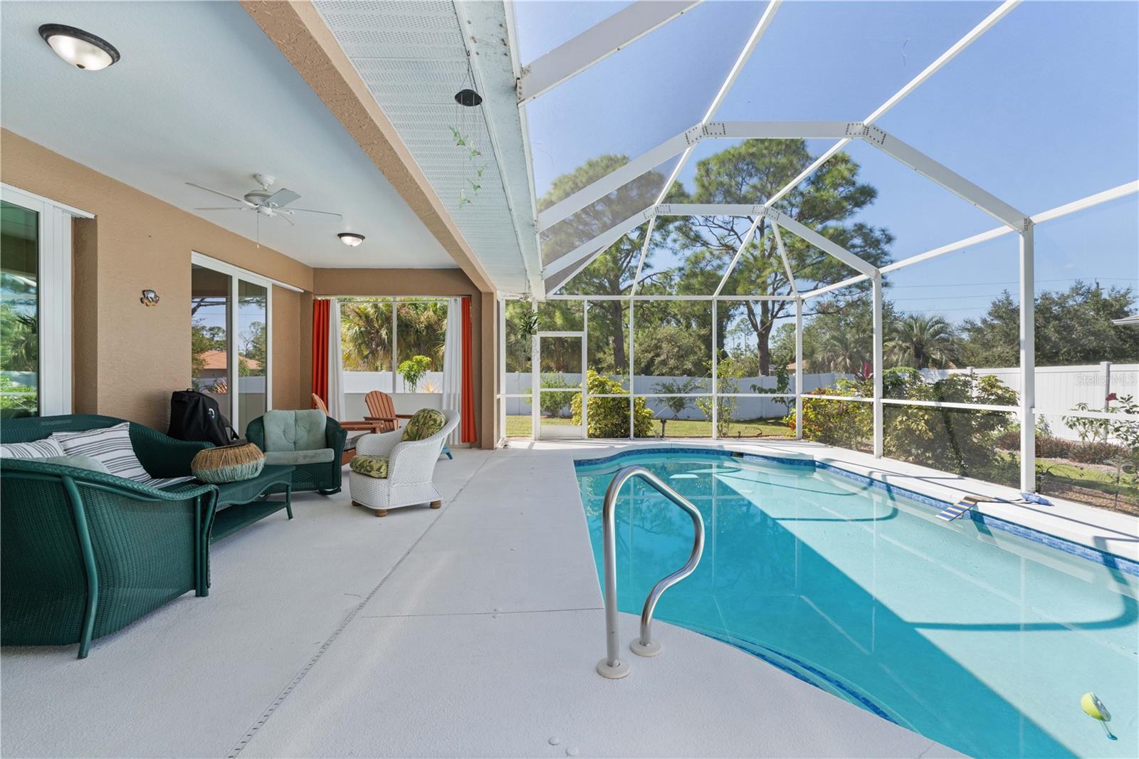 UPDATED NORTH PORT HOME WITH POOL ON DOUBLE LOT - Beautifully-maintained 3 bed/2 bath North Port home with a saltwater pool boasts over 2,200 square feet of living space and sits on a spacious double lot with a fully fenced yard, lush tropical landscaping, and mature fruit trees. Located in a quiet neighborhood on a corner lot, the home blends privacy, comfort, and modern updates while being just minutes from shopping, dining, and everyday conveniences. Inside, the open-concept layout features high ceilings, crown molding, elegant columns, and tile flooring throughout. Disappearing sliding glass doors create a seamless flow between indoor and outdoor living spaces. A sitting room off the main living area offers flexible use as a breakfast nook, home office, or cozy den, while the spacious formal dining room is ideal for gatherings. The kitchen is designed with both function and style in mind, featuring solid surface countertops, stainless steel appliances, and a breakfast bar that opens to the great room. The dedicated RO (reverse osmosis) system for the refrigerator has a discrete drain line. The master suite is a true owner's retreat with a spa-like en-suite bath that includes a freestanding soaking tub, a large frameless glass shower, split vanities with quartz counters, and upscale finishes throughout. The split-bedroom design provides added privacy for owners and guests alike. One guest room has a wall of built-in bookshelves - creating an ideal home office or flex space. The guest bedrooms share a guest bath that doubles as a pool bath with access to the lanai. Outside, the screened lanai offers a covered seating area and a large pool deck surrounding the in-ground, saltwater pool. Lush, tropical landscaping surrounds the pool cage creating the feel of a private oasis in your backyard. Garden/flower beds have in-ground irrigation system. New 10x16 shed w/ramp in the backyard is perfect for housing your gardening equipment or any other tools or toys. The oversized 2-car garage includes additional space for storage, and the extended driveway with a bonus carport offers ample parking options. With a new shingle roof in 2023, an HVAC system updated in 2025, impact windows throughout, and tile floors in every room, this home is truly move-in ready. It offers a rare combination of space, upgrades, and privacy on a quiet street in North Port—with no HOA and all the benefits of Florida living at your fingertips. Make an appointment today.