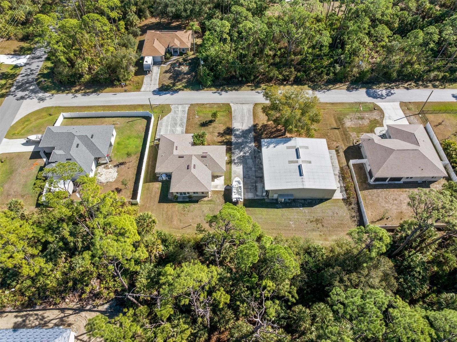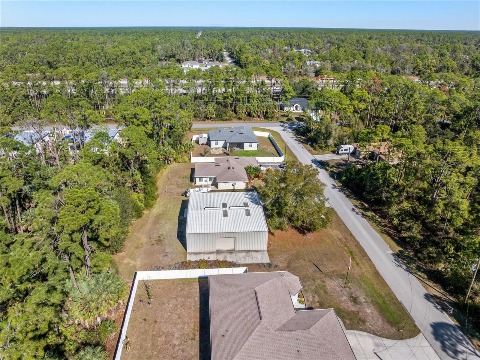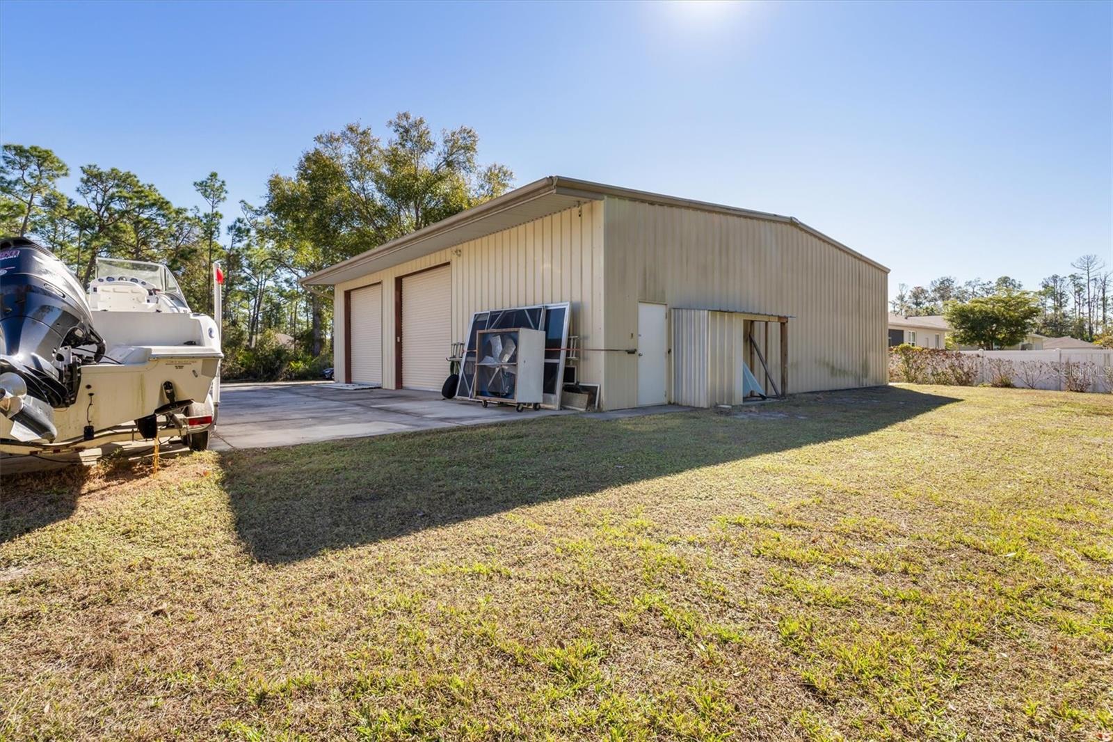 ATTENTION ALL CAR ENTHUSIASTS! This rare property delivers space, style, and serious storage on two generous lots. The showstopper is a massive 50x60 metal pre-fab building designed to hold 6–8 vehicles with ease, plus room for a boat, RV, workshop, or all three. Solid construction and wide concrete driveways make parking, storing, and working simple and stress-free. This is a hard-to-find setup that adds huge value and flexibility. The main home is a well-cared-for 3-bedroom, 2-bath split plan with a 2-car garage and beautiful curb appeal. Mature palms, manicured shrubs, and colorful accent rock frame the home and create a polished look. A new roof in 2023 and a new A/C system provide peace of mind and energy efficiency. Inside, the layout is bright and open. The living room features cathedral ceilings, laminate wood flooring, and two large windows that fill the space with natural light. The kitchen connects seamlessly to the living and dining areas and includes white raised cabinetry, a pantry closet, stainless double sink, and a breakfast bar ideal for casual meals or entertaining. Just off the dining area is a standout bonus: a 493-square-foot air-conditioned room with rubber mat flooring. This flexible space works beautifully for fitness, yoga, hobbies, creative projects, or a game room. Sliding doors lead from the back family room to a concrete patio, perfect for grilling or relaxing outdoors. The backyard is quiet and peaceful, backed by a wooded view that adds privacy and charm. The primary bedroom includes crown molding, a ceiling fan, and a spacious walk-in closet. The private bath offers a walk-in tiled shower, large vanity with porcelain sink, and extra storage. Two additional bedrooms feature newer carpet and ceiling fans, with a nearby guest bath offering a tub/shower combo. Ceramic tile finishes the kitchen, baths, and entry for easy maintenance. Extra features include hurricane shutters, a water softener with aerator, and exceptional parking options. The home has a double concrete driveway, while the storage building boasts a triple-wide driveway plus additional concrete parking areas. Located minutes from shopping, schools, I-75, Wellen Park, the Atlanta Braves Stadium, Town Center Mall, and the new SMH hospital, this property combines convenience with unmatched space. Opportunities like this do not come around often—schedule a private showing today.