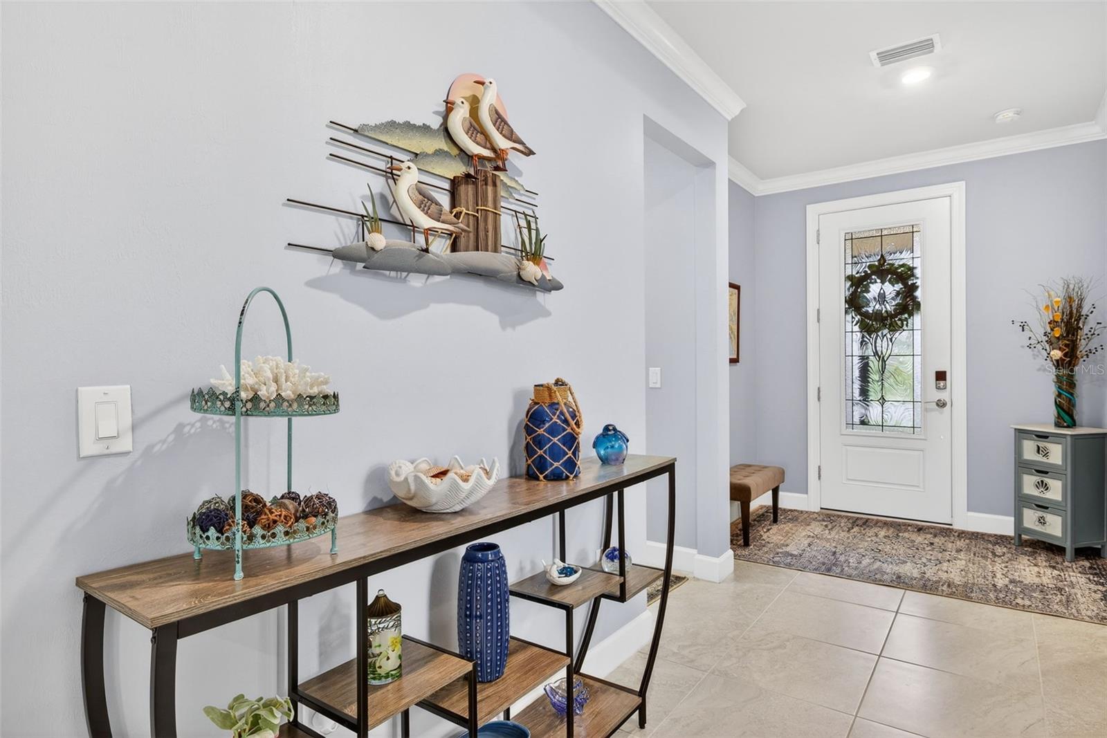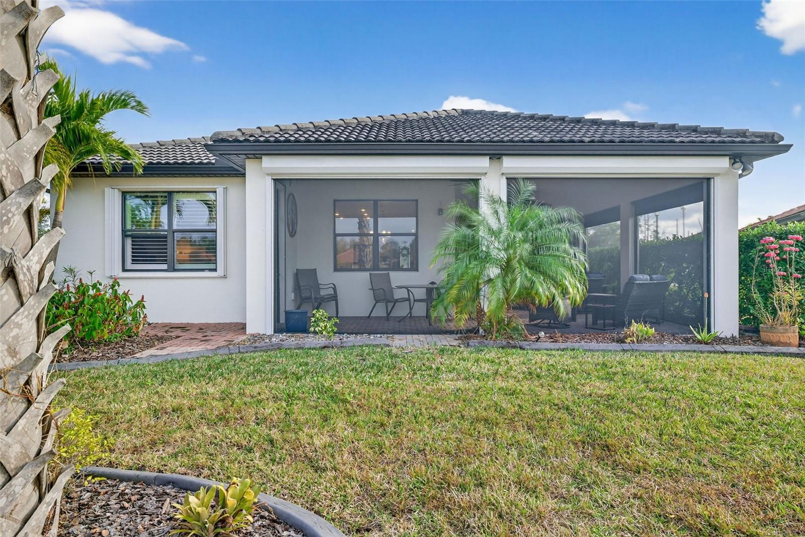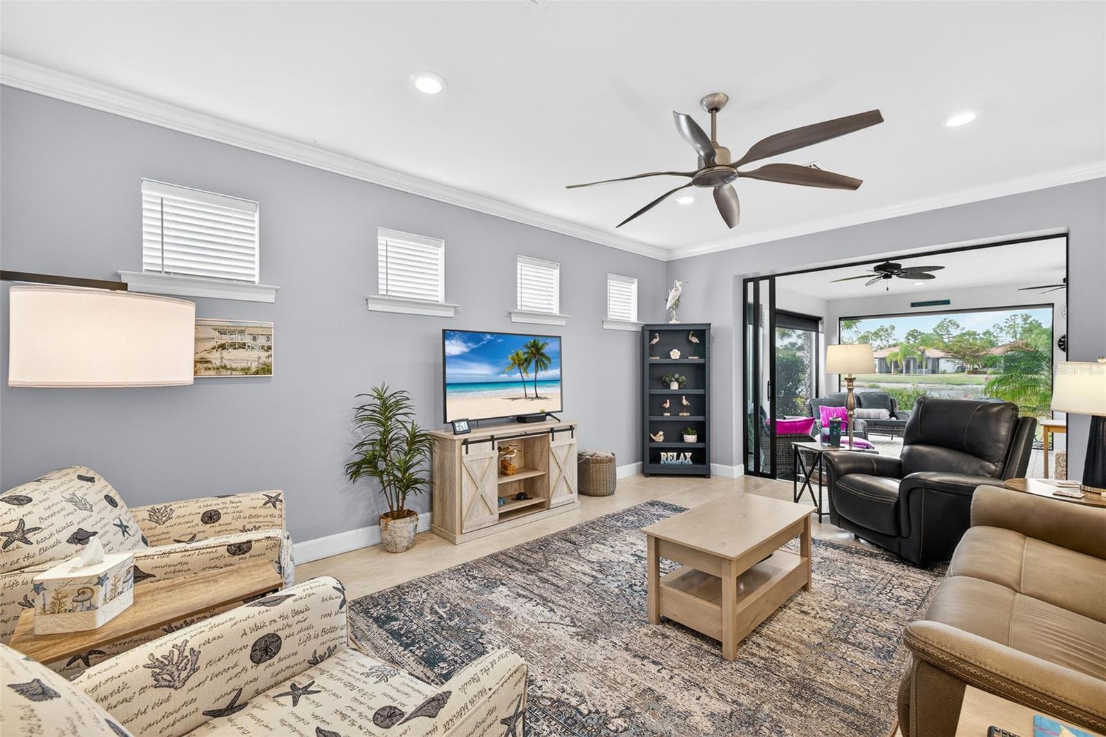 Turnkey and move-in ready, this beautifully upgraded home is located on a premium lake view lot in the desirable 55+ Del Webb community of Cypress Falls at the Woodlands. Built in 2020, the residence includes a model upgrades package valued at over $70,000, along with substantial post-construction enhancements, offering comfort, convenience, and peace of mind. The thoughtfully designed floor plan features 2 bedrooms, 2 bathrooms, and a den/office, plus an extended garage with additional space for storage or golf cart parking, finished with an epoxy-coated floor. Exterior highlights include extensive front and rear landscaping with curbing, a screened front entry, and tranquil lake views. Inside, the home is finished with tile flooring throughout, 8’ interior doors, high baseboards, and extensive crown molding. The open living and dining areas are enhanced by a custom lighting package and sliding glass pocket doors, creating seamless indoor-outdoor flow. The kitchen is both functional and stylish, offering stainless steel appliances, quartz countertops, an expanded island with a large premium kitchen sink, pull-out cabinet drawers, glass tile backsplash, under-cabinet lighting, and pendant lighting over the island, ideal for entertaining or everyday living. The primary bedroom enjoys peaceful lake views and features a tray ceiling with crown molding and an extended walk-in closet with built-in shelving. The bath includes granite countertops and a walk-in shower. A comfortable guest bedroom and full guest bath with a walk-in shower and quartz countertop provide privacy for visitors. Additional features include custom interior paint, plantation shutters, smart home lighting with Alexa, keyless entry for the front door and garage, and a smart thermostat. The laundry room includes custom cabinetry for added storage. Outdoor living is highlighted by the extended screened lanai, complete with sunshades and no-see-um screens, offering the perfect setting to relax and enjoy Florida living. In addition to the extensive builder upgrades, the home also includes over $20,000 in hurricane protection, featuring a combination of motorized and manual roll-down shutters, accordion shutters, and impact-resistant Lexan panels, providing comprehensive storm protection and peace of mind. Residents of Cypress Falls at the Woodlands enjoy an impressive amenity center and an active community environment, including a full-time lifestyle director, state-of-the-art fitness center, resort-style pool, resistance pool, whirlpool, pickleball and tennis courts, bocce ball, horseshoe pits, billiards and card rooms, arts and crafts studio, grand social hall with catering kitchen, library, café with wireless internet, dog park, and resident garden plots, along with a full calendar of clubs and activities. This turnkey home presents an outstanding opportunity to enjoy quality, upgrades, and lifestyle in one of the area’s most sought-after 55+ communities.