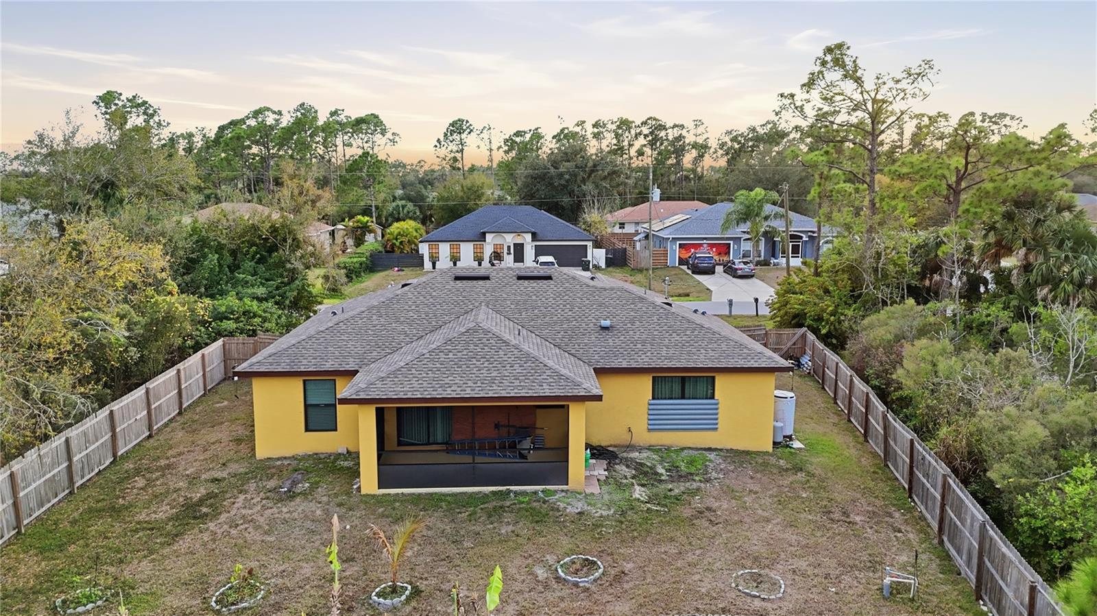 Beautifully maintained 4-year-old Windemere home featuring a well-designed open floor plan with wood-plank tile flooring throughout. The spacious primary suite offers a tray ceiling, walk-in closet, and a private en-suite bathroom with dual sinks, soaking tub, and separate shower. The guest bedroom is conveniently located near the second full bathroom with a walk-in shower. A versatile den/entertainment room provides additional living space, while the mudroom/home office offers flexibility for remote work or organization. The open kitchen features solid wood cabinetry, quartz countertops, stainless steel appliances, and a functional layout ideal for everyday living and entertaining. Quartz countertops continue in the bathrooms, creating a cohesive and modern finish. Bright, connected living and dining areas provide a comfortable and natural flow throughout the home. Additional features include an attached, insulated two-car garage with laundry hookups and utility sink. Enjoy outdoor living on the screened lanai with screened kick wall, overlooking a fenced backyard with a park-like setting. Additional upgrades include a hurricane-impact front door, garage window with added insulation, patio area, water well chlorinator, and extra insulation. Conveniently located with easy access to Route 41, commuter roads, shopping, dining, and top-rated schools.