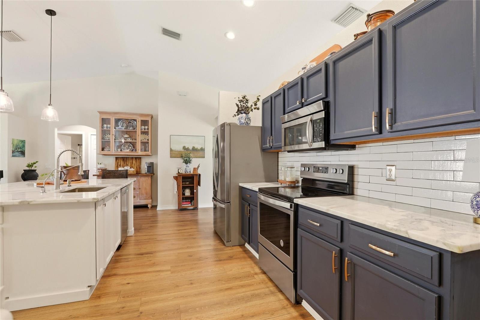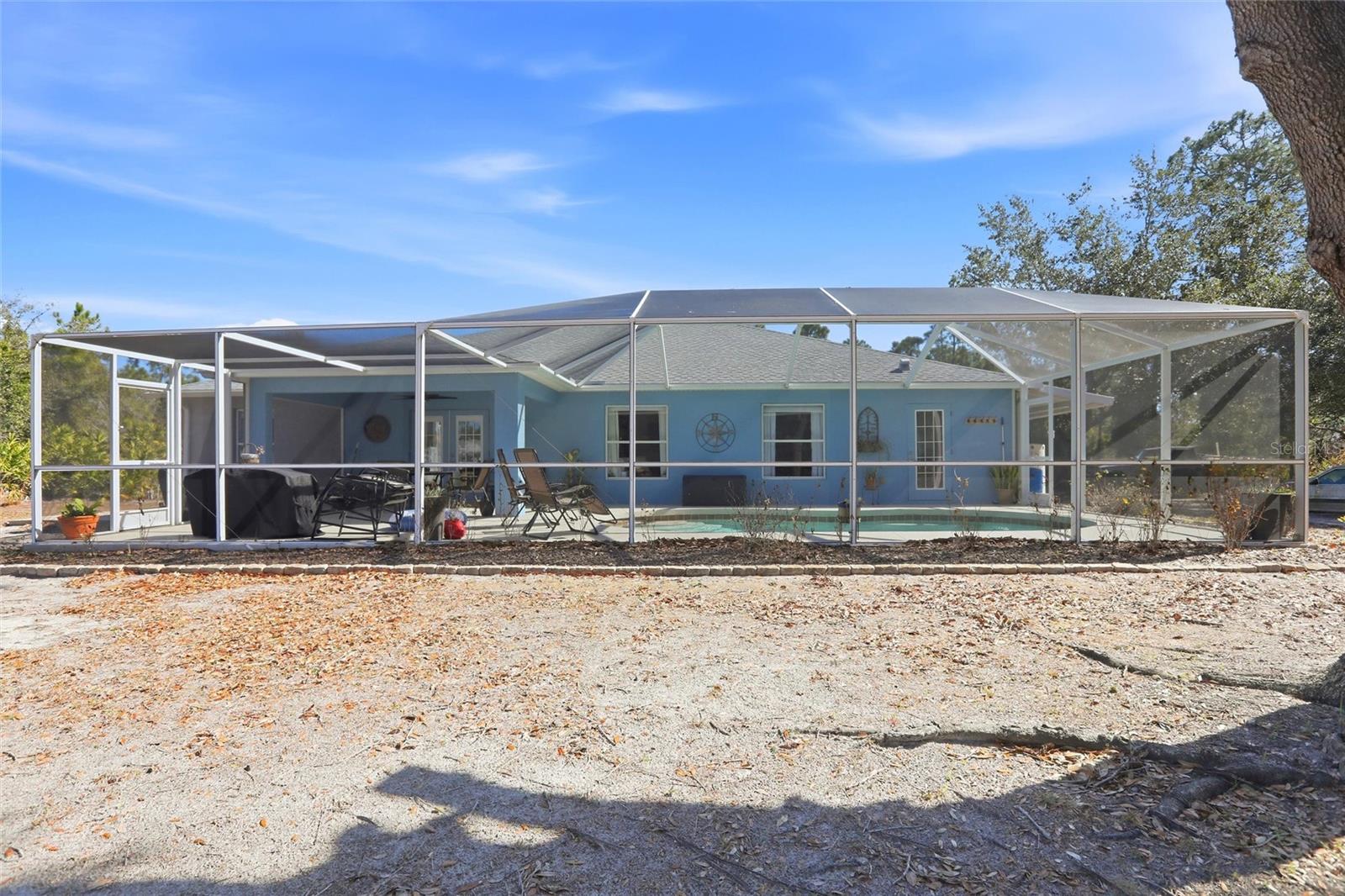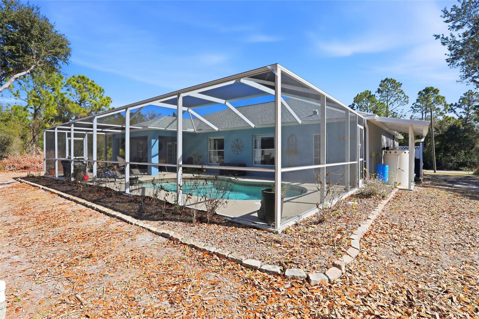 Spacious, light-filled home in a quiet, established neighborhood. This move-in-ready home features a flexible open split floor plan with three bedrooms plus two bonus rooms (one with French doors and a closet) perfect for a home office, den, or formal dining. Cathedral ceilings and newer laminate flooring make the home feel larger than the tax records suggest. The entertainer’s kitchen offers granite countertops, ample wood cabinetry, a large island, coffee bar, recessed lighting, and a pantry with a charming barn door, all overlooking the large living area and private pool. French doors open to an extended lanai for seamless indoor-outdoor Florida living. The primary suite includes a sitting area, drop-down TV, and en-suite bath with jetted tub, separate shower, and lanai access. Extras include new roof 2022, newer kitchen appliances,under sink reverse osmosis, on-demand whole-home water heater, hurricane shutters, interior laundry with storage, and an ideal location near schools, hospitals, shopping, and I-75.