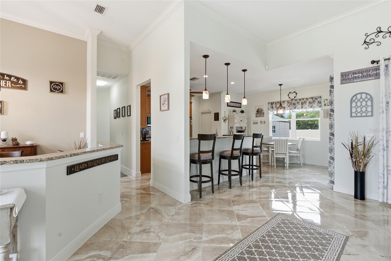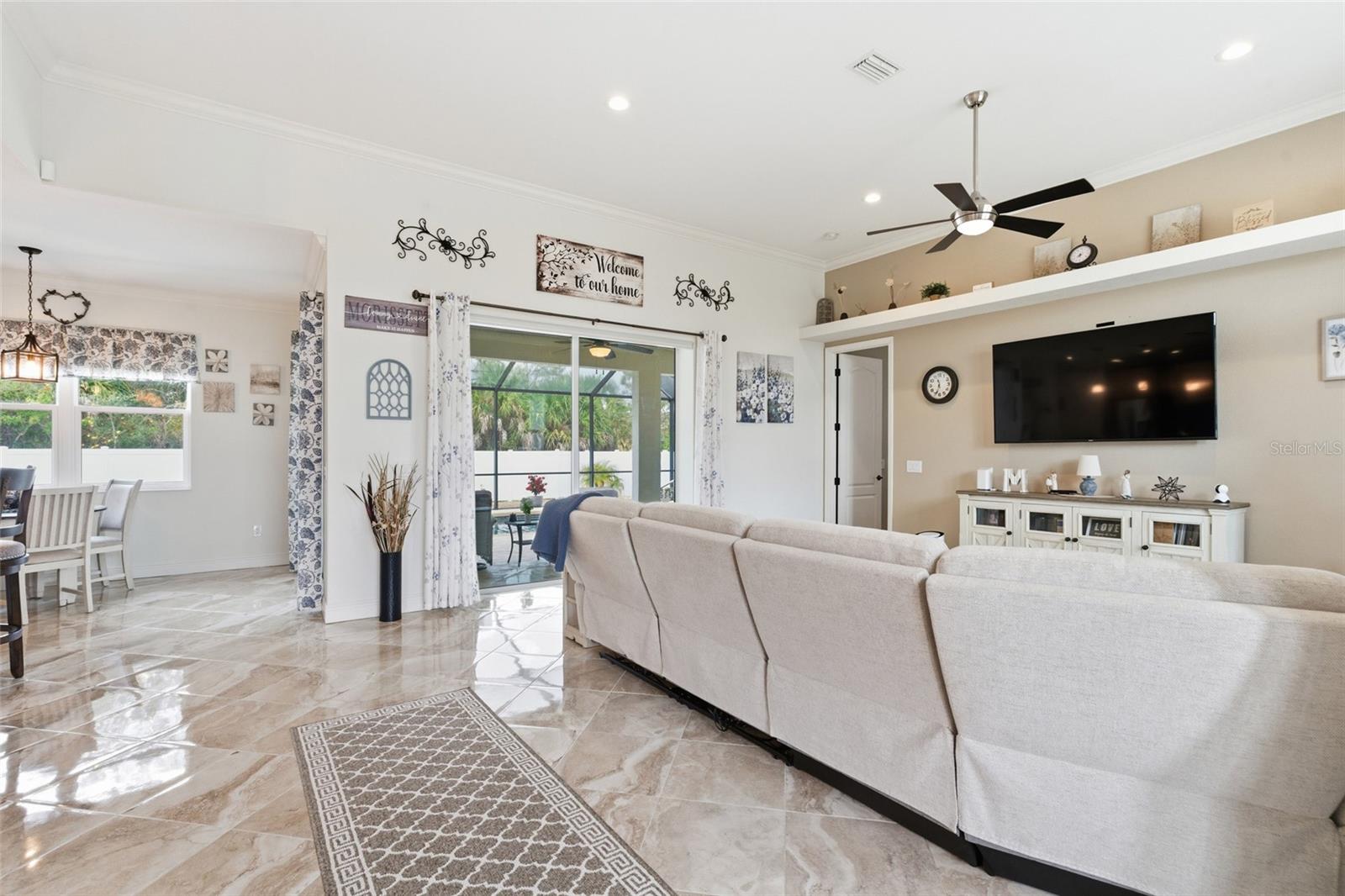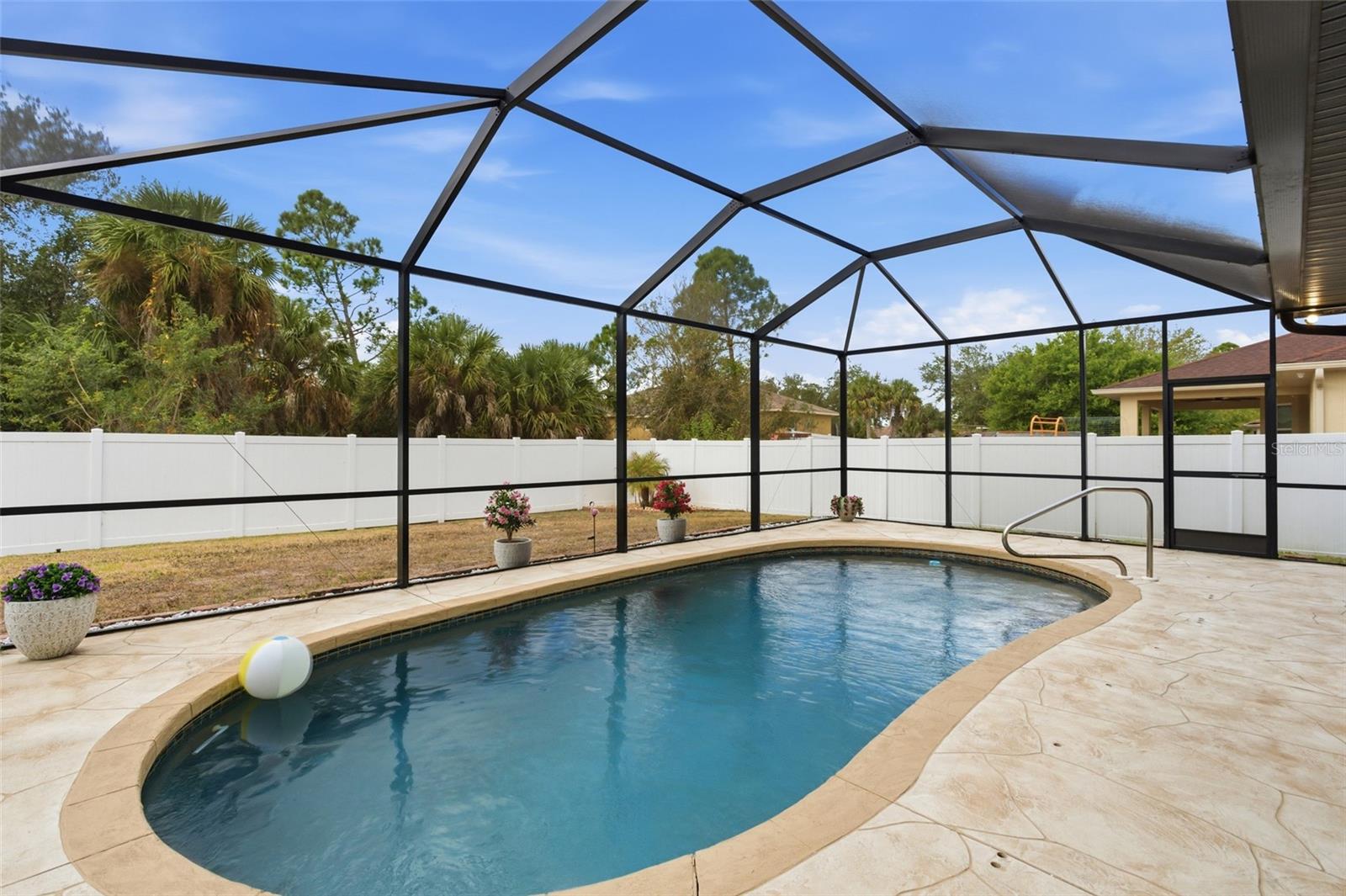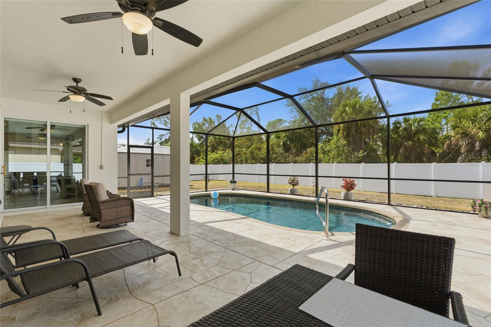 Step into comfort and style with this inviting 3 bedroom, 2 bathroom, 2-car garage pool home situated on an OVERSIZED LOT in North Port, offering a bright and open floor plan designed for easy living and effortless entertaining. NO HOA FEES & NO FLOOD REQUIRED! CLICK ON THE VIRTUAL TOUR LINK 1 FOR THE VIDEO AND VIRTUAL LINK 2 FOR THE 3D TOUR. Inside, you’ll find high ceilings and elegant marble tile flooring throughout the main living areas. The spacious living room features a glass slider to the lanai and flows seamlessly into the formal dining room, creating a welcoming space for gatherings. The eat-in kitchen is thoughtfully designed with all stainless steel appliances, granite countertops, a tiled backsplash, a large walk-in pantry, instant hot water tap, abundant cabinet and counter space, a center prep island, and a breakfast bar. The dinette area also offers a glass slider to the lanai, making indoor and outdoor entertaining simple and convenient. The spacious primary suite includes dual closets — one walk-in with custom shelving — French doors to the lanai, and a private bathroom with a dual sink vanity, dedicated makeup vanity, and a Roman walk-in shower. The guest bedrooms are positioned on a split floor plan for added privacy, with a shared guest bathroom nearby. The screened lanai is ideal for entertaining, featuring a heated saltwater pool, plenty of deck space for soaking up the sun, and an outdoor shower. The fenced backyard showcases lush landscaping and a 10' x 15' shed for extra storage. There is also plenty of room to expand — whether you envision a garden, additional outdoor living space, or a custom backyard oasis. 2025 ROOF - NEWER A/C - EXTRA WIDE DRIVEWAY FOR AMPLE PARKING - WATER SOFTENER - SEPTIC PUMPED 2020 - 2024 INTERIOR PAINTED - 2025 EXTERIOR PAINTED - NEWER APPLIANCES - 2024 POOL HEATER - GARAGE STORAGE. Conveniently located close to I-75, US-41, and 776 providing easy access to shops at Price Crossing, Cocoplum Shopping Center, and the Port Charlotte mall, where you can choose from a variety of restaurants, grocery stores, retail shops, and a short car ride to award-winning beaches, making this an ideal location!! Schedule your showing TODAY!