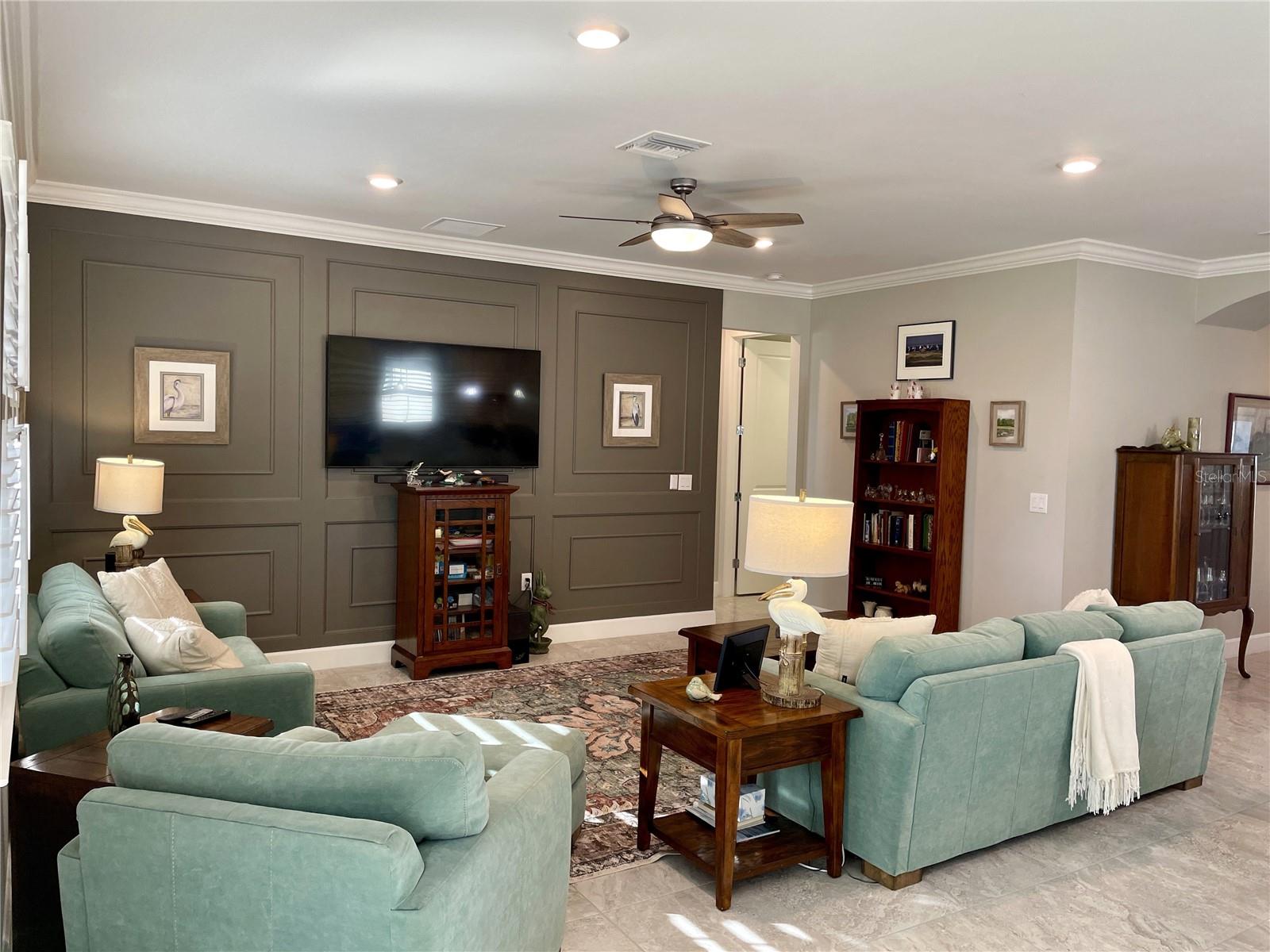 Stunning home situated in Cypress Falls, a 55+ Del Webb resort style gated community! This 2021 built, water view, split/open floor plan, 1789sf, 2/2/2 with a Den/Study, added Sunroom, screened lanai/patio extension, and so many more updates, is waiting for you to tour and fall in love! There are high ceilings, planation shutters, crown molding, ceiling fans, Quartz counter tops, white cabinets, updated a/c to equally distribute the air flow in each area of the home (very important update), feature wall in the Great room, closet designs in the kitchen pantry, Primary bedroom walk-in closet, and added cabinets/closets and shelving in the Laundry room. There is tile throughout the main living areas. The Kitchen, Great room, Casual dining all share space. The large Kitchen has 42" white cabinets, banks of drawers, additional cabinets in the island/breakfast bar, stainless appliances, under cabinet lighting, large sink, accent backsplash, and a pantry. The Great room has windows that look out over the outdoor living space and backyard view of Lake Wilson. It also has a beautiful feature wall. The Casual dining is between the Kitchen and Sunroom. The Sunroom has windows on 2 walls and sliders out to the screened Lanai. The Sunroom allows nature light into the large shared living space. The Primary bedroom and inside Laundry room are off of the Great room. The bedroom has a view of nature with the landscaped yard and lake. The Primary bathroom has a spacious walk-in shower, long vanity with 2 sinks, many cabinets and banks of drawers, water closet, and a huge Walk-in closet that has been organized with many shelves, drawers and racks. The 2nd Bedroom is in the front of the home and has a wall of windows. The guest bathroom is between the 2nd bedroom and Den/Study. It has a tub/shower. The Den/Study has a double door entry. This room can also be used as a 3rd bedroom. Across the main hallway is a smaller hall with a linen closet and air handler closet and access to the garage. The Laundry room has been updated with cabinets, closets and shelves for additional storage in the home. The Outdoor living space is peaceful. It is a great space to sit back and enjoy nature or entertain friends. The community has so much to offer with the amenities center, activities director and many social neighbors. The golf cart is sold separately. The washer, dryer and additional garage refrigerator do not convey with the home.