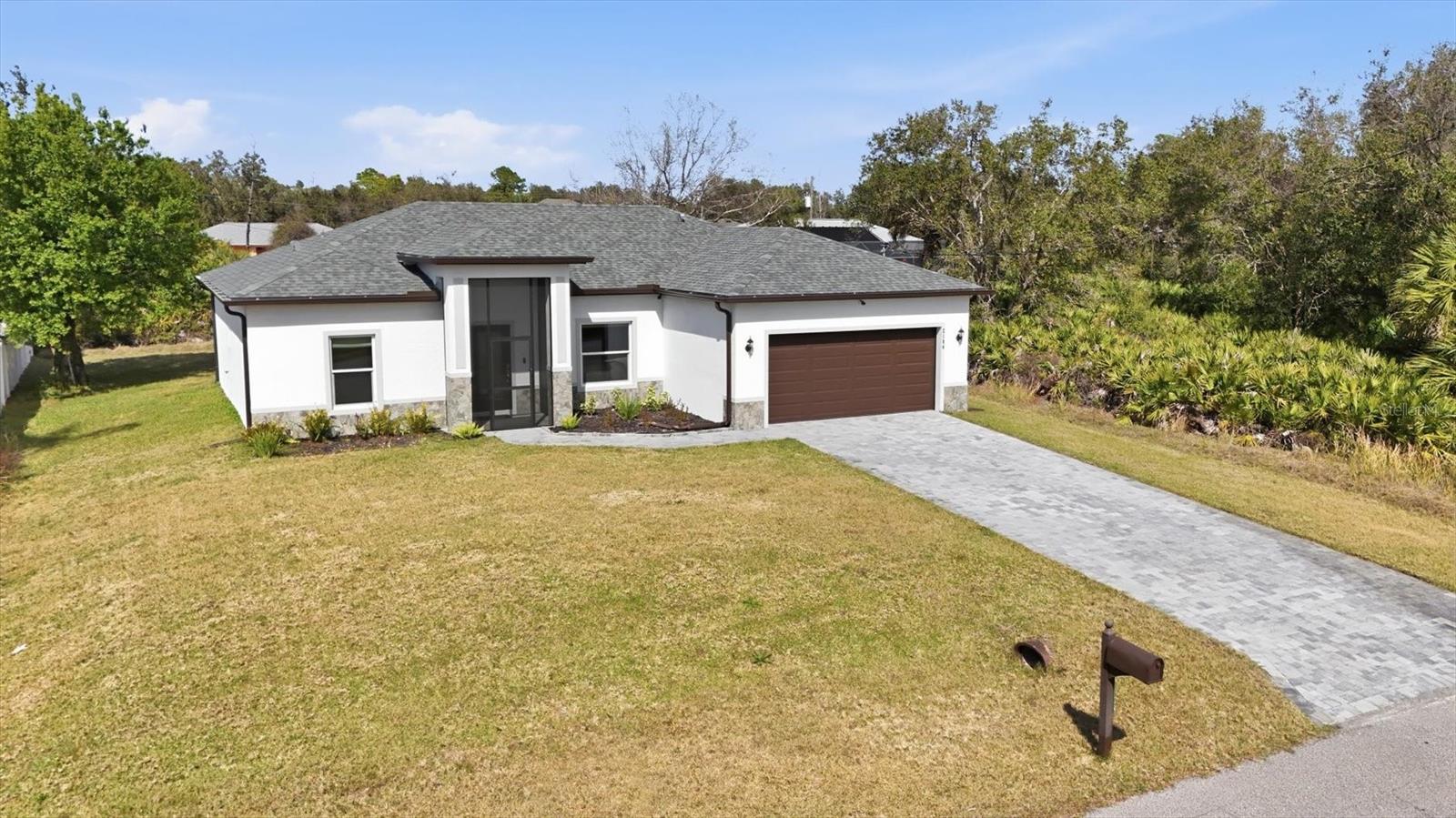 Built in June 2025, this stunning 3-bedroom, 2-bathroom home with a 2-car garage offers modern luxury, smart-home convenience, and exceptional upgrades throughout. Beautiful pavers enhance both the walkway and driveway, creating impressive curb appeal from the moment you arrive. Inside, you’ll find soaring tray ceilings and elegant porcelain tile flooring throughout the entire home, delivering a seamless and sophisticated look. The gourmet kitchen features 42-inch upper cabinets, a spacious pantry closet, and premium granite countertops that continue into both bathrooms. All appliances are brand new. Designed for comfort, efficiency, and peace of mind, this home includes hurricane-impact Low-E windows and doors, a Waterdrop reverse osmosis filtration system (also connected to the refrigerator), and full gutters surrounding the property. The screened front patio and extended lanai offer true indoor-outdoor living. The lanai features Super Screen and Vista View screens with no structural posts, providing an unobstructed view and enhanced durability. Smart-home and technology upgrades include: Power blinds in the great room and primary bedroom (solar-powered and smart-home compatible) Touchscreen alarm system managed through the Turya app 180-degree panoramic security camera with motion tracking WiFi video doorbell camera NVR RLN8-410-WHITE 8-channel network video recorder (PoE system) Smart light switches (kitchen, counters, great room, exterior garage, and front entry) Smart ceiling fans with remote controls Motion-sensor lighting in the garage and primary closets RainBird irrigation system with added WiFi module for online access This nearly new, thoughtfully upgraded home combines elegance, energy efficiency, and advanced technology—offering today’s buyer the convenience of new construction without the wait. Furniture is for the convenience of the buyer