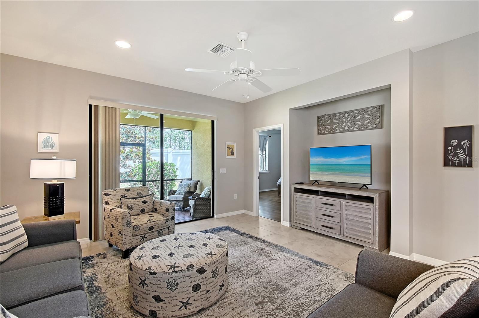 PRICE IMPROVEMENT AND SELLER'S ARE OFFERING 6-MONTHS OF HOA FEES AT CLOSING!!! Welcome to 1318 Ballota Ln. in the sought-after 55+ gated community of Cypress Falls at the Woodlands. This bright and spacious 1582 sqft end-unit home is fully furnished. The front entry features lush landscaping. Walking into the home you will notice the kitchen with granite countertops, ample cabinets, and counter space. The open-concept living and dining areas are perfect for entertaining. The primary bedroom includes a large walk-in closet and an en-suite bath with dual sinks, upgraded tile, and a spacious shower. A versatile flex room with French doors can serve as an extra guest room, while the guest bedroom and bath ensure visitors to feel at home. When you want serenity just walk out to the fully covered lanai where you have privacy to read books, entertain or just relax. The laundry area is conveniently near the garage and finally the large 2 car garage with ample storage space. Cypress Falls also boasts a wealth of amenities, including a clubhouse, resort-style pools, a fitness center, tennis and pickleball courts, horseshoes, bocce, and plenty of social events. With a full-time activities director and a variety of clubs, this community offers a vibrant and engaging lifestyle. Come see what makes this home and community exceptional!