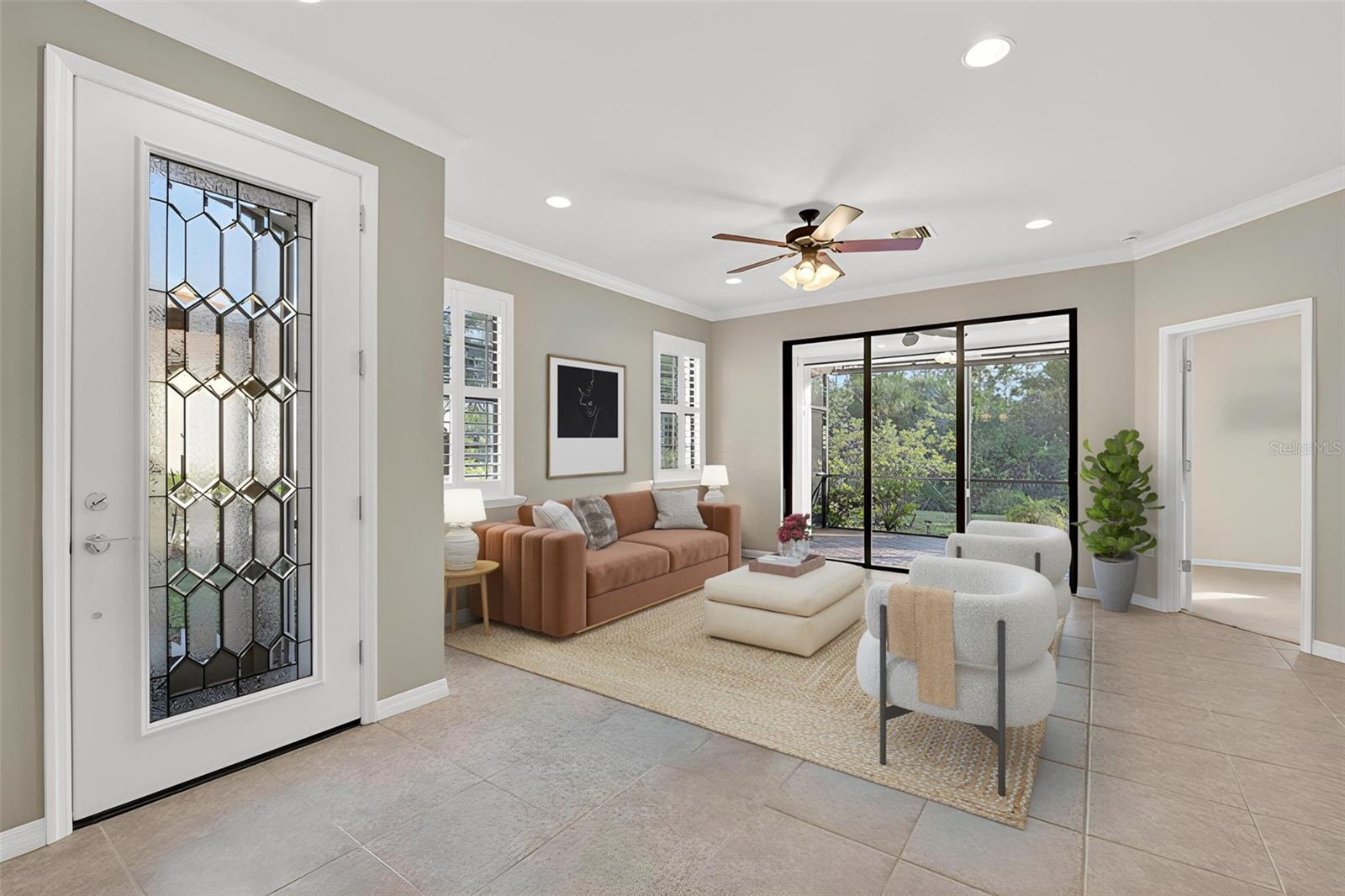 One or more of the pictures have been virtually stage. Welcome to 2860 Arugula Dr. this well-maintained 2-bedroom, 2-bath villa located in the desirable Del Webb Cypress Falls at The Woodlands, a premier 55+ active community in North Port. This spacious 1,363 sq. ft. home offers an open-concept layout with abundant natural light and a comfortable flow throughout. No need to worry about the roof, the entire roof was replaced 4years ago. The upgraded spacious kitchen features granite countertops and ample cabinetry. There is a breakfast bar overlooking the main living area—perfect for everyday living and entertaining. The primary suite includes a large walk-in closet and an ensuite bath plenty of room with a walk-in shower and dual sinks with granite countertops. A split-bedroom floor plan provides added privacy for guests. Speaking of guests, they'll enjoy the ample size bedroom with a built-in closet. Enjoy the extended Florida lifestyle on the home’s expanded screened lanai, offering extra outdoor living space for relaxing or dining year-round. There are remote control Fabric hurricane shutters on the lanai as well as a retractable awning(this item is negotiable on a separate bill of sell) which can shade you from the hot Florida sun. for you peace of mind there is also a remote control Hurricane Shutter for the front door. Enjoy the large 2 car attached garage, and low-maintenance landscaping and sprinkler system managed by the community. Beyond the home, the Cypress Falls community offers a wealth of amenities, including a clubhouse, resort-style pool, resistance pool and hot tub, fitness center, pickleball, tennis, horseshoes, bocce, billiards ensuring an active lifestyle. With a full-time activities director and Manager, there are numerous clubs and events to foster a vibrant community life. Come see this wonderful home and community for yourself. Conveniently located near shopping, dining, golf, and Gulf Coast beaches, this villa combines comfort, convenience, and the vibrant lifestyle this sought-after 55+ community is known for.