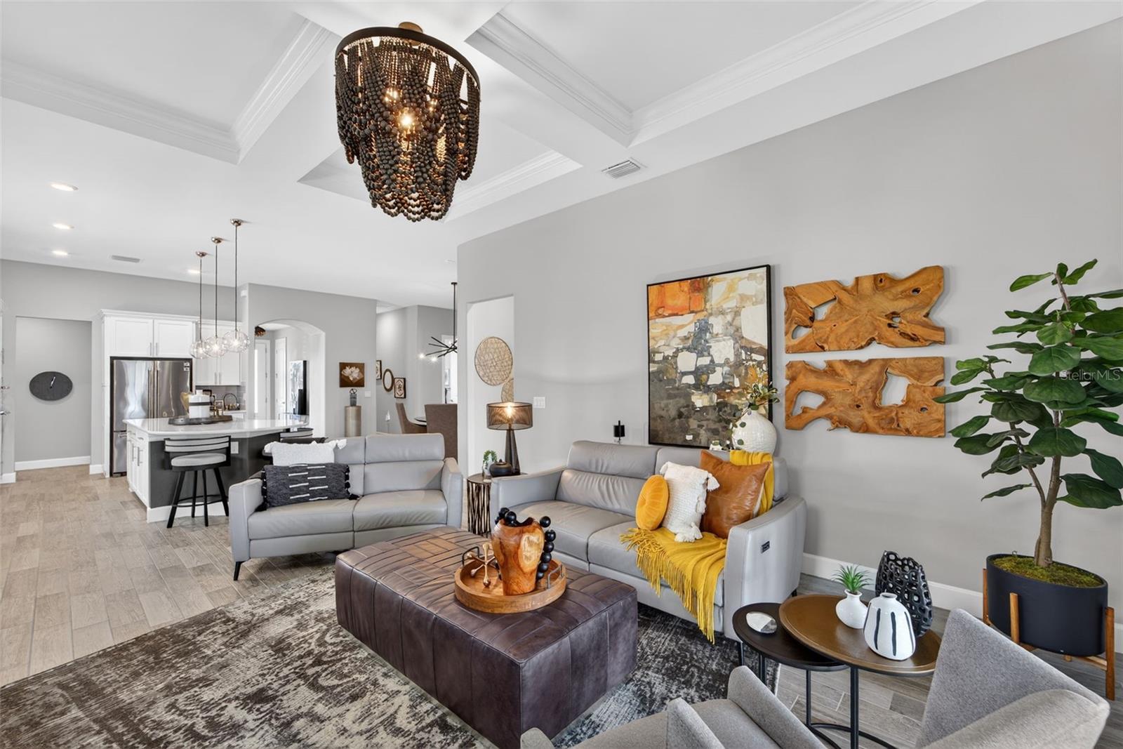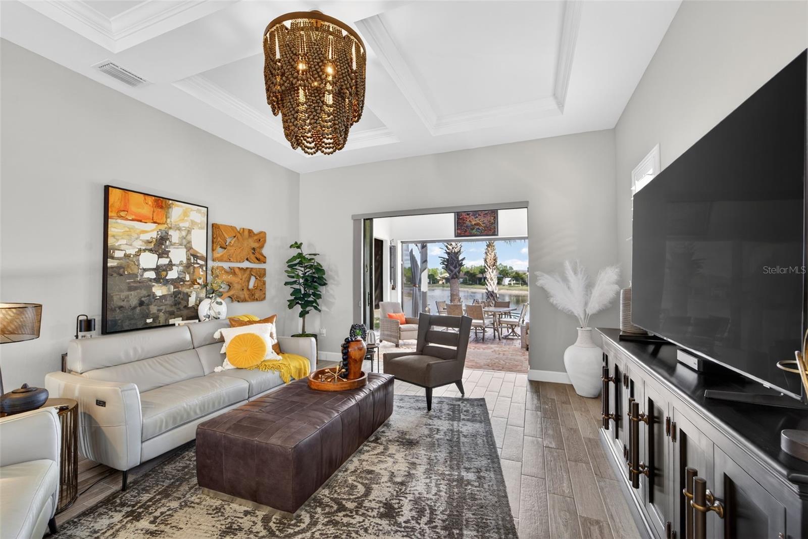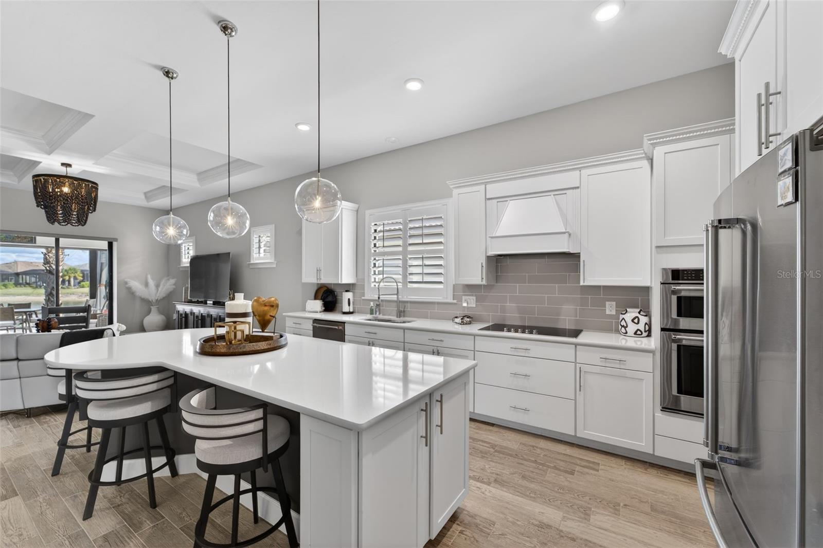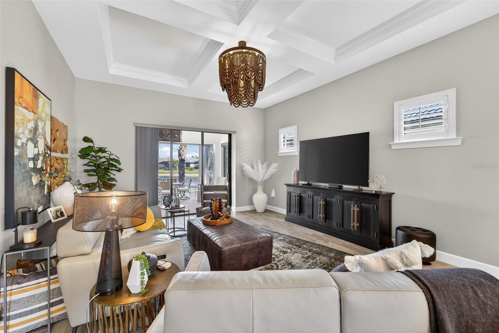 Luxury Living in Cypress Falls at The Woodlands Prepare to be dazzled. From the moment you arrive, the meticulous attention to detail is evident. Expertly manicured landscaping and custom curbing surround the entire property, leading you to a stunning etched-glass custom entry door. A Masterpiece of Design & Light Inside, the foyer opens to a massive, light-filled living space with 10'+ ceilings. The Great Room is anchored by a striking custom coffer ceiling and enhanced by designer custom lighting that sets the tone throughout. Gourmet Kitchen: A chef’s dream featuring sleek quartz countertops, 42" soft-close cabinetry, a custom backsplash, and premium built-in appliances. Butler’s Pantry: This space is second-to-none, featuring matching quartz counters and floor-to-ceiling custom-built cabinetry. Flex Room: A large, versatile room with private doors—ideal for a high-end home office or library. Elegant Accommodations Primary Suite: A secluded retreat featuring a custom-built walk-in closet and a luxury en-suite complete with tall upgraded cabinetry and elegant granite countertops. Guest Wing: Two generous bedrooms served by a stylish bath featuring upgraded tile, tall vanities, and premium granite counters to ensure a five-star experience for your guests. Your Private Oasis Transition seamlessly to outdoor living on the massive extended lanai. The View: Enjoy your morning coffee overlooking the peaceful, serene pond. Premium Protection: Features a 4' undercover extension, an additional sun deck, and electric hurricane shutters for effortless security and peace of mind. The Cypress Falls Lifestyle Beyond the home, discover a vibrant, gated neighborhood designed for an active and social lifestyle: Premier Healthcare: Ideally located near the new Sarasota Memorial Hospital North Port campus, currently under construction, bringing state-of-the-art medical facilities to your doorstep. Social Hub: A full-time activities director, clubhouse, and state-of-the-art fitness center. Recreation: Resort-style pool, hot tub, pickleball, tennis, horseshoes, and bocce courts. Social Calendar: From book clubs to themed social nights, this is more than a home—it’s a community. Luxury Features Premium Finishes: The entire home is finished with premium paints and custom window treatments. Stone Surfaces: Quartz countertops in the kitchen and pantry; Granite in all bathrooms. Architectural Detail: 10'+ ceilings, custom coffer details, and designer lighting fixtures. Custom Storage: Custom-built cabinetry in the pantry and primary walk-in closet.