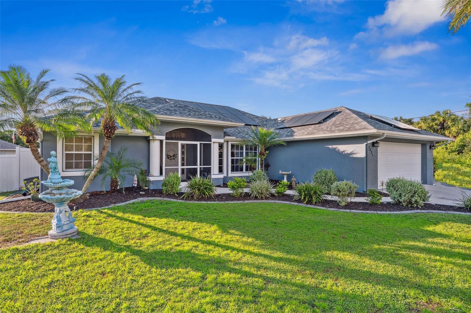 This well-maintained 3-bedroom, 2.5-bath home, built in 2005, offers nearly 2,200 square feet of living space on a spacious 10,694 square foot lot in North Port. The property features a beautiful pool with a 22x10 covered lanai area, perfect for outdoor entertaining. Enjoy easy access to the pool area through 8-foot sliders from the open-concept living space. The home boasts a freshly painted exterior and interior, along with new light fixtures (2024). It comes equipped with new Samsung appliances, including a washer and dryer. Recent upgrades include a new roof (2022), solar panels (2022), and a new AC system (2022), ensuring comfort and energy efficiency. The water heater was replaced in 2021. The screened, tiled entryway adds curb appeal, and hurricane shutters provide peace of mind. The home is wired for a generator or RV hookup and is located in an X flood zone (and D evacuation zone). With its modern amenities and thoughtful updates, this home is move-in ready and ideal for Florida living.