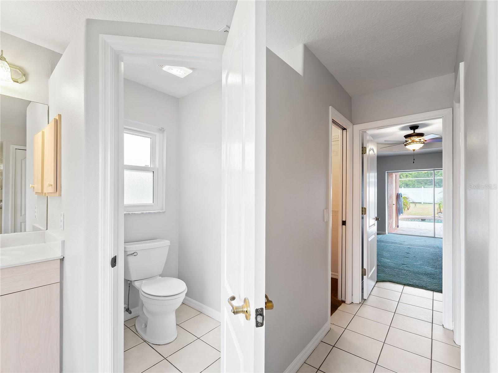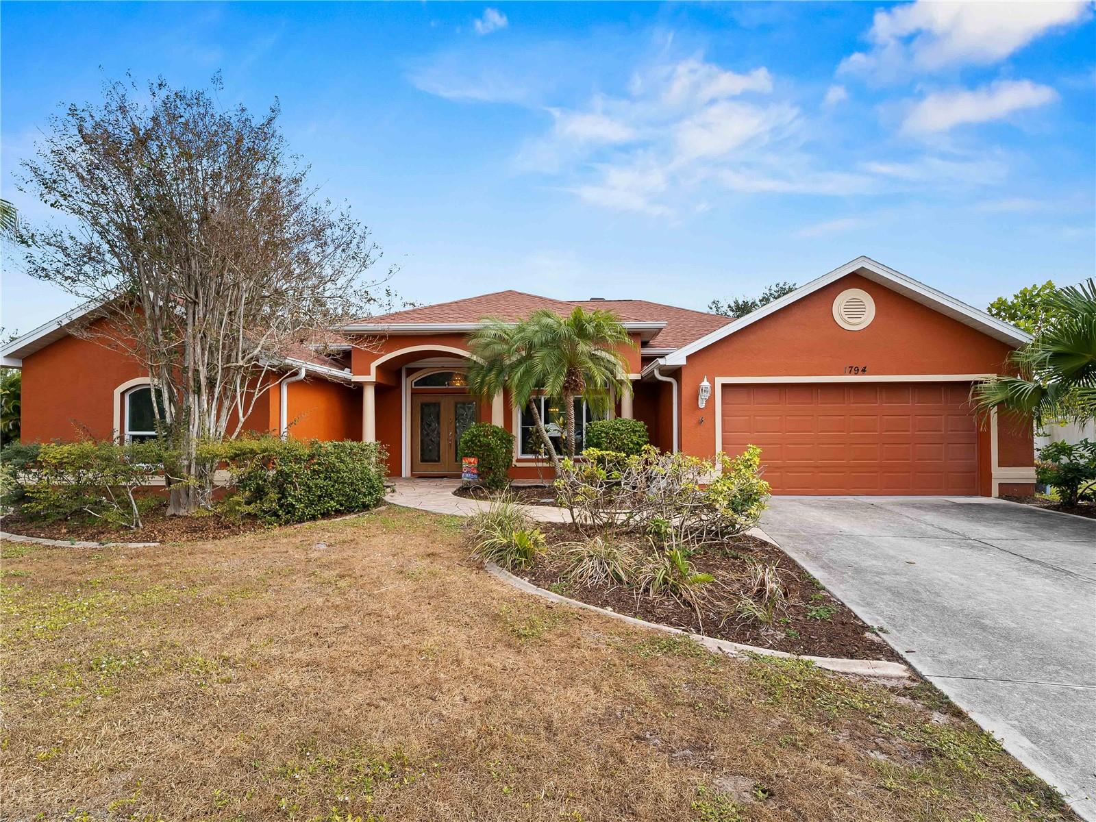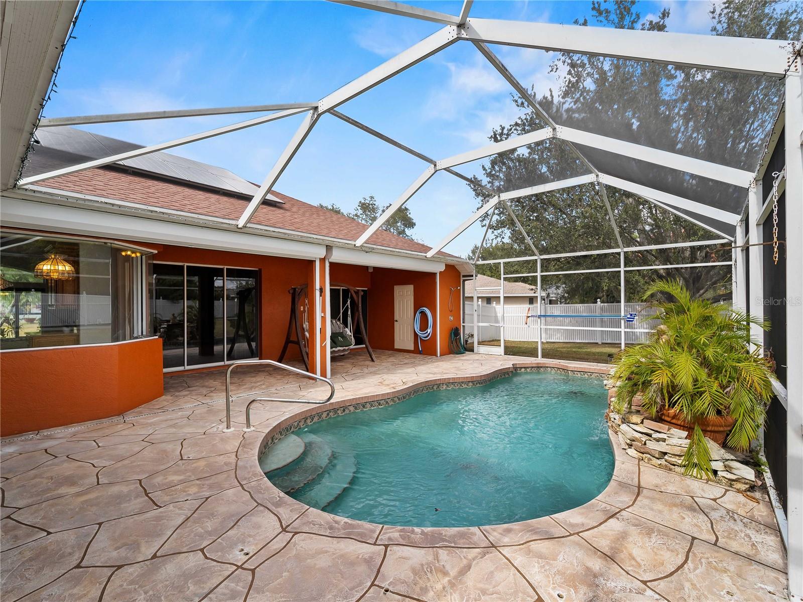 This custom built one owner home will greet you with an extended driveway, fresh new exterior paint and a new roof in 12/2022. Walk through the double glass doors and get the feeling of wonderful spaciousness with soaring cathedral ceilings, crown molding, pocket sliding glass doors opening up to your large covered lanai, beautiful pool with soothing waterfall and privacy fenced back yard. But wait there is so much more to this home! Just inside the front door to your right is your light and bright dining room with built in cabinets. Back to the left is your luxurious master suite with octagonal tray ceiling and double pocket sliding glass doors looking over your lanai and pool. The master bathroom features a jetted tub, walk in shower, dual sinks and water closet, two walk in closets complete the suite. Walk back through the living room and dining area and into your kitchen and family room, The kitchen features custom cabinetry and Cambria quartz countertops, all soft close doors and drawers with pullouts and newer appliances. Two very nice features are the pantry closet and the built in desk area beside the breakfast nook with aquarium window over looking, your wonderful pool and backyard, no neighbors in sight :) The family room features a double octagonal tray ceiling, wood burning fireplace and three pocket sliding glass doors overlooking the pool and is wired for sound. Your guests can have their privacy or you can have your privacy, if you work from home, as the hall door closes to shut out the bathroom, and two bedrooms. One bedroom has a built in desk and shelves perfect for those that work at home. The whole interior has been freshly painted including the garage floor, electric hurricane shutters for the front and lanai areas, the other windows not covered by the shutters are impact as well as roll in for easy cleaning from the inside. Take note that with this custom home you have an additional linen closet in the master bath, guest bath and utility room. The home is powered by solar which will convey with no lien. Backyard shed to store your yard equipment. Easy to see, this could be home.