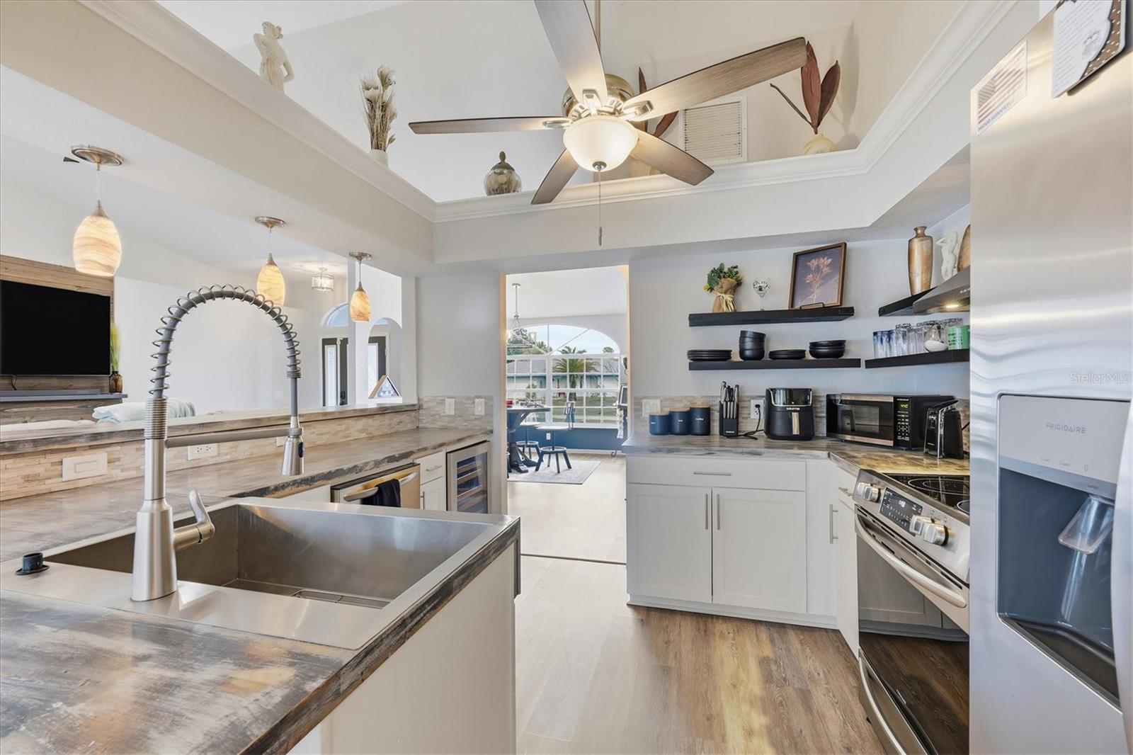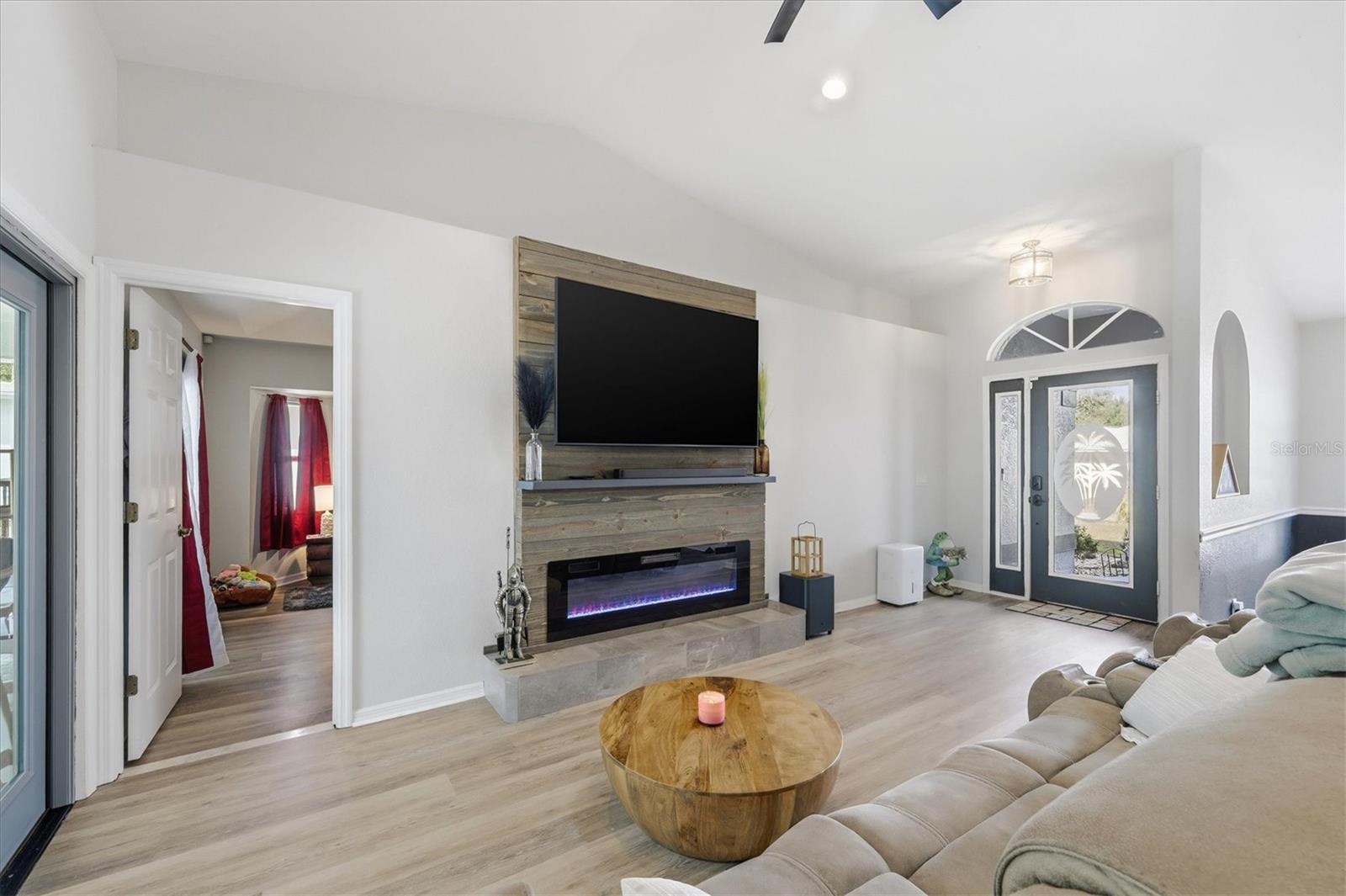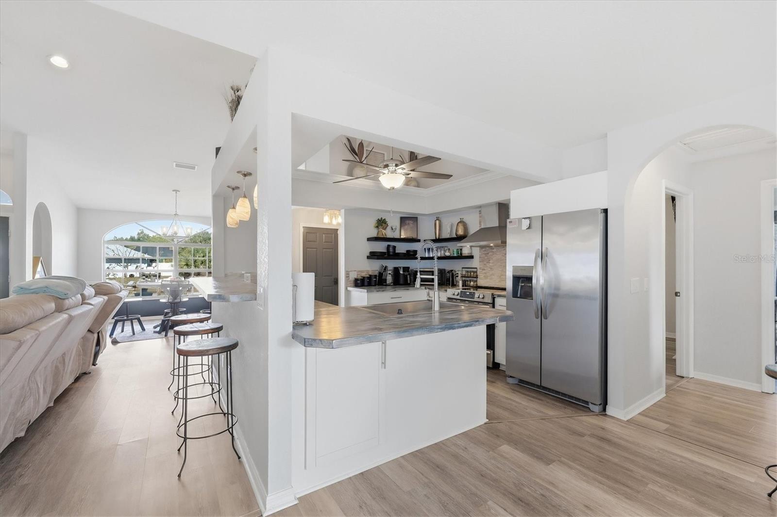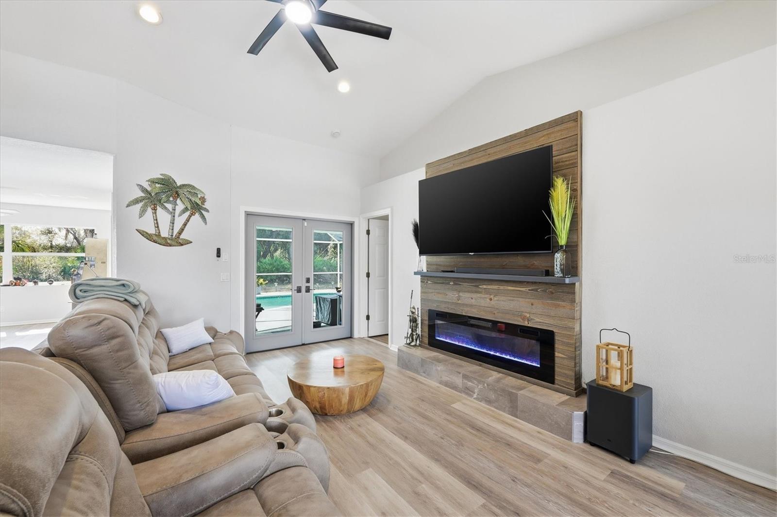 Beautifully remodeled home showcasing exceptional attention to detail throughout. This 3-bedroom, 2-bath residence features an open-concept floor plan with high ceilings and a spacious living and dining room combination. The living area has a custom wall to ceiling electric fireplace; plus a separate family room with built in bar ideal for everyday living and entertaining. The kitchen overlooks the living room and offers a convenient breakfast bar, as well as a kitchenette space overlooking the pool. Custom-painted butcher block countertops, floating shelves, stainless steel appliances, a wine refrigerator, and thoughtful designer touches are sure to grab your attention and please whoever decides to call this place home. The primary suite is a true retreat, complete with a cozy fireplace, French doors that lead out to the lanai overlooking the pool, two walk in closets, barn door entry to the bathroom, soaking tub, walk-in shower, and double vanity. Both bathrooms have been tastefully updated with slate and tile in the shower and quartz countertops. Additional highlights include solar panels, hurricane shutters and lockdown garage system, plus a rainwater softener system. This home has been meticulously maintained by the owner. This is a move-in-ready property that blends comfort, style, and modern upgrades—this home is a must-see! Close to Tamiami Trail (US Hwy 41) I-75 interstate, City Hall, the post office, Cocoplum shopping Plaza, North Port Aquatic Center, soccer fields, and many nearby schools. Come see it today!