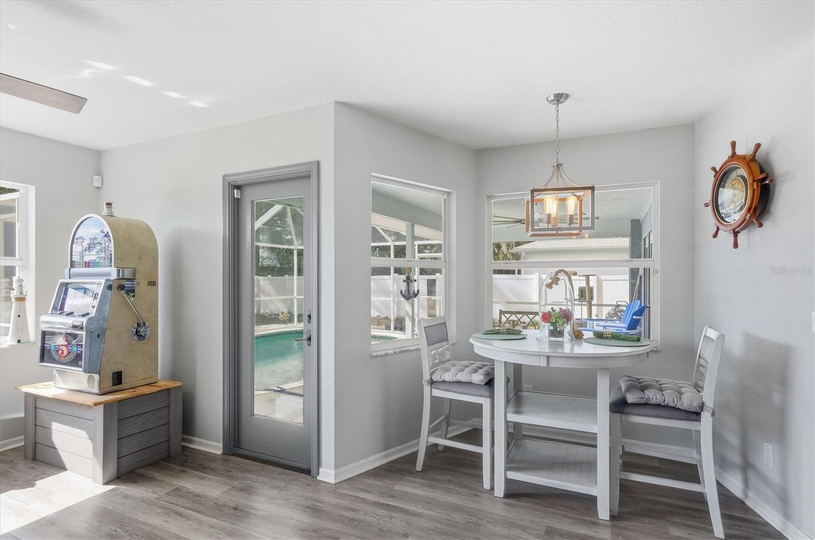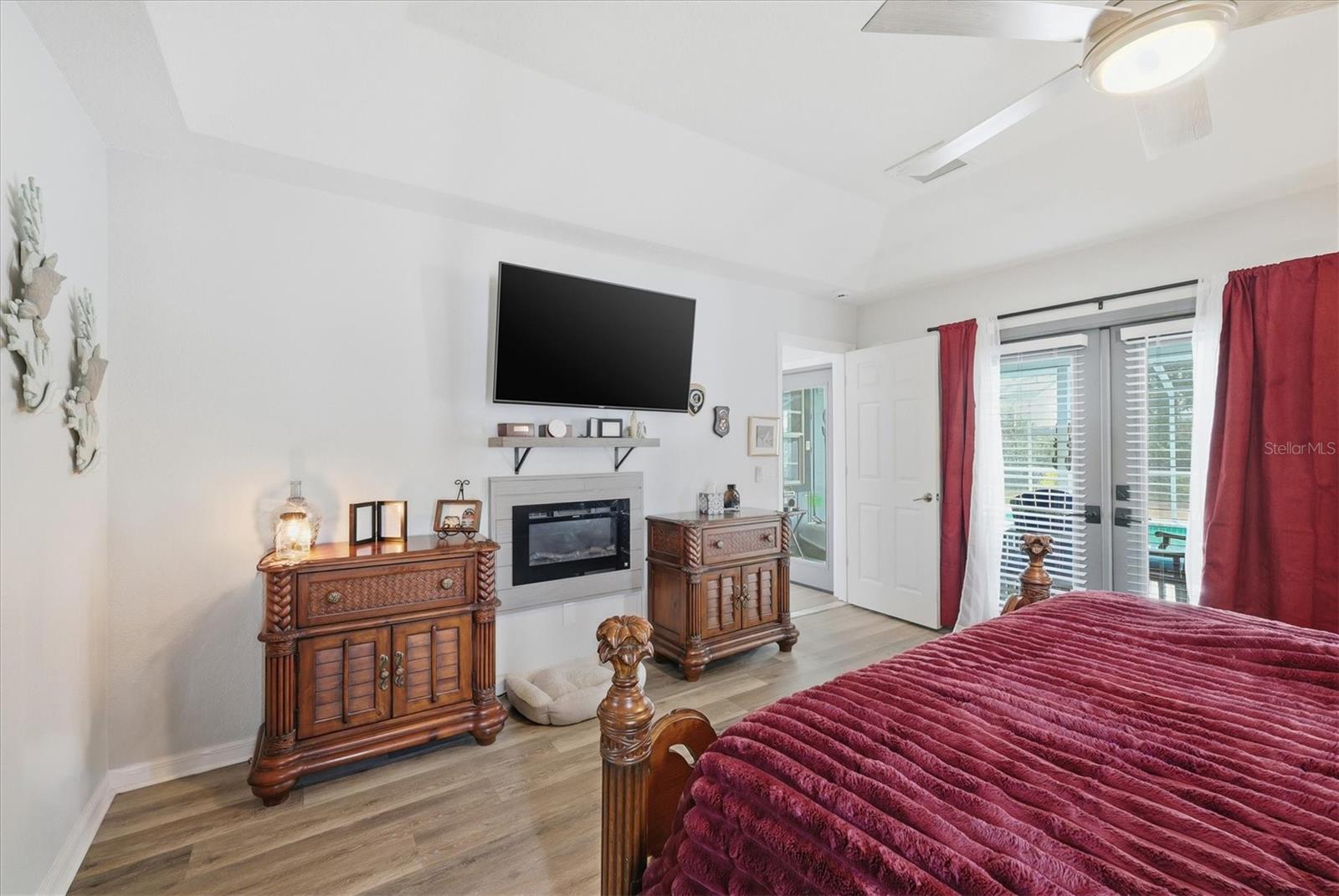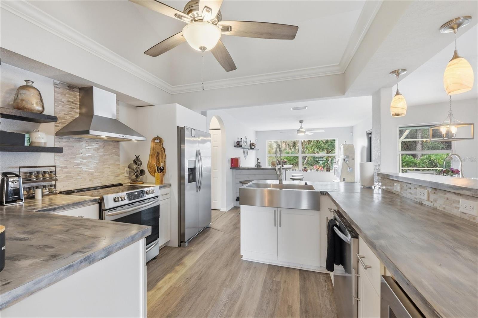 Beautifully remodeled home showcasing exceptional attention to detail throughout. This 3-bedroom, 2-bath residence features an open-concept floor plan with high ceilings and a spacious living and dining room combination. The living area has a custom wall to ceiling electric fireplace; plus a separate family room with built in bar ideal for everyday living and entertaining. The kitchen overlooks the living room and offers a convenient breakfast bar, as well as a kitchenette space overlooking the pool. Custom-painted butcher block countertops, floating shelves, stainless steel appliances, a wine refrigerator, and thoughtful designer touches are sure to grab your attention and please whoever decides to call this place home. The primary suite is a true retreat, complete with a cozy fireplace, French doors that lead out to the lanai overlooking the pool, two walk in closets, barn door entry to the bathroom, soaking tub, walk-in shower, and double vanity. Both bathrooms have been tastefully updated with slate and tile in the shower and quartz countertops. Additional highlights include solar panels, hurricane shutters and lockdown garage system, plus a rainwater softener system. This home has been meticulously maintained by the owner. This is a move-in-ready property that blends comfort, style, and modern upgrades—this home is a must-see! Close to Tamiami Trail (US Hwy 41) I-75 interstate, City Hall, the post office, Cocoplum shopping Plaza, North Port Aquatic Center, soccer fields, and many nearby schools. Come see it today!