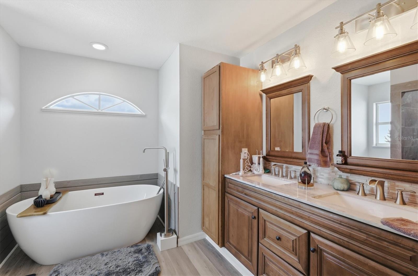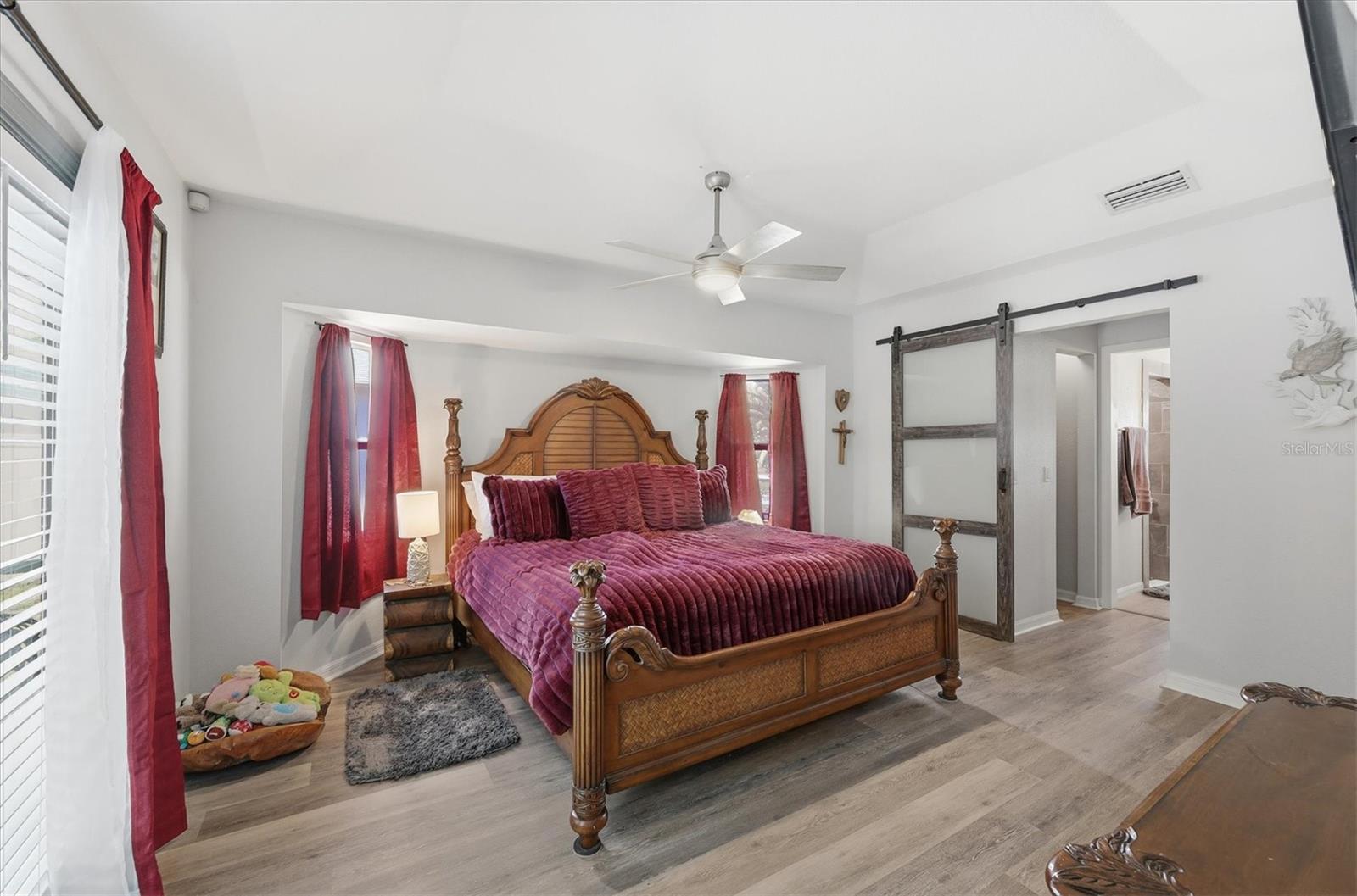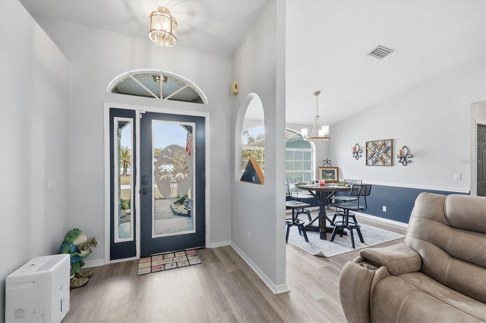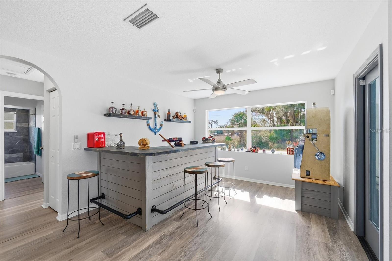 Beautifully remodeled home showcasing exceptional attention to detail throughout. This 3-bedroom, 2-bath residence features an open-concept floor plan with high ceilings and a spacious living and dining room combination. The living area has a custom wall to ceiling electric fireplace; plus a separate family room with built in bar ideal for everyday living and entertaining. The kitchen overlooks the living room and offers a convenient breakfast bar, as well as a kitchenette space overlooking the pool. Custom-painted butcher block countertops, floating shelves, stainless steel appliances, a wine refrigerator, and thoughtful designer touches are sure to grab your attention and please whoever decides to call this place home. The primary suite is a true retreat, complete with a cozy fireplace, French doors that lead out to the lanai overlooking the pool, two walk in closets, barn door entry to the bathroom, soaking tub, walk-in shower, and double vanity. Both bathrooms have been tastefully updated with slate and tile in the shower and quartz countertops. Additional highlights include solar panels, hurricane shutters and lockdown garage system, plus a rainwater softener system. This home has been meticulously maintained by the owner. This is a move-in-ready property that blends comfort, style, and modern upgrades—this home is a must-see! Close to Tamiami Trail (US Hwy 41) I-75 interstate, City Hall, the post office, Cocoplum shopping Plaza, North Port Aquatic Center, soccer fields, and many nearby schools. Come see it today!