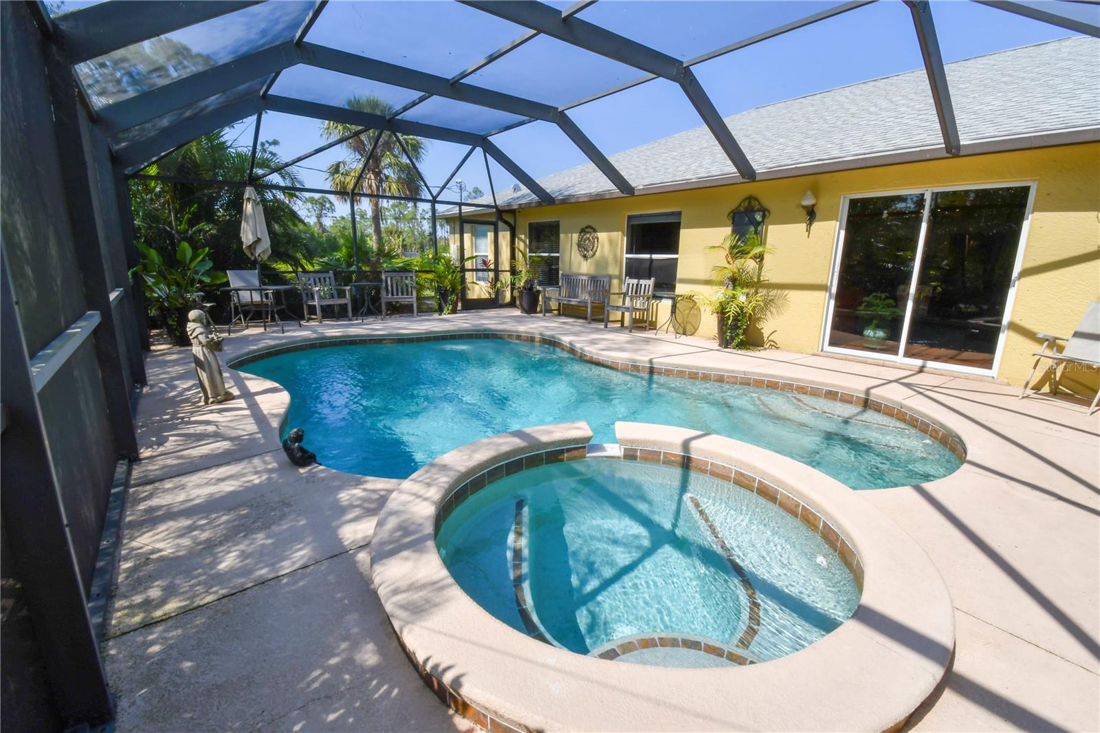 Welcome to your Florida pool home getaway in the heart of North Port! This well-maintained 3-bedroom, 2-bath home sits on a rare double lot on a canal with public water, a 2-car garage, and a spacious layout with formal living, dining, and family rooms. Inside you’ll find vaulted ceilings and hardwood/bamboo strand flooring in the main living areas. The kitchen features Corian countertops, glass tile backsplash, stainless steel appliances (2019), a breakfast bar, and dinette area with built-in pantry shelving. The primary suite offers crown molding, dual closets, and an en-suite bath with walk-in shower and separate soaking tub. The split floor plan provides privacy for the additional bedrooms. Step outside to a screened-in lanai with a saltwater pool and hot tub, perfect for entertaining and relaxing year-round. The canal-side double lot offers extra space, privacy, and easy access for fishing and outdoor enjoyment. A 10x20 shed with loft, electricity, and AC adds valuable storage and workspace. Major upgrades include a 2023 roof, 2023 pool enclosure screens, 2025 Rheem AC with dual UV kits, custom hurricane shutters, Charger Pro water softener, and reverse osmosis drinking water system, and freshly manicured landscaping throughout the property! Conveniently located near I-75, shopping, dining, North Port Aquatic Center, and Charlotte Sports Park, this home offers the perfect mix of space, upgrades, and Florida lifestyle.