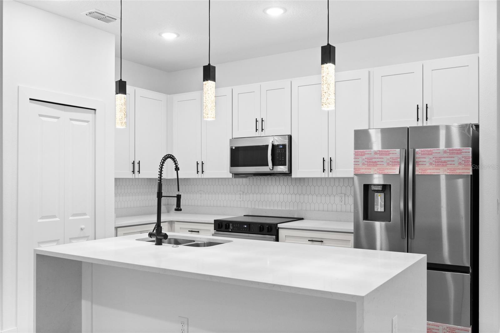 New Construction! Fully completed and Move-in Ready! Lock in a Dream Home today! Brand new concrete block construction in the heart of North Port — no HOA, no CDD, and no flood zone (X). This beautifully crafted 4-bedroom, 3-bathroom home offers an elegant open floor plan with a epoxy finished two-car garage, and premium finishes throughout. The gourmet kitchen features a large center island with waterfall-edge quartz countertops on both sides, soft-close cabinetry, stainless steel Samsung appliances — ideal for entertaining and everyday living. Luxury vinyl plank flooring flows throughout the home, offering style and durability. The spacious primary suite includes his-and-hers walk-in closets and a bathroom with dual sinks and a glass-enclosed walk-in shower. A secondary bedroom includes a private en-suite bath, and a walk-in closet perfect for guests or multi-generational living. All bedrooms with blinds and modern celling fans. Additional features include impact-resistant windows and doors, a smart thermostat, upgraded lighting, a water filtration system, and garage doors with glass panels that allow natural light in. Enjoy Florida living year-round on the covered lanai with a nicely sized backyard and extended paver driveway. Easy access to I-75, commuting to Sarasota, Fort Myers, and top-rated Gulf Coast beaches like Siesta Key and Venice Beach. An excellent opportunity for homeowners and investors alike! Schedule your private showing today!