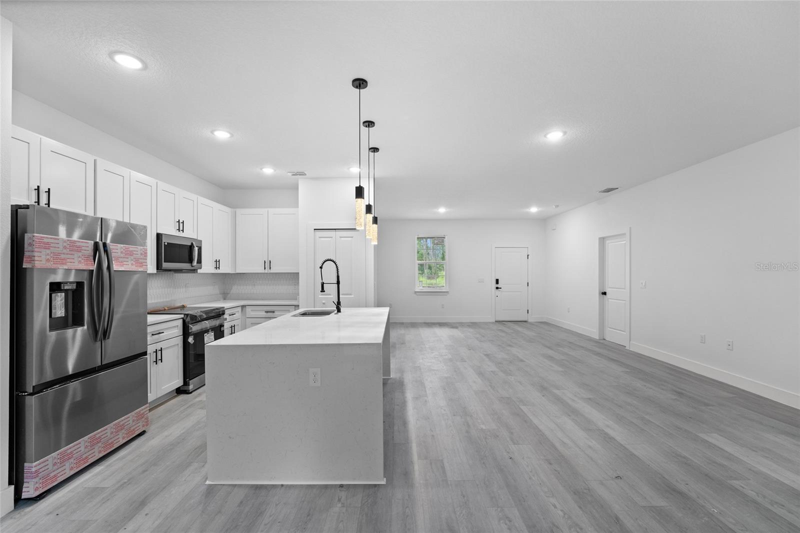 New Construction! Fully completed and Move-in Ready! Don't miss this opportunity! Brand new concrete block construction in the heart of North Port — no HOA, no CDD, and no flood zone (X). This beautifully crafted 4-bedroom, 3-bathroom home offers an elegant open floor plan with a epoxy finished two-car garage, and premium finishes throughout. The gourmet kitchen features a large center island with waterfall-edge quartz countertops on both sides, soft-close cabinetry, stainless steel Samsung appliances — ideal for entertaining and everyday living. Luxury vinyl plank flooring flows throughout the home, offering style and durability. The spacious primary suite includes his-and-hers walk-in closets and a bathroom with dual sinks and a glass-enclosed walk-in shower. A secondary bedroom includes a private en-suite bath, and a walk-in closet perfect for guests or multi-generational living. All bedrooms with blinds and modern celling fans. Additional features include impact-resistant windows and doors, a smart thermostat, upgraded lighting, a water filtration system, and garage doors with glass panels that allow natural light in. Enjoy Florida living year-round on the covered lanai with a nicely sized backyard and extended paver driveway. Easy access to I-75, commuting to Sarasota, Fort Myers, and top-rated Gulf Coast beaches like Siesta Key and Venice Beach. An excellent opportunity for homeowners and investors alike! Schedule your private showing today!
