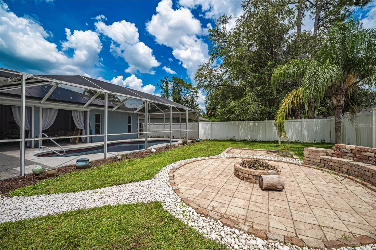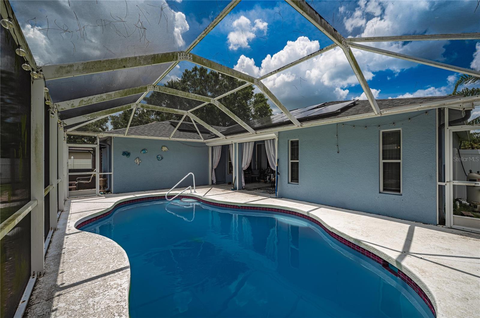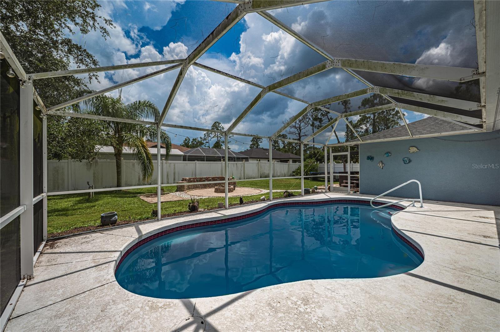 This beautifully maintained 3-bedroom, 2-bathroom pool home has the blend of comfort, style, and outdoor living. Located in a quiet North Port neighborhood this move-in ready home sits on a spacious lot with a beautiful pool and backyard—fully fenced and for relaxing or entertaining year-round. Step inside to an open-concept layout with vaulted ceilings, tile flooring throughout, and tons of natural light. The kitchen features solid wood cabinetry, ample counter space, and a breakfast bar that opens to the main living area. The split floor plan has a private primary suite with a walk-in closet and en-suite bath, while two additional bedrooms share a full bath on the opposite side of the home. Conveniently located near schools, parks, shopping, dining.