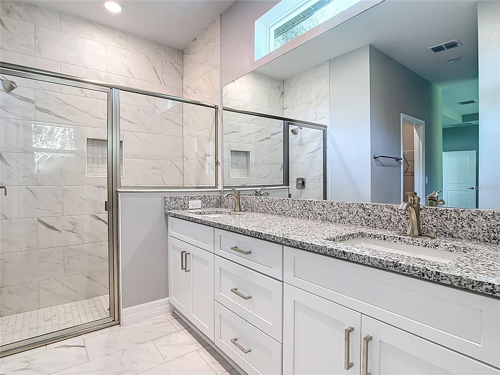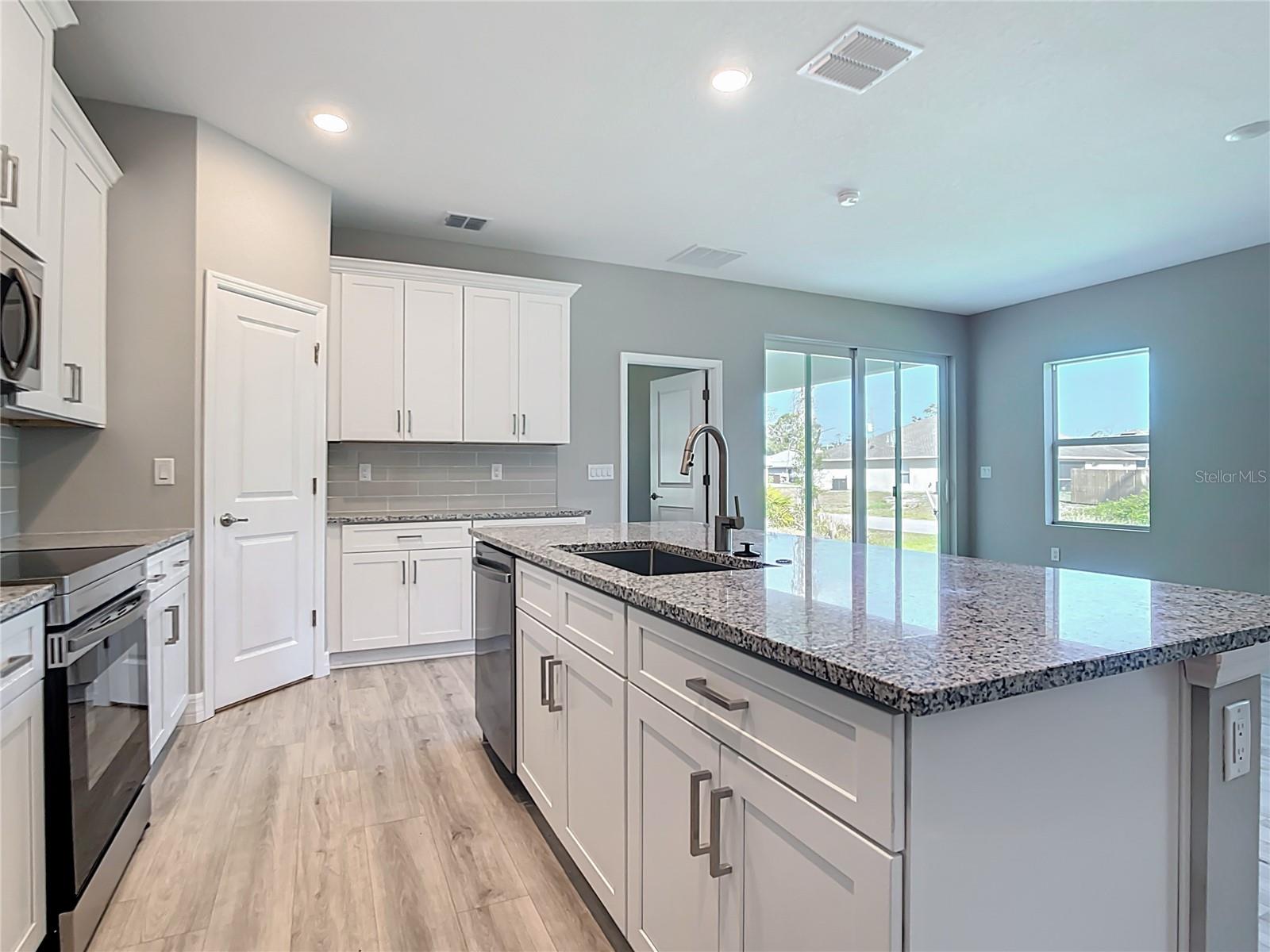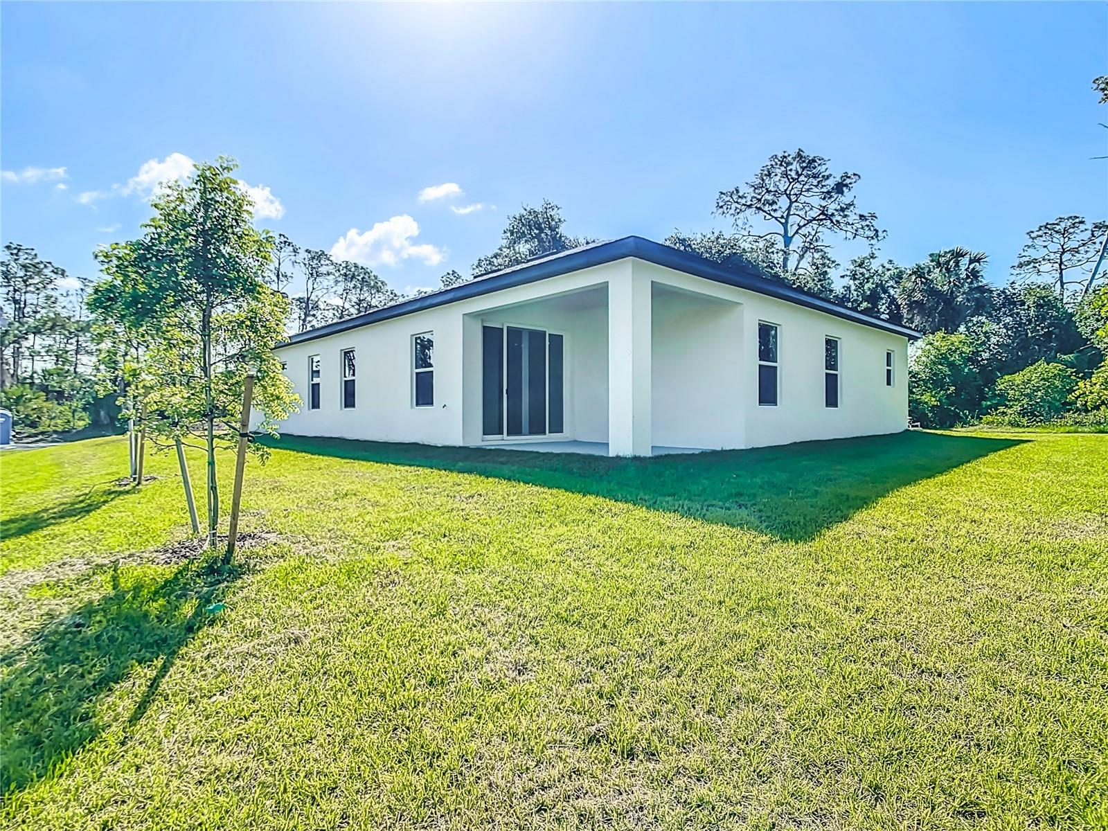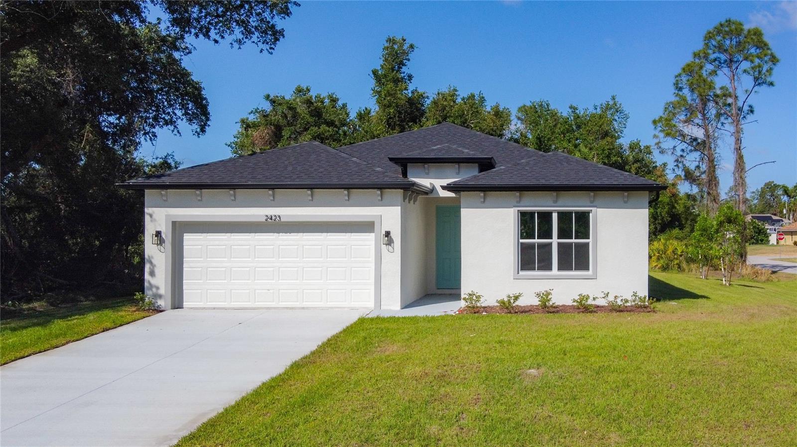 MUST SEE - NEW CONSTRUCTION - Completed, move-in ready, corner lot! This concrete block 4-bedroom 3-bathroom 2 car garage home boast a modern design with high ceilings and features an open spacious floorplan design. With an awesome gourmet-inspired kitchen that features white cabinets with a large center island and subway backsplash and upgrades that include Stainless-steel Samsung appliance package with washer and dryer. Luxury wood-vinyl flooring throughout the common areas. A spacious master bedroom with tray ceilings, two walk-in closets, a private bathroom with dual vanity area, and large open walk-in shower. Front bedroom with bathroom is perfect for a guest room, mother in-law suite, or office. Home also features indoor laundry room connecting the attached garage, water softener, double pane windows, and sliding glass door that lead out to the open lanai. This brand new home is a must see!