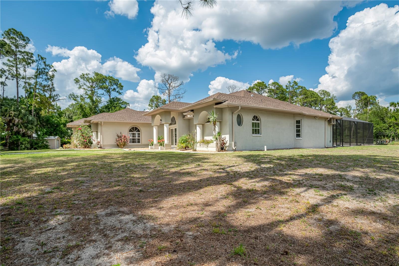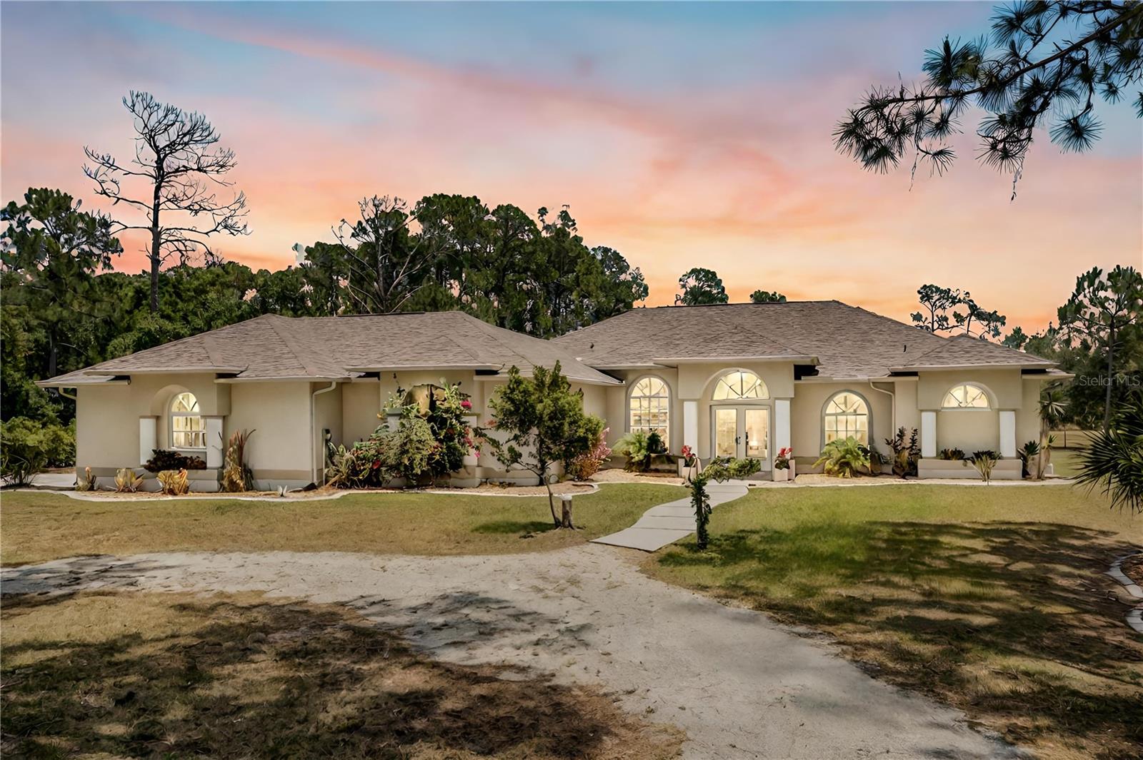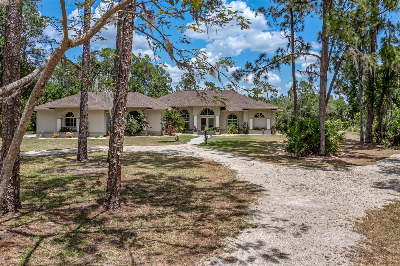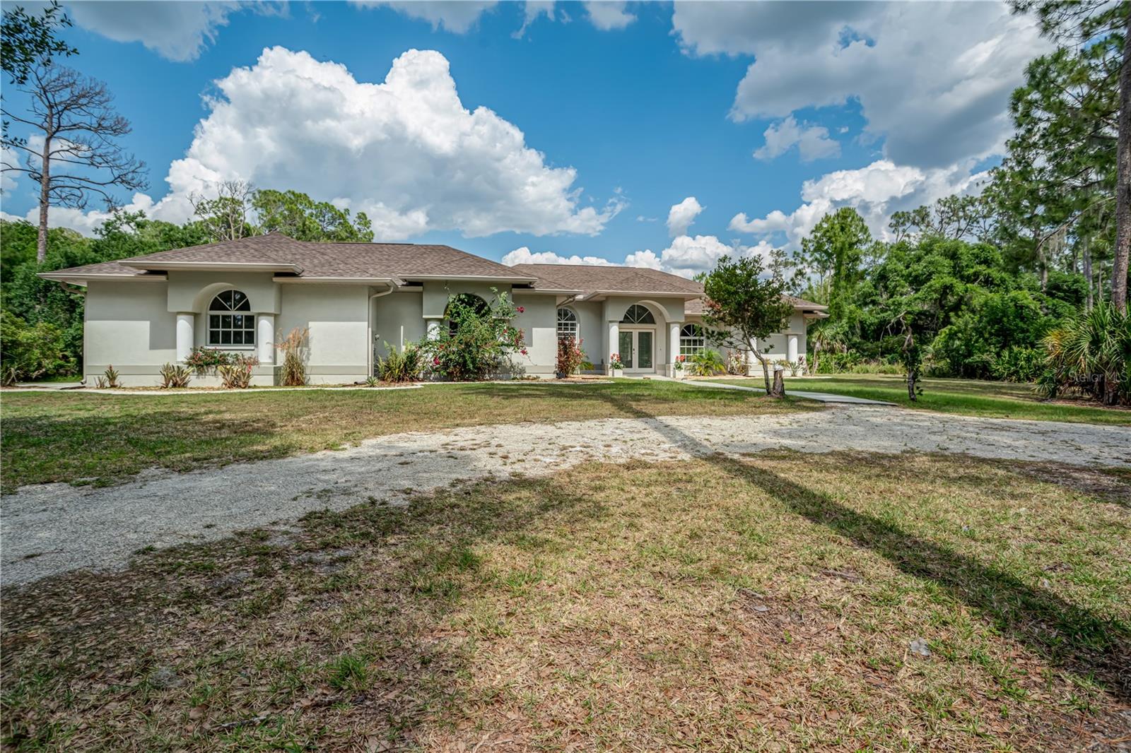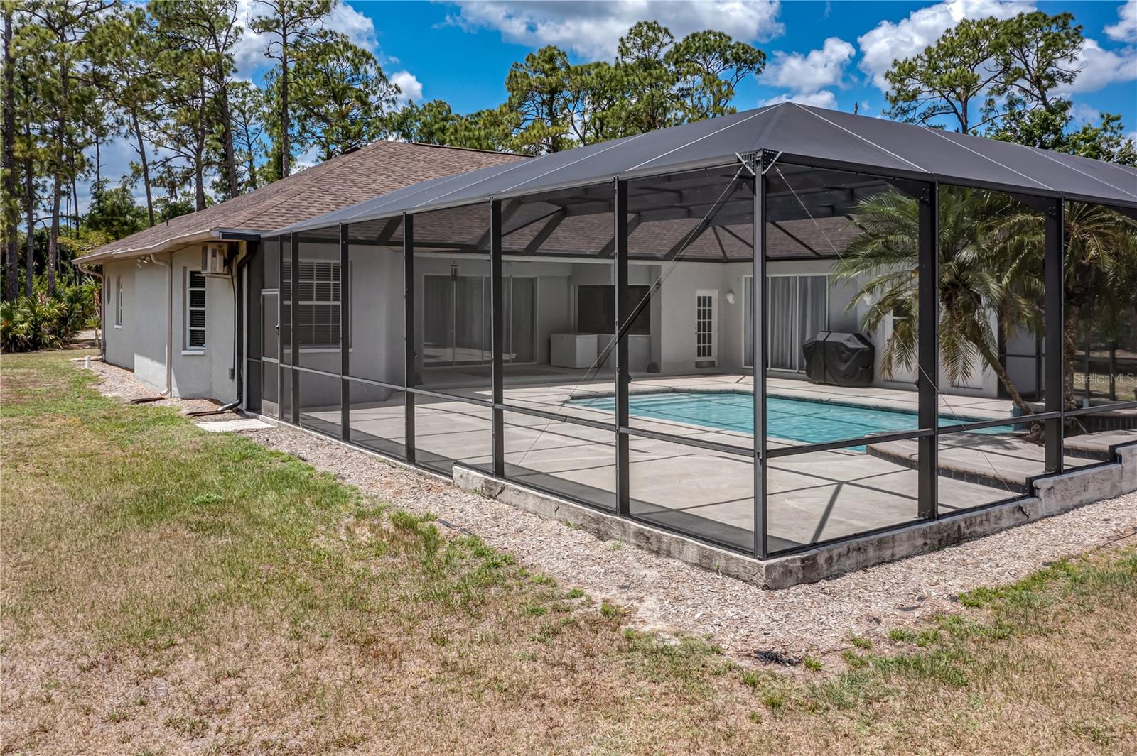 One or more photo(s) has been virtually staged. Envision Luxurious Estate Living in North Port Estates! Unlock the door to elegant living with this sprawling 4-bedroom, 2.5-bath estate, set on over 3 gated acres of serene landscapes. The grandeur begins at the double door entry, framing a stunning view of the expansive resort-style pool complete with a cascading waterfall and newly screened enclosure. NEW ROOF 2023! As you step inside, the opulent details capture your eye, from the 14' double tray ceilings with crown molding in the living room to the gleaming tiled floors stretching throughout. The updated kitchen is a chef’s paradise, featuring custom cabinetry with sparkling jeweled pulls, a grand island, and granite countertops. Top-of-the-line GE appliances and a stylish farmhouse sink add both function and flair. The breakfast nook, with its unique aquarium window, is a perfect spot for morning coffee. The family room, seamlessly connected to the kitchen, provides a relaxing retreat with direct access to the pool. The office/den, conveniently linked to the master suite, offers French doors and elegant chair rail details. The master suite itself is a private haven with a tray ceiling, efficient mini split A/C, and dual walk-in closets, leading to a luxurious bath with a Roman shower and garden tub. Entertainment is effortless in the versatile game room/man cave, ideal for hosting or relaxing. Additional features enhancing this home’s allure include hideaway ceiling fans, dazzling crystal chandeliers, and an outdoor shower for ultimate convenience. The estate is not just about the indoors; the outdoor area is divided by a livestock fence, featuring a tranquil pond and vast spaces ideal for additional outbuildings or horse stalls. With a three-car garage equipped with electric retractable screens and ample storage, this home is as practical as it is stunning. Embrace the possibility of this majestic estate, where every detail adds to an atmosphere of unmatched luxury and comfort.