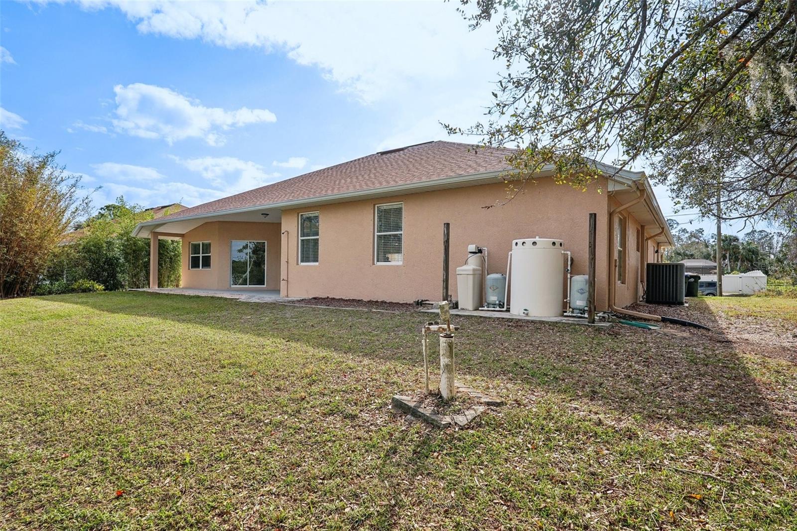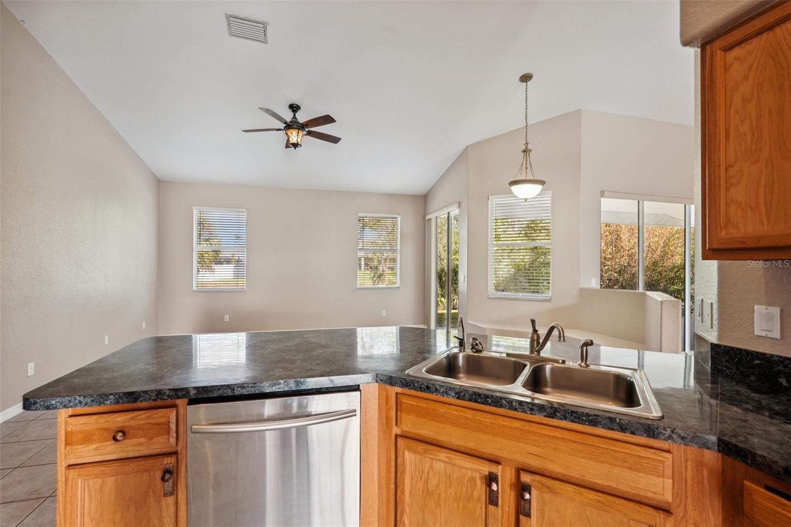 One or more photo(s) has been virtually staged. This stunning 3-bedroom + den home with a new roof in 2022, offers a bright and airy split-bedroom layout with soaring cathedral ceilings and three sliding doors leading to a private backyard retreat. Designed for both comfort and style, it features a spacious living room, dining room, family room, and a versatile office/den. Step into the inviting tiled living area and immediately feel the open, sunlit atmosphere with seamless access to the back patio. The well-appointed kitchen boasts a breakfast bar, pantry, ample cabinet and counter space, and a cozy dinette area overlooking the living and family rooms. The dining room sets the perfect scene for hosting memorable gatherings. The luxurious primary suite features a tray ceiling with a fan, wood laminate flooring, dual closets (including a walk-in), and private patio access. The spa-like en-suite includes a dual vanity, soaking tub, and an elegant walk-in Roman shower. Guests will love the two additional bedrooms and a full bath, while the dedicated office/den with French doors offers the perfect work-from-home space. A well-equipped laundry room with built-in storage keeps everything organized. Outside, the expansive patio invites you to relax and enjoy peaceful canal and woodland views. Recent upgrades include a 30-year roof (2022) and a new pool electric sub-panel. Built by RJM Builders, this high-end custom home also includes a 2-car garage with extra storage. Nestled in the thriving community of North Port, Florida—one of the best places to live—you’ll enjoy proximity to pristine beaches, top-tier dining and shopping, entertainment, and easy access to I-75 and US-41. This home truly has it all!