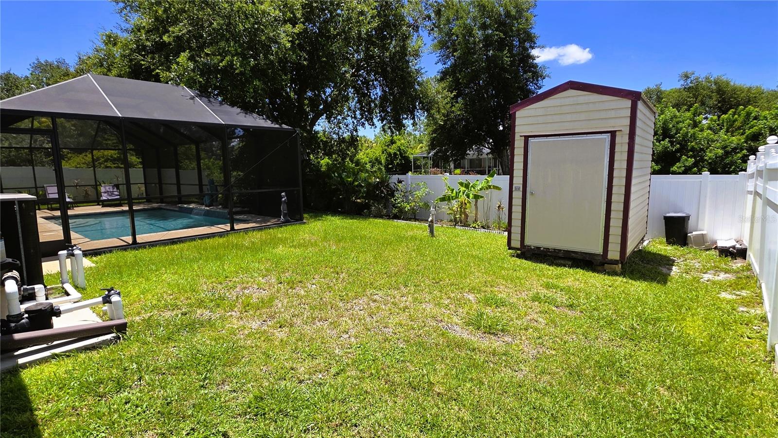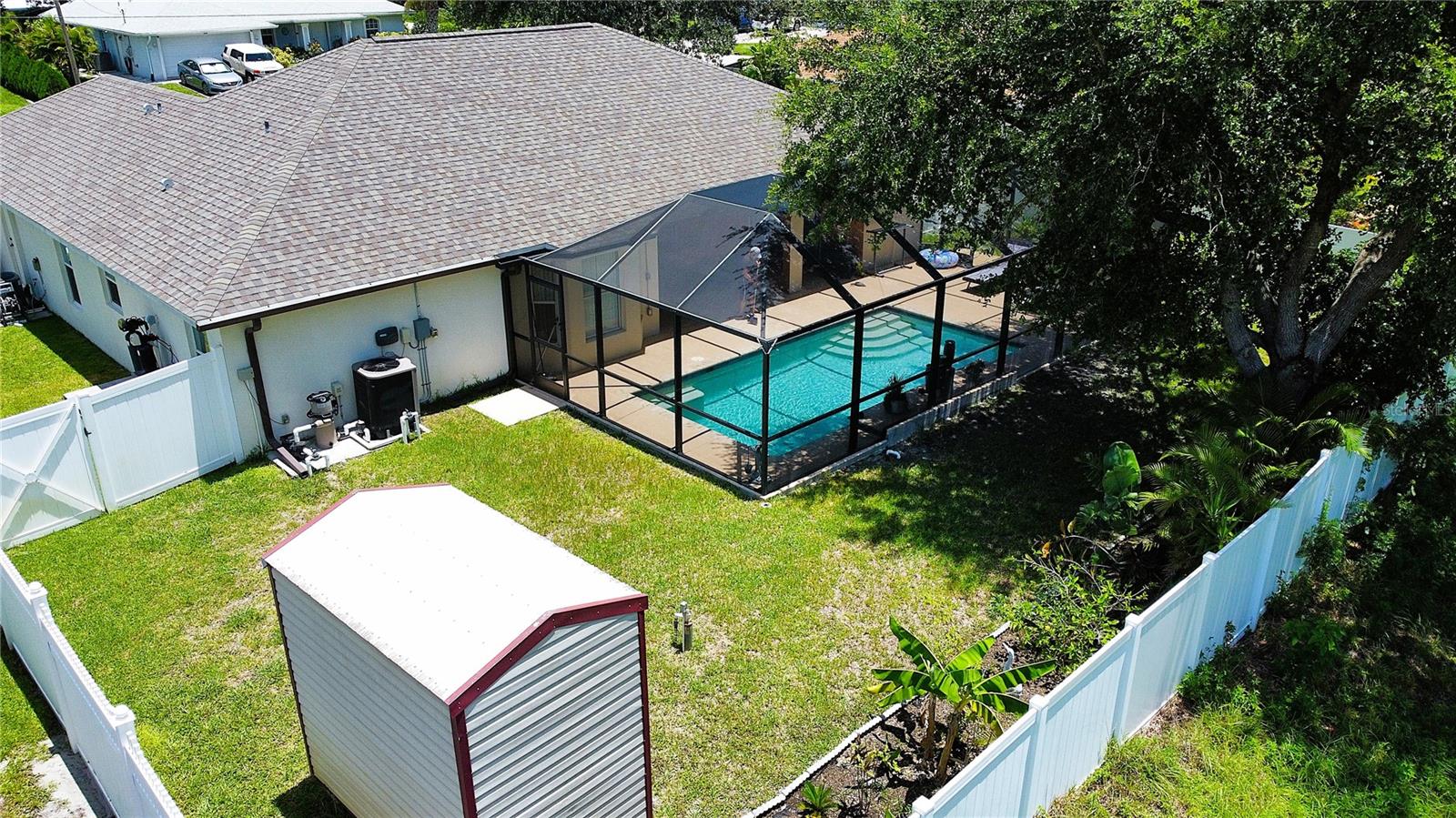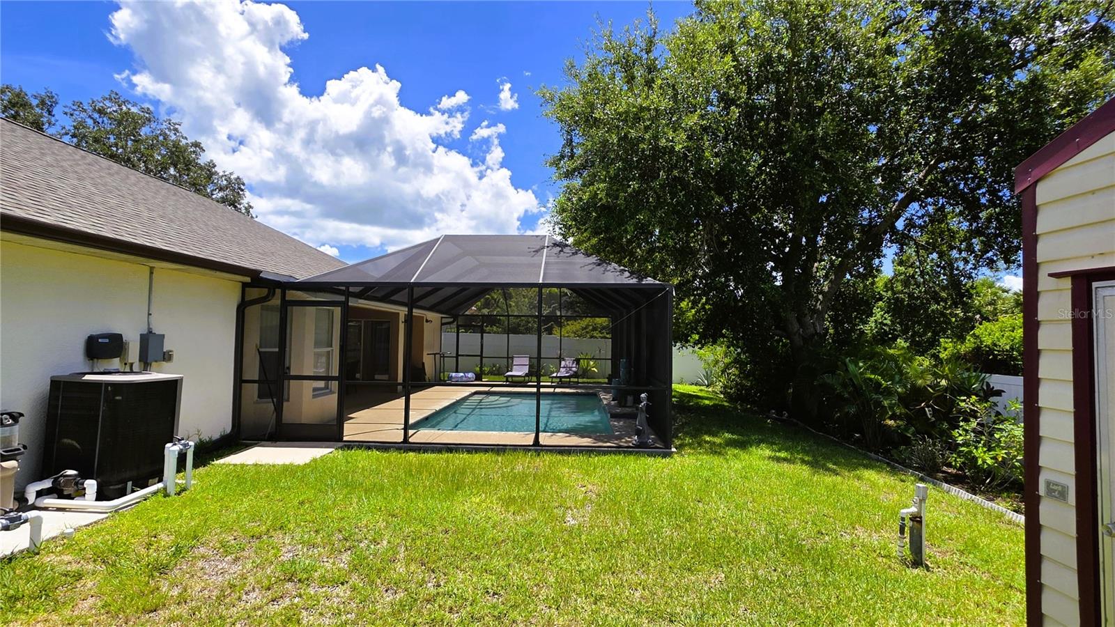 NEW PRICE TO SELL! Upon entry you will notice the spacious great room, formal dining and cathedral ceilings. The kitchen boasts premium appliances, tons of cabinet space, closet pantry and a large breakfast nook. Master bathroom has walk in shower, large soaking bathtub and dual sinks!! Family/guests will enjoy privacy in this split floor plan, 2 OVERSIZED guest bedrooms features EXTRA LARGE CLOSET SPACE!! Dual sliding glass doors lead you out to the large screen enclosed lanai with large SALTWATER HEATED POOL (new in 2021) . Roof shingle replaced in 2022. The expansive yard features PRIVACY FENCE, TREES, STORAGE SHED and plenty of room for a POOL. Lets not forget the magnificent Oak Tree!! FULL ASKING PRICE INCLUDE ALL FURNITURE AND ACCESSORIES AS SEEN ON LISTING PICTURES. HOUSE READY FOR MOVE IN.