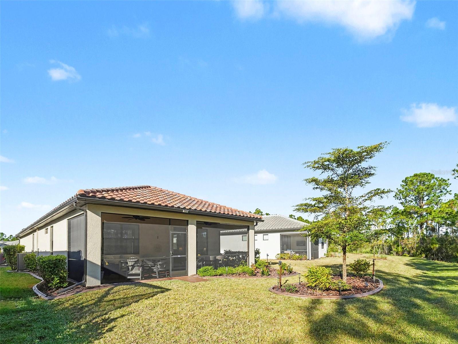 This bright and inviting home is a must-see, offering tranquil views of a serene wooded preserve from the large covered rear lanai and a peaceful pond view from the front. Located at 1344 Raspberry Drive in North Port, Florida, this beautifully upgraded residence combines comfort, style, and resort-style living. The kitchen is a standout, featuring quartz countertops, a tiled backsplash, upgraded white 42" cabinets with crown molding, upgraded stainless steel appliances, and a JennAir refrigerator. The spacious primary suite includes a walk-in closet and a spa-like bath with quartz counters and a floor-to-ceiling tiled shower. The guest bathroom features a tub with tile extending to the ceiling. The second bedroom offers exceptional flexibility with a Murphy bed and built-in storage, making it ideal for guests, hobbies, or crafts. An added flex room with French doors is generously sized to accommodate a queen bed or serve as a den or home office. Notable upgrades include Hurricane Blocker roof vent protection, Hunter Douglas blinds, ceiling fans, landscape curbing, and a sealed driveway and lanai. The extended 4-foot garage (20x24) features epoxy flooring, a screen garage door, and overhead storage racks. No flood insurance is required—this home sits 27 feet above sea level in the highly desirable 55+ Del Webb community. Residents enjoy resort-style amenities including pools, fitness center, pickleball, bocce, craft rooms, and a full calendar of social activities. HOA includes amenities, lawn care, trash pickup, basic cable & internet. Turn key home, golf cart is negotiable —this is Florida living at its best.