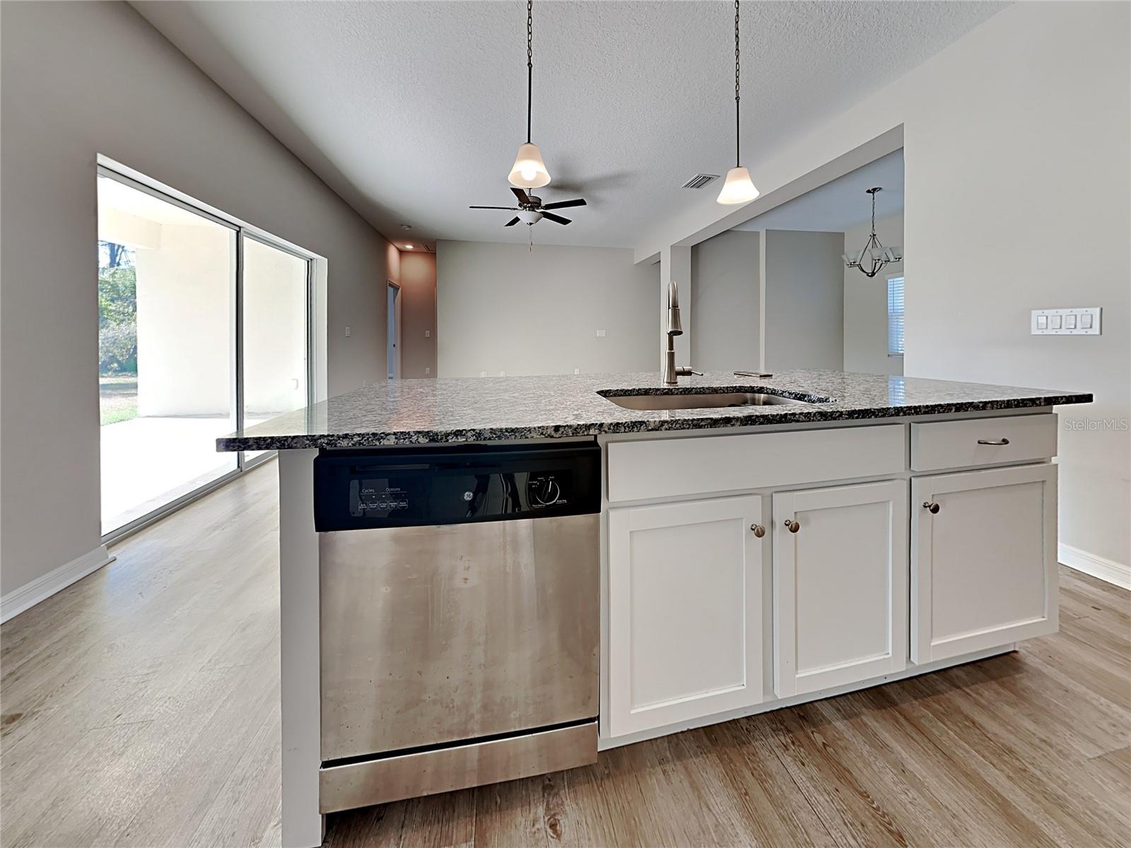 Welcome to this beautiful 3-bedroom, 2-bath home with 1,548 square feet, built in 2020 and designed for comfortable modern living. This home features a spacious open floor plan with luxury vinyl flooring throughout the main living areas and carpet in the bedrooms, creating a perfect blend of style and comfort. The kitchen is well-appointed with recessed lighting, stainless steel appliances, granite countertops, a pantry, and an island with barstool seating overlooking both the living room and separate dining area — ideal for entertaining and everyday living. Sliding glass doors lead to a covered lanai where you can relax and enjoy serene wooded views. The primary bedroom is generously sized and includes a walk-in closet and an ensuite bathroom featuring a tiled walk-in shower, granite countertop, and dual vanity sinks. The secondary bedrooms are also spacious and provide flexibility for guests, family, or a home office. Not located in a flood zone and with no HOA dues or CDD fees, this home offers both peace of mind and affordability. Schedule your private tour today and make this beautiful home yours.