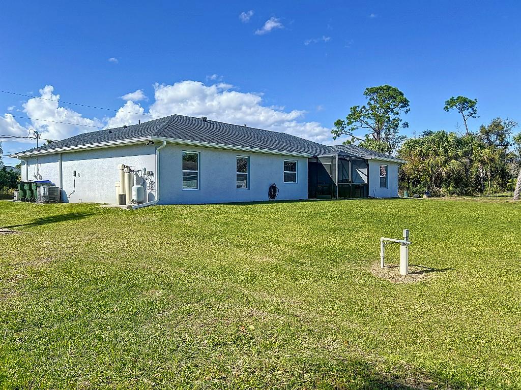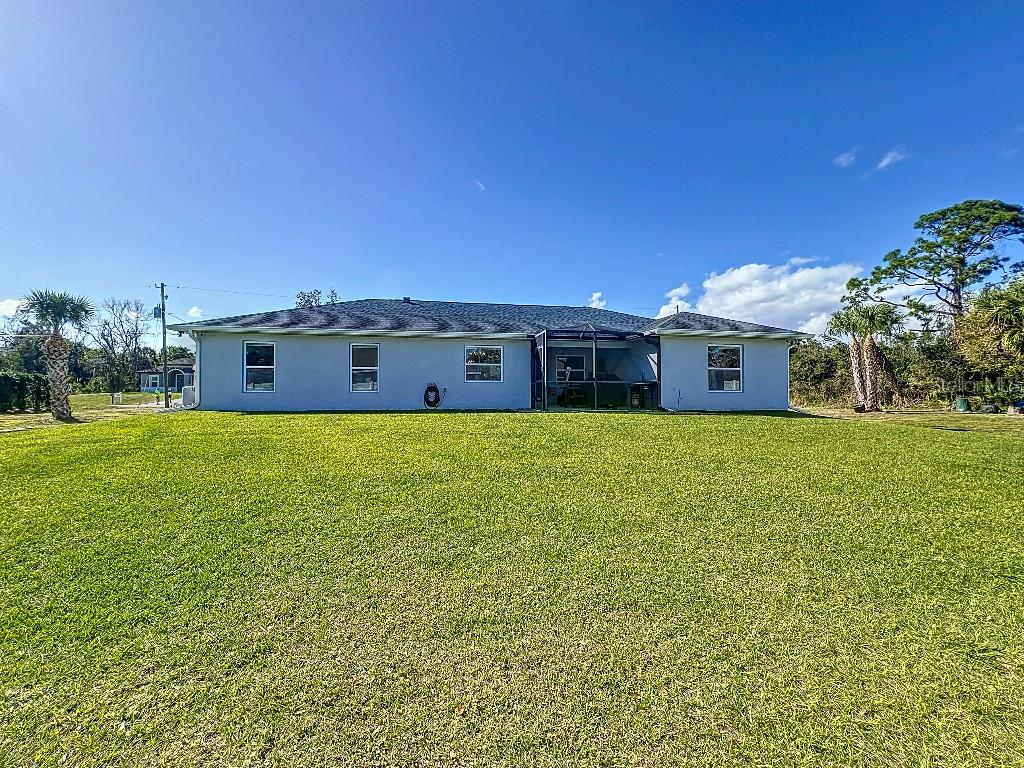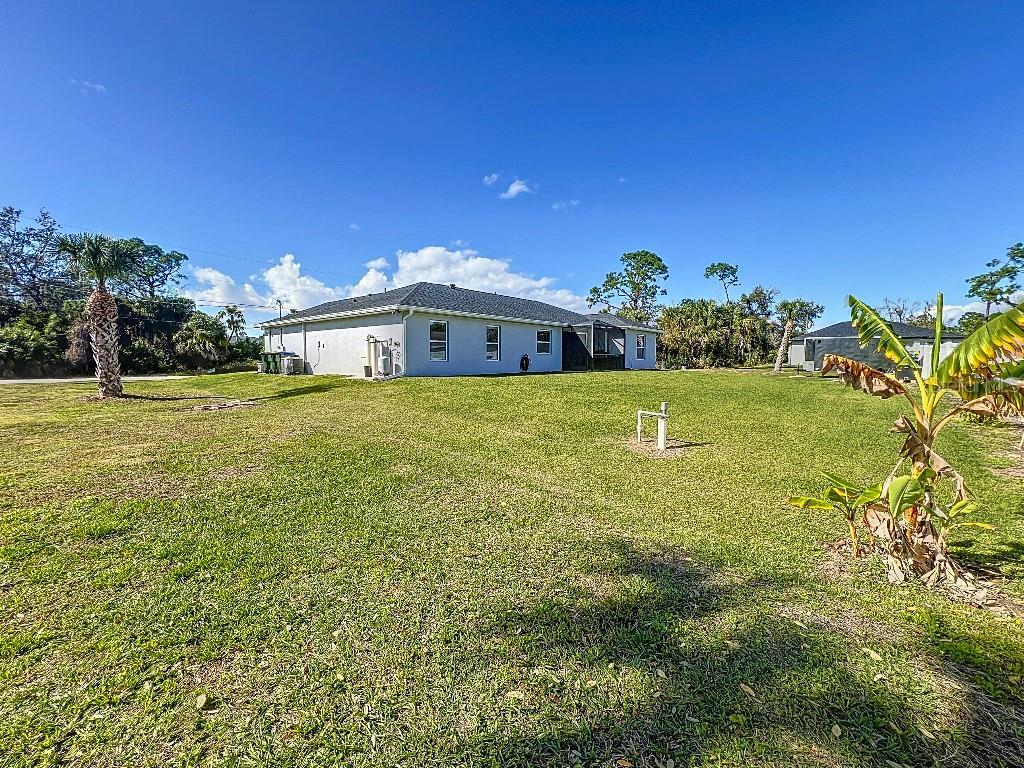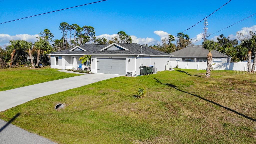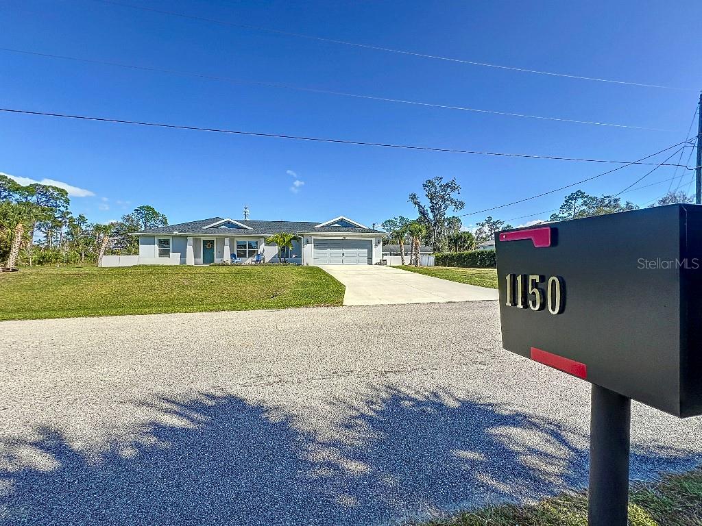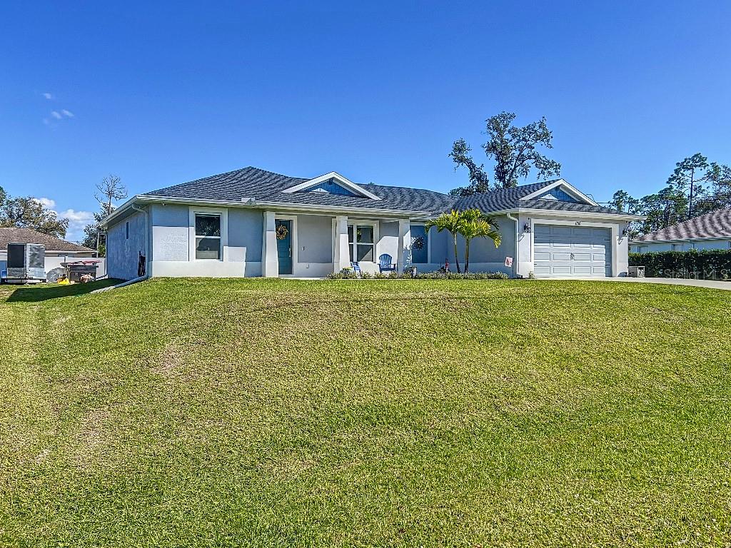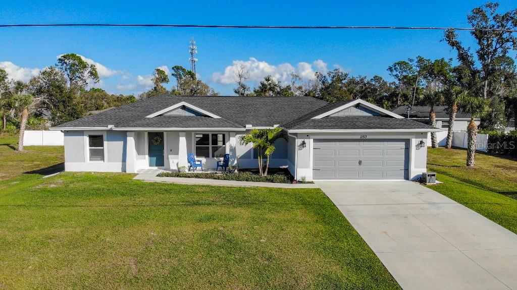 **Price reduction** Move right into this gently used home on a half acre, just a short distance from community park. With a split floor plan, this 3 bedroom + den home will give you plenty of space. Large open living area is great for dinners and entertaining. The kitchen features soft close shaker style cabinets, beautiful stone countertops, stainless steel Whirlpool appliances and a farmhouse style sink and backsplash tie it all together. The pantry offers plenty of room, with 10 shelves. Down the hall you will find 2 guest bedrooms, a linen closet, guest bathroom and laundry room. Guest bathroom has a tub/shower combo with stone wall and decor. Laundry room has new LG front load washer and dryer that stay with the home. Opposite you will also find additional shelving and a utility sink. The den can be closed with the double doors, offering the privacy of an additional bedroom if needed. The primary suite has crown molding and plenty of space for all of your furniture. Retreat further into your spa like en-suite and you will never want to leave! Relaxing tub, separate tiled shower and dual sink vanity. Beyond that is your huge walk in closet, with pocket door. Impact windows provides ease during hurricane season with no shutters having to be put up! This home is also not in a flood zone. A/C is serviced twice per year and the water heater was just replaced in 2024. The large yard is a double lot, so you are just under a 1/2 acre, with cleared space on either side of the home, as well as the backyard. This allows you plenty of room for your future garage, shed, pool or playground! The opportunities are endless. Within easy access to I-75, you can access Kings Hwy in 10 min, or if you are heading north- hop on at Toledo Blade. Just a short drive to the up and coming Wellen Park area. Don't wait for the unknown new construction home to be completed- this is move in ready today!