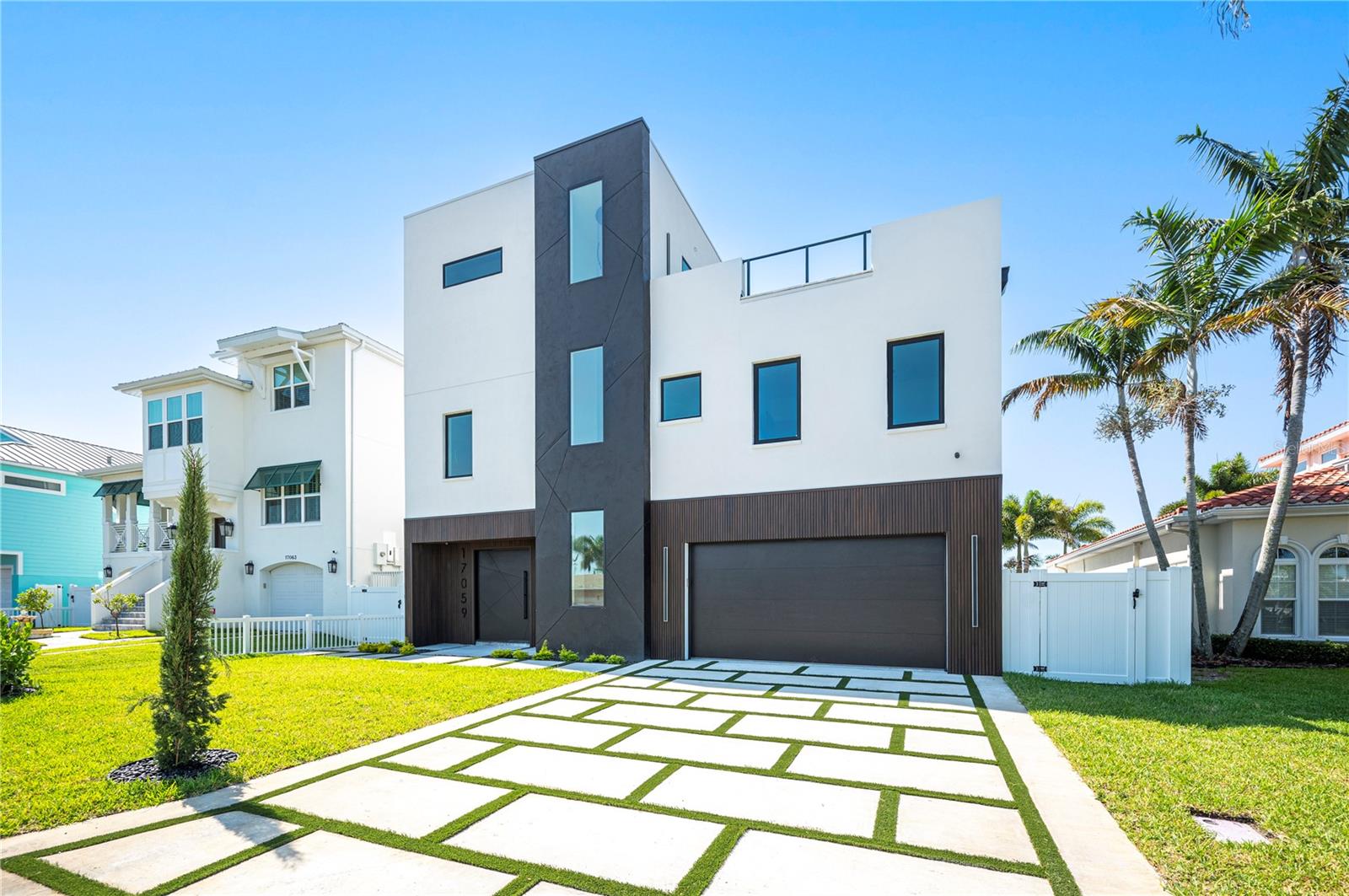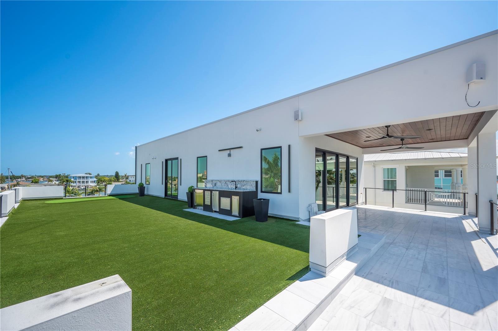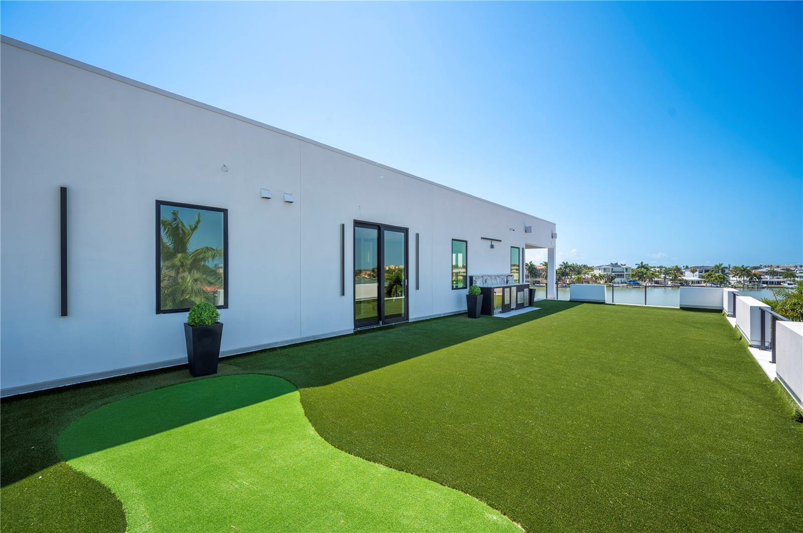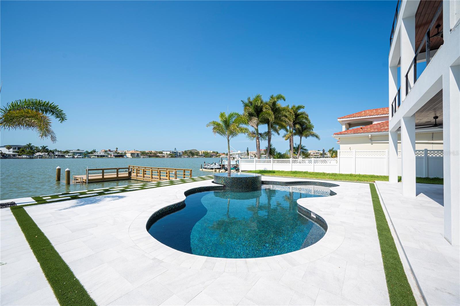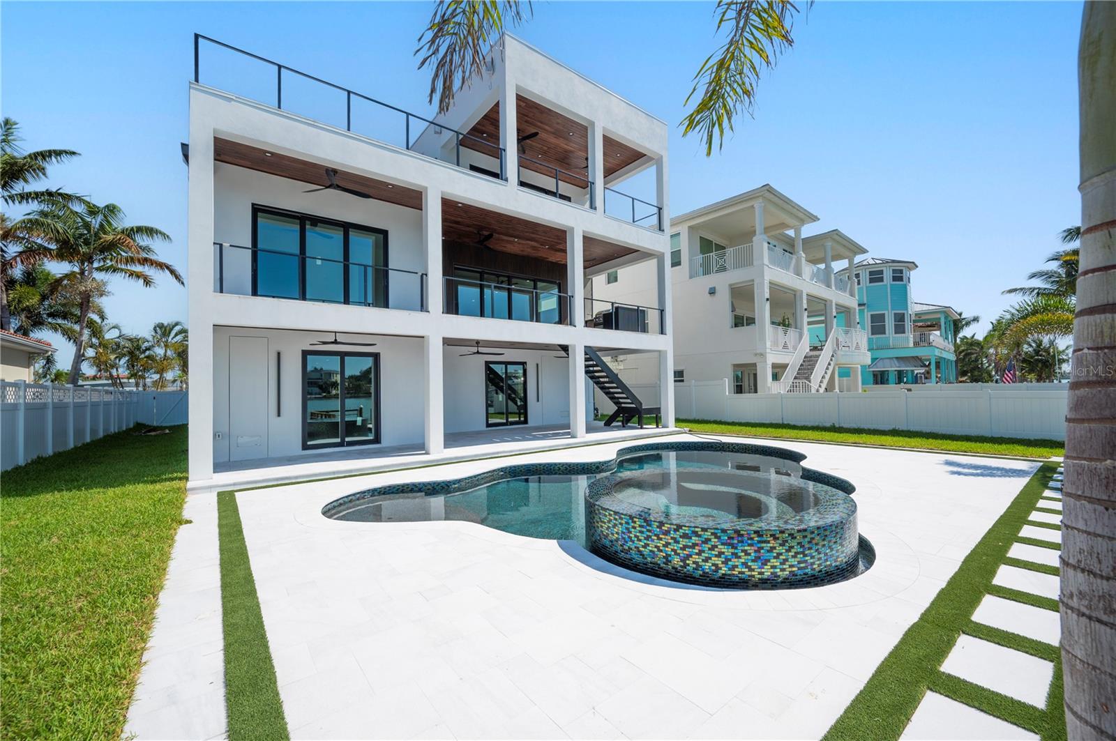NO FLOOD DAMAGE TO THE LIVING LEVELS!! Modern Masterpiece in North Redington Beach by Spinelli Real Estate Development. This modern three-story coastal location one and a half blocks from the beach features a spectacular turf rooftop terrace offering over 1,200 SF of stunning beach vistas and captivating sunsets. Every custom detail has been addressed from a dramatic 20ft cascading chandelier and expansive iron pivot front entry door, climate-controlled wine cellar, and 9 car garage. Floor to ceiling windows and soaring ceilings provide the backdrop for impressive entertaining in an open floor plan. The second floor delivers an outstanding chef’s kitchen with quartz waterfall island, top-of-the-line appliances (Thermador) and butler’s pantry overlooking the dining area and family room. The second level also features an ensuite guest bedroom, powder bath and 2 more bedrooms, an Outdoor Kitchen and expansive marble lanai. A 3-stop elevator assures easy transition from floor to floor, with the third level offering a grand master retreat. The private primary oasis provides large sliders to a terrace overlooking the intercoastal, indulgent spa-inspired bath and custom closet/dressing area. The third level boasts an expansive walk around rooftop terrace along with an entertaining bar and putting green. The ground level is all about entertaining with a spacious covered lanai, fully automated salt water pool, 360 infinity spa and marble/turf expansive deck. Additional features include luxury vinyl flooring throughout, Custom built Closets, custom Italian cabinetry, gas appliances and tankless water heater, dual laundry room, outdoor surround sound, smart home pre wire, camera system and tropical landscape. Deep water canal with 2017 seawall and dock. In desirable North Redington Beach Dolphin Dr canal, you are just moments from the pristine Gulf beach and the vibrant energy of coastal living. Minutes to local festivals, restaurants, golf and entertainment! This is a perfect beach paradise to live like you’re on vacation every day. Enjoy the many nearby dining options, John's Pass, Clearwater Beach and downtown St. Pete, with easy access to Tampa International Airport.