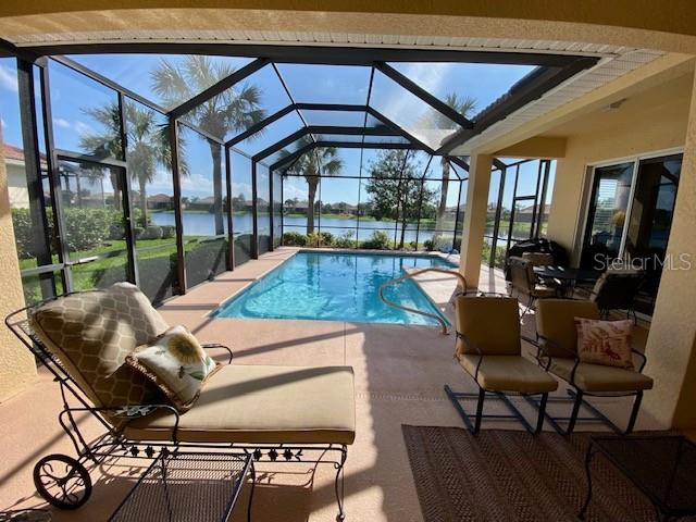193 Montelluna Dr is single-family Mediterranean home located in the highly sought-after gated neighborhood community, Venetian Golf & River Club in North Venice Florida. This home is 3.3 miles from the new Sarasota Memorial Hospital-Venice and exit #195 on I-75 and only a 15 to 20 minute drive to beautiful gulf beaches. This home is a three bedroom, two bath split bedrooms (master bath with separate shower, large soaking tub, double his and her vanities and sinks and separate toilet room), large , screened, south facing swimming pool and spacious deck area, a wonderful lakeview from almost every room in the home, with a spacious kitchen and indoor utility room and over 500 square foot garage. The swimming pool and deck were recently renovated and the cage rescreened. The community has an 18-hole golf course, pro shop and clubhouse available for membership. Your HOA fee provides a large heated swimming pool, lap pool, exercise room, meeting area, two restaurants, a popular tiki bar to visit, har tru tennis courts, pickle ball courts, kayak launch on the Myakka River, nature trail, irrigation water for your inground installed sprinkler system, sidewalks and gated entrance with 24-hour security. This home has many upgraded features. Tray ceilings, crown moldings, plantation shutters, multiple ceiling fans, granite counter tops, ceramic tile and carpet floors. The home is thoughtfully situated on a generous 9,981 square foot lot.