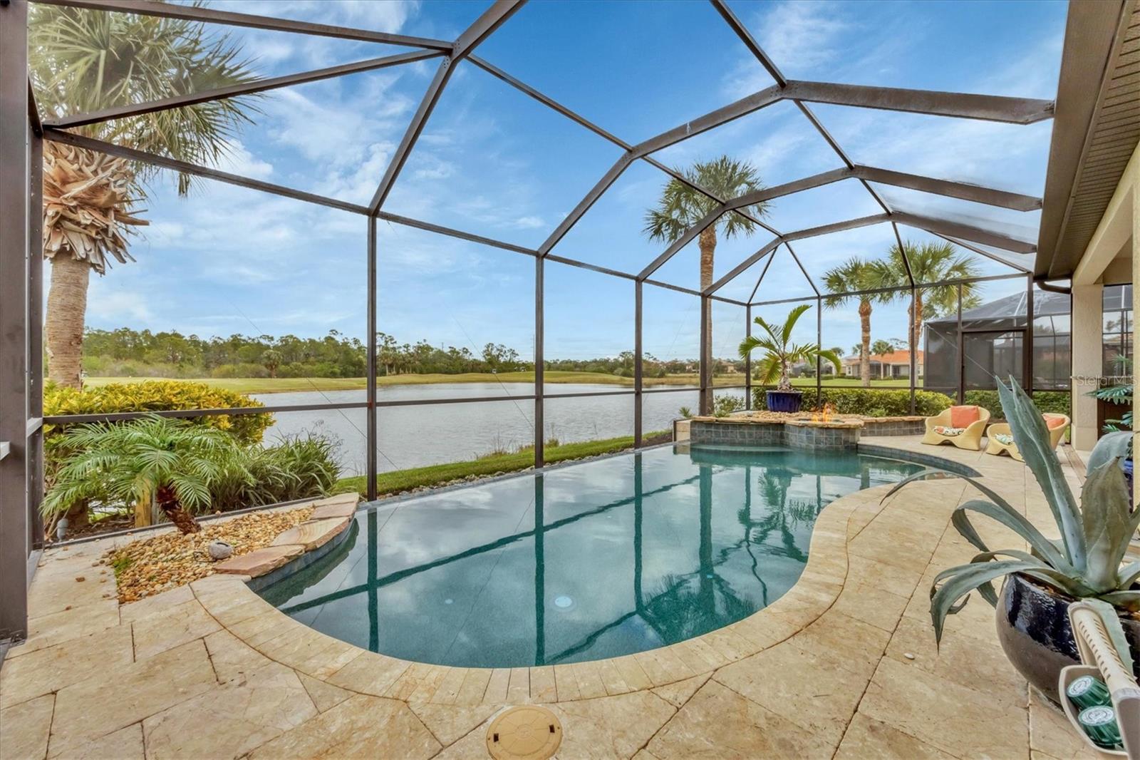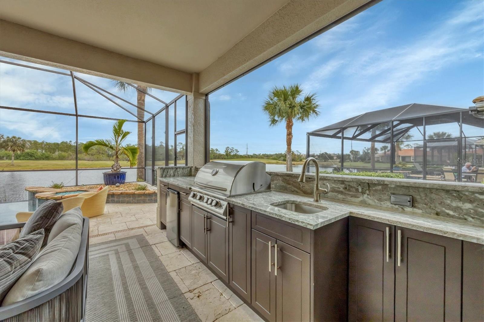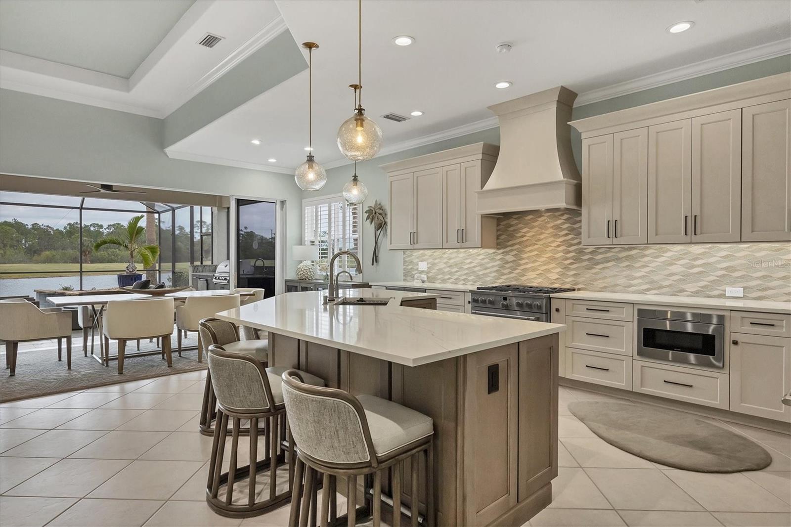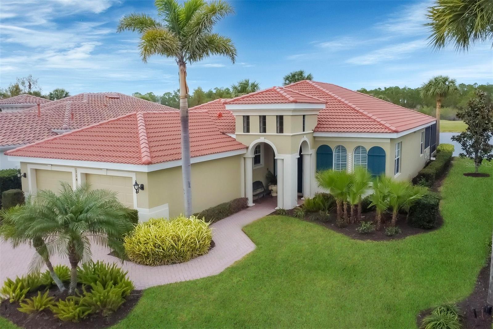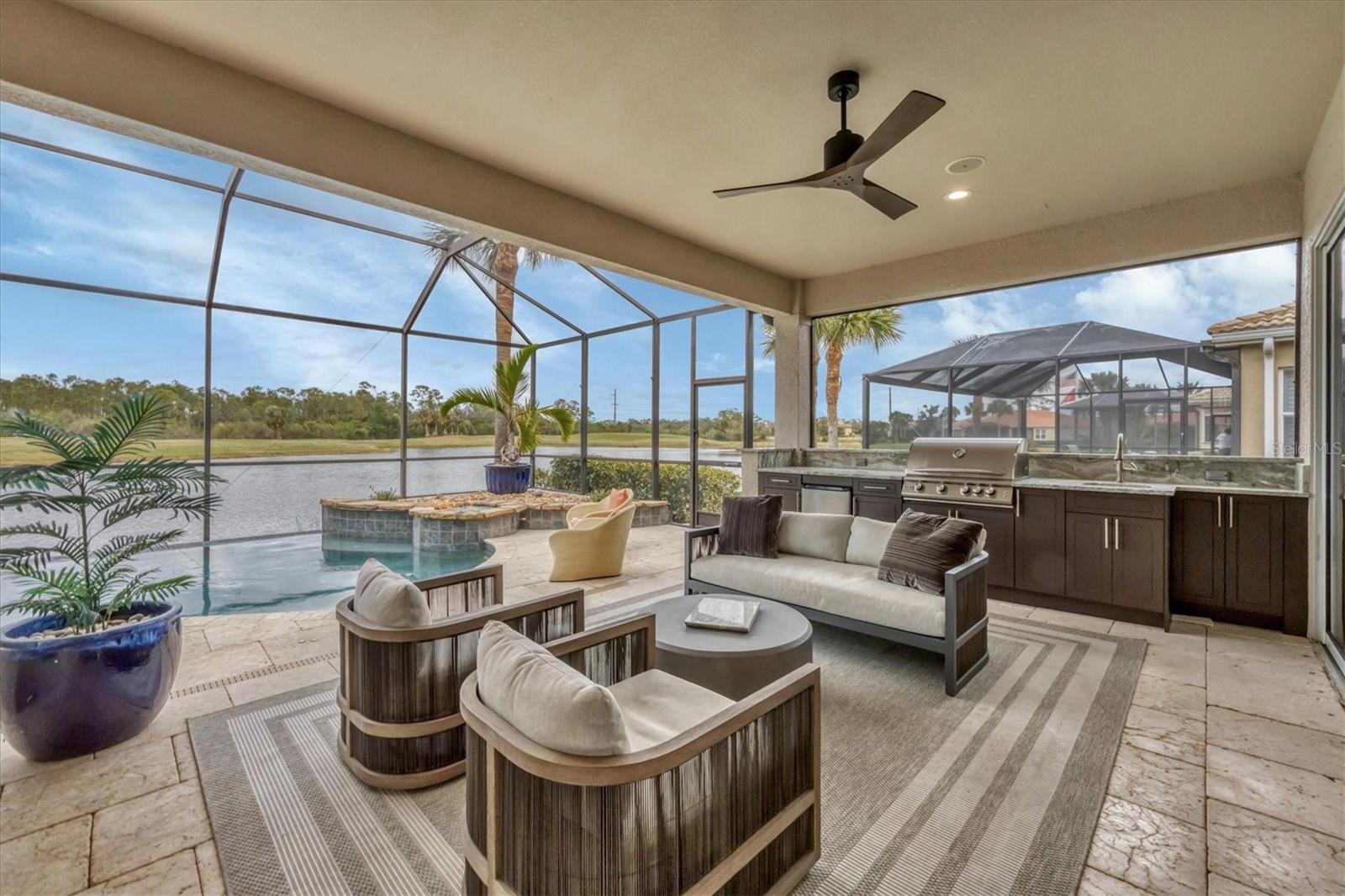 This one is a W-O-W and looks like a Model Home! Seller is offering a HOMEOWNER WARRANTY with Pool coverage! Sited on one of the most coveted lots in this UPSCALE and amenity-rich golf community, this home is impeccable, updated and move in ready! A quiet cul-de-sac location backing to water and the 13th hole (a great par 3; watch the golfers tee off!) ... what better place to call home! Upon entering, you'll sense a calm, soothing vibe as the fresh paint, neutral flooring, upgraded light fixtures and ceiling fans, and general decor exude an elegant coastal contemporary flair. The split Floor Plan is ideal with 3 beds, 2 baths, PLUS a Den, PLUS a "new" kitchen, PLUS a designer pool and dramatic firepit, PLUS a water view, PLUS a golf view! AND ... THE KITCHEN IS A SHOWSTOPPER WITH ALL THE BEST BELLS & WHISTLES -- Cafe appliances, frameless soft-close cabinetry, gorgeous quartz counter-height island, "coastal" backsplash, quartz countertops, 36" range, AND beverage center! The primary suite is large with beautiful new, neutral carpet, two closets (one, walk-in), views of the pool and golf course, and an ensuite bathroom, complete with split vanities, a separate shower, makeup vanity, soaking tub and private water closet. Bedrooms 2 and 3 are also spacious with beautiful neutral carpet, ceiling fans, and plentiful closet space. The living areas are open and comfortable with volume ceilings, and all eyes lead to the large, inviting, PRIVATE lanai, covered in gorgeous tumbled travertine flooring and a newly resurfaced pool with a COMPLETE OUTDOOR KITCHEN – the perfect spot to relax, share a bottle of wine, take a dip, or watch the golfers. The HOA fees cover basic cable, the guard-gated entry, exterior maintenance of the grounds, and all the extras of living in The Venetian -- clubhouse, fitness center, resort AND lap pool, tennis pickle ball, River Club dining, and awesome Riverwalk!