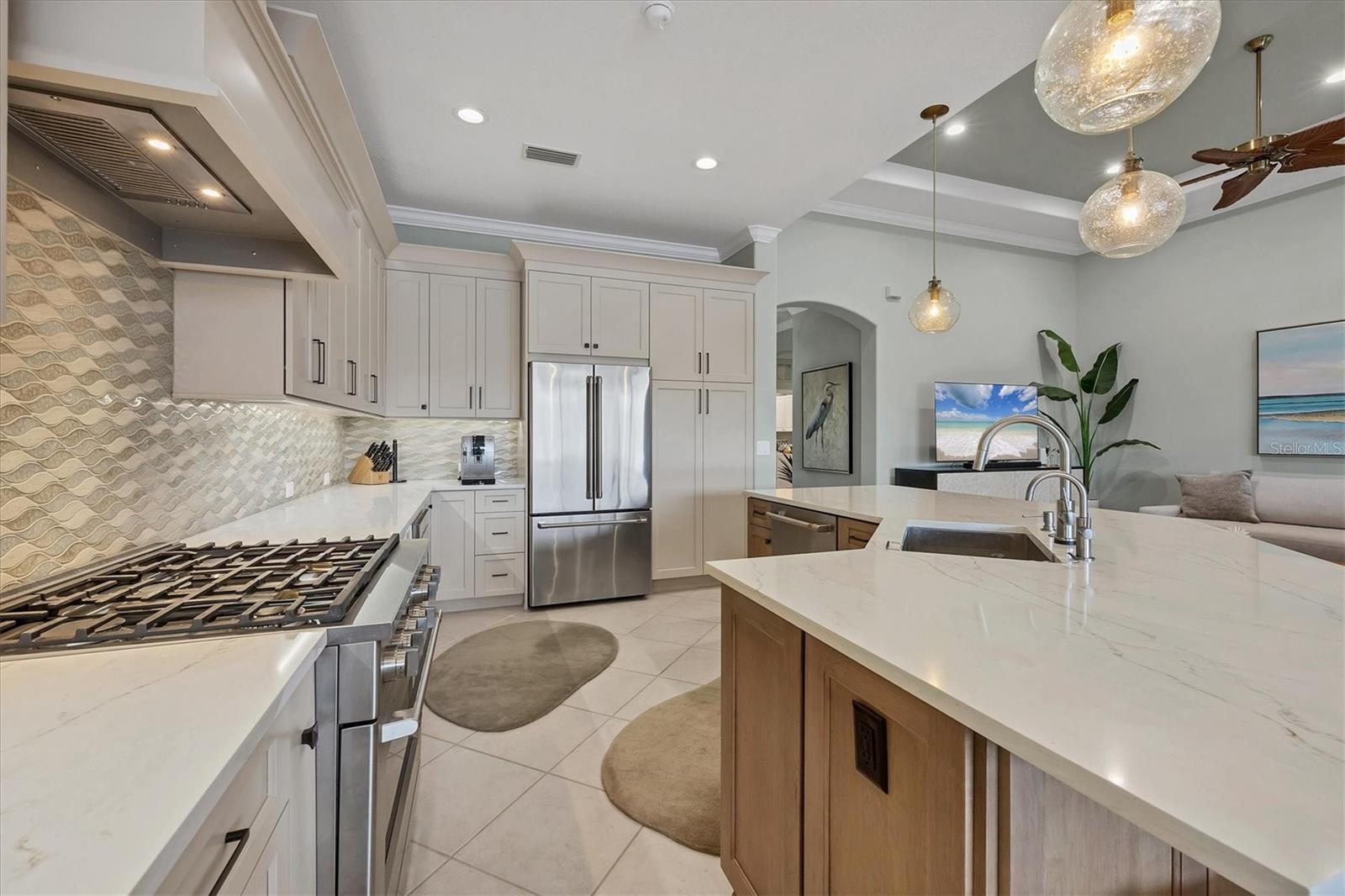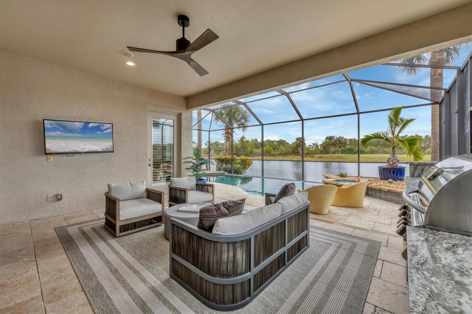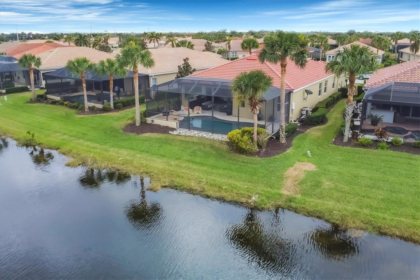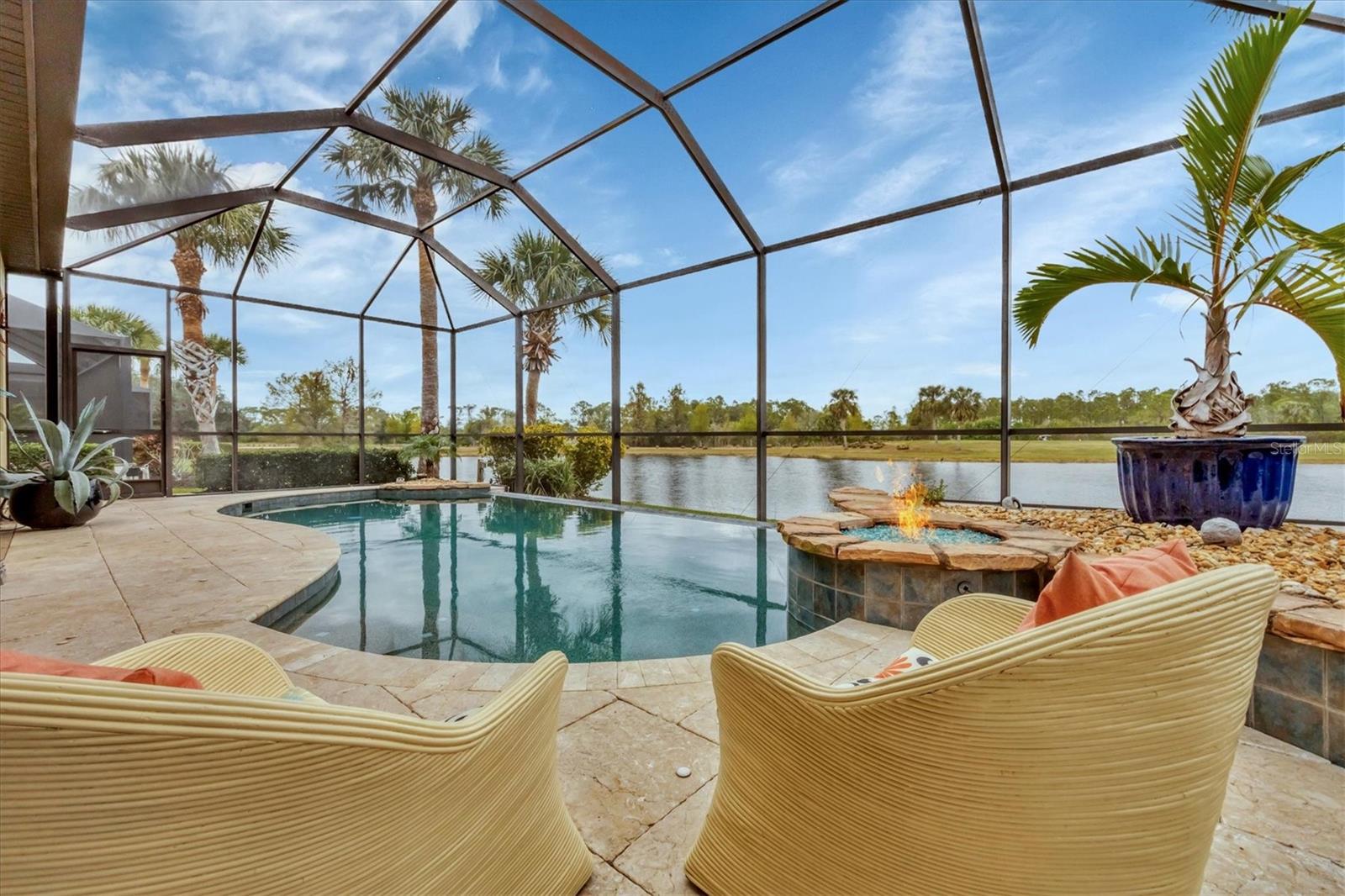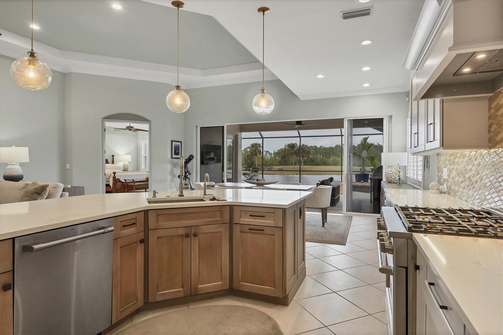 This one is a W-O-W and looks like a Model Home! Seller is offering a HOMEOWNER WARRANTY with Pool coverage! Sited on one of the most coveted lots in this UPSCALE and amenity-rich golf community, this home is impeccable, updated and move in ready! A quiet cul-de-sac location backing to water and the 13th hole (a great par 3; watch the golfers tee off!) ... what better place to call home! Upon entering, you'll sense a calm, soothing vibe as the fresh paint, neutral flooring, upgraded light fixtures and ceiling fans, and general decor exude an elegant coastal contemporary flair. The split Floor Plan is ideal with 3 beds, 2 baths, PLUS a Den, PLUS a "new" kitchen, PLUS a designer pool and dramatic firepit, PLUS a water view, PLUS a golf view! AND ... THE KITCHEN IS A SHOWSTOPPER WITH ALL THE BEST BELLS & WHISTLES -- Cafe appliances, frameless soft-close cabinetry, gorgeous quartz counter-height island, "coastal" backsplash, quartz countertops, 36" range, AND beverage center! The primary suite is large with beautiful new, neutral carpet, two closets (one, walk-in), views of the pool and golf course, and an ensuite bathroom, complete with split vanities, a separate shower, makeup vanity, soaking tub and private water closet. Bedrooms 2 and 3 are also spacious with beautiful neutral carpet, ceiling fans, and plentiful closet space. The living areas are open and comfortable with volume ceilings, and all eyes lead to the large, inviting, PRIVATE lanai, covered in gorgeous tumbled travertine flooring and a newly resurfaced pool with a COMPLETE OUTDOOR KITCHEN – the perfect spot to relax, share a bottle of wine, take a dip, or watch the golfers. The HOA fees cover basic cable, the guard-gated entry, exterior maintenance of the grounds, and all the extras of living in The Venetian -- clubhouse, fitness center, resort AND lap pool, tennis pickle ball, River Club dining, and awesome Riverwalk!