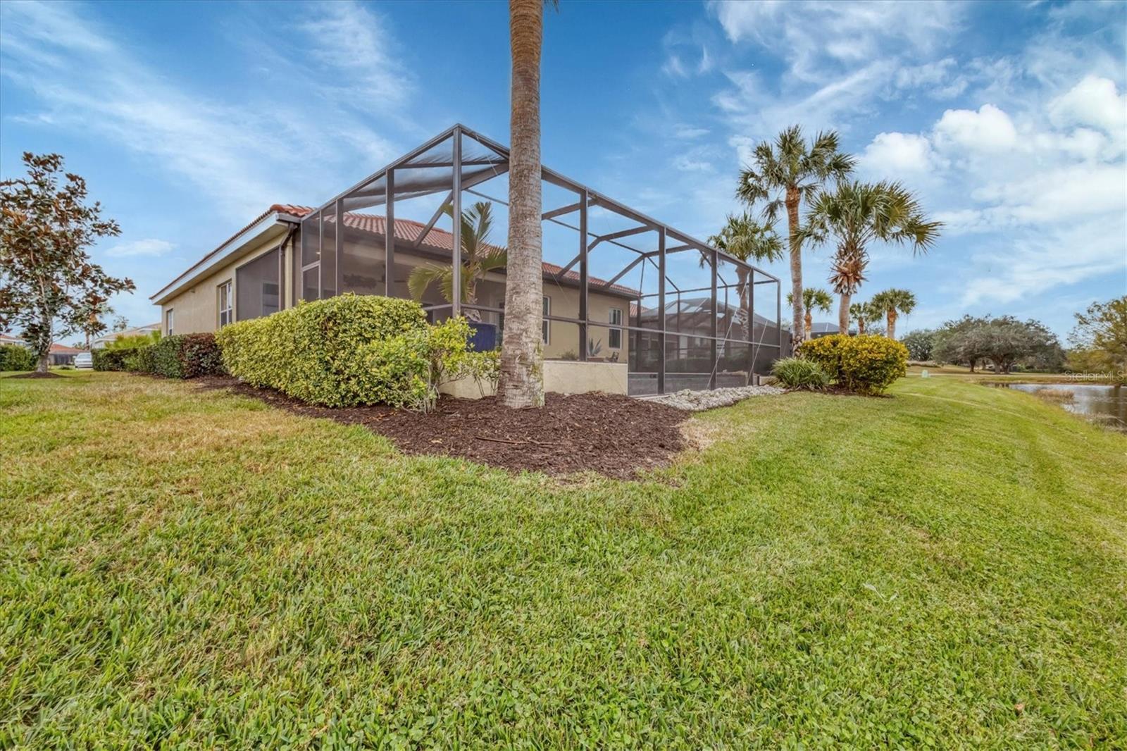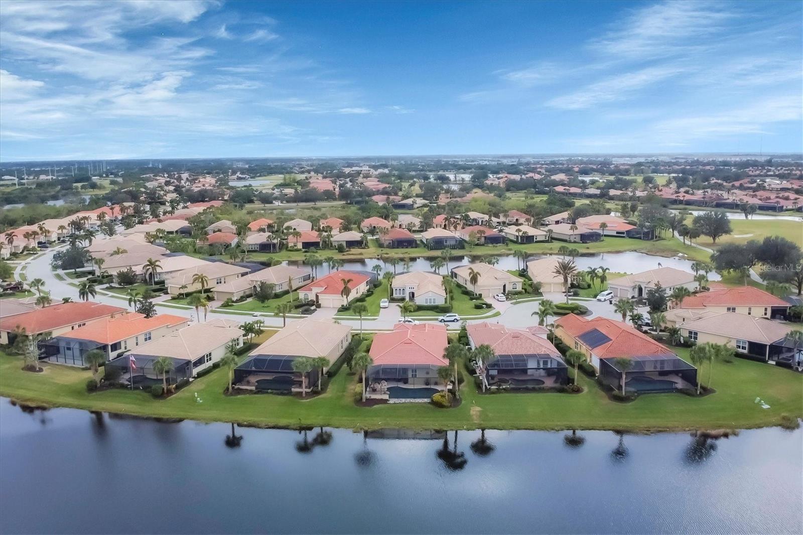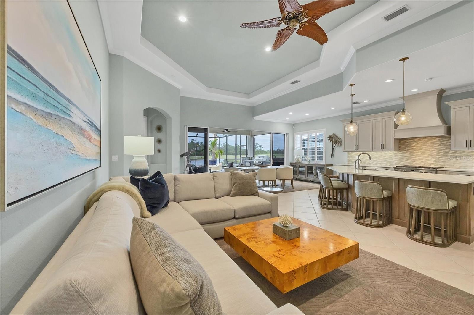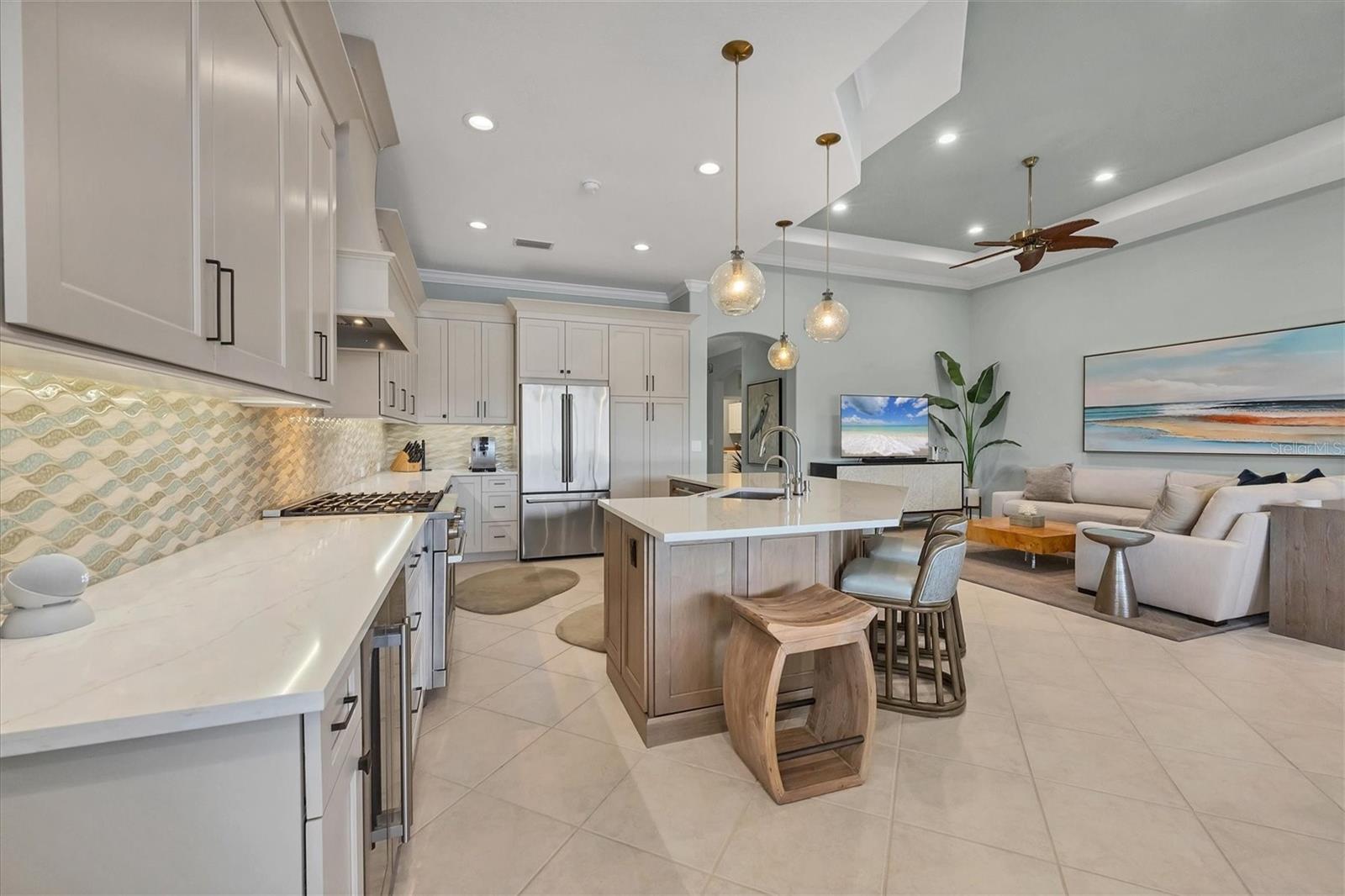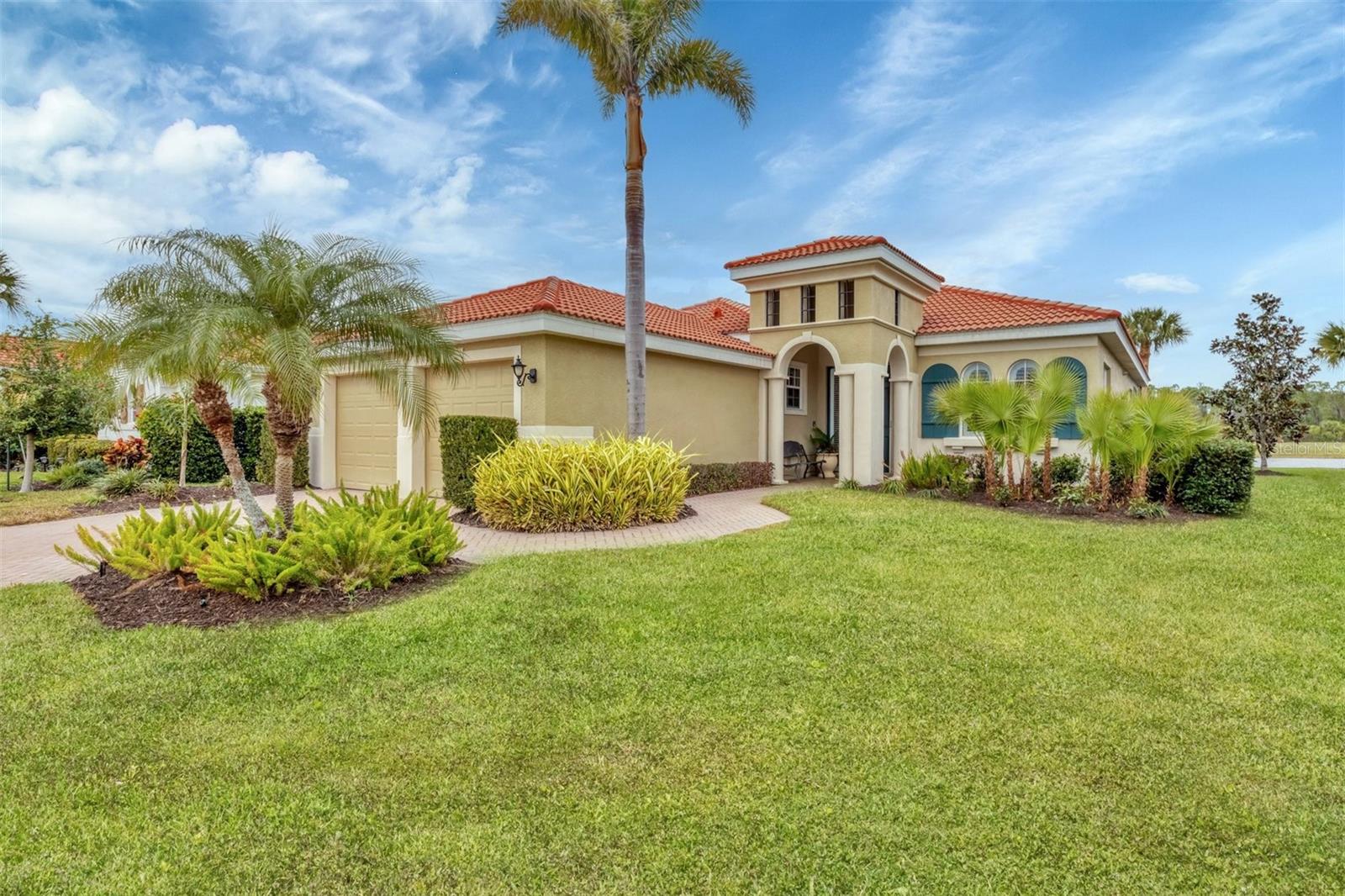This one is a W-O-W and looks like a Model Home! Seller is offering a HOMEOWNER WARRANTY with Pool coverage! Sited on one of the most coveted lots in this UPSCALE and amenity-rich golf community, this home is impeccable, updated and move in ready! A quiet cul-de-sac location backing to water and the 13th hole (a great par 3; watch the golfers tee off!) ... what better place to call home! Upon entering, you'll sense a calm, soothing vibe as the fresh paint, neutral flooring, upgraded light fixtures and ceiling fans, and general decor exude an elegant coastal contemporary flair. The split Floor Plan is ideal with 3 beds, 2 baths, PLUS a Den, PLUS a "new" kitchen, PLUS a designer pool and dramatic firepit, PLUS a water view, PLUS a golf view! AND ... THE KITCHEN IS A SHOWSTOPPER WITH ALL THE BEST BELLS & WHISTLES -- Cafe appliances, frameless soft-close cabinetry, gorgeous quartz counter-height island, "coastal" backsplash, quartz countertops, 36" range, AND beverage center! The primary suite is large with beautiful new, neutral carpet, two closets (one, walk-in), views of the pool and golf course, and an ensuite bathroom, complete with split vanities, a separate shower, makeup vanity, soaking tub and private water closet. Bedrooms 2 and 3 are also spacious with beautiful neutral carpet, ceiling fans, and plentiful closet space. The living areas are open and comfortable with volume ceilings, and all eyes lead to the large, inviting, PRIVATE lanai, covered in gorgeous tumbled travertine flooring and a newly resurfaced pool with a COMPLETE OUTDOOR KITCHEN – the perfect spot to relax, share a bottle of wine, take a dip, or watch the golfers. The HOA fees cover basic cable, the guard-gated entry, exterior maintenance of the grounds, and all the extras of living in The Venetian -- clubhouse, fitness center, resort AND lap pool, tennis pickle ball, River Club dining, and awesome Riverwalk!