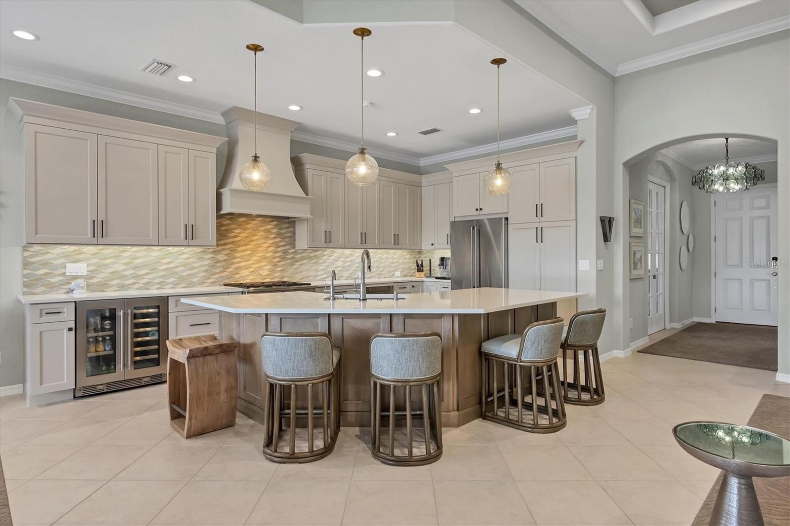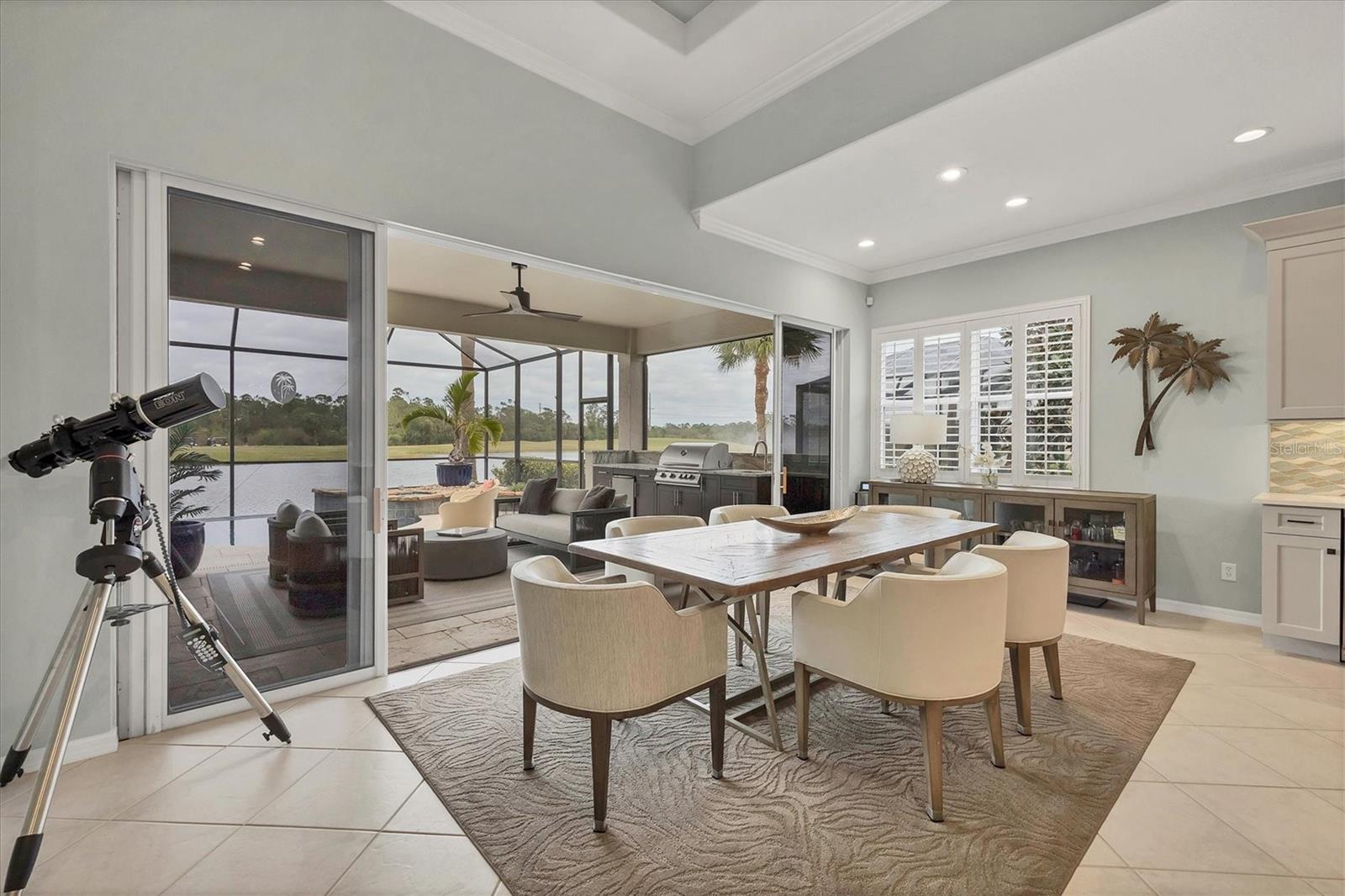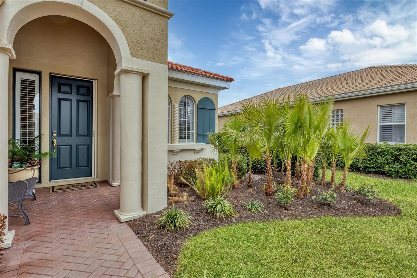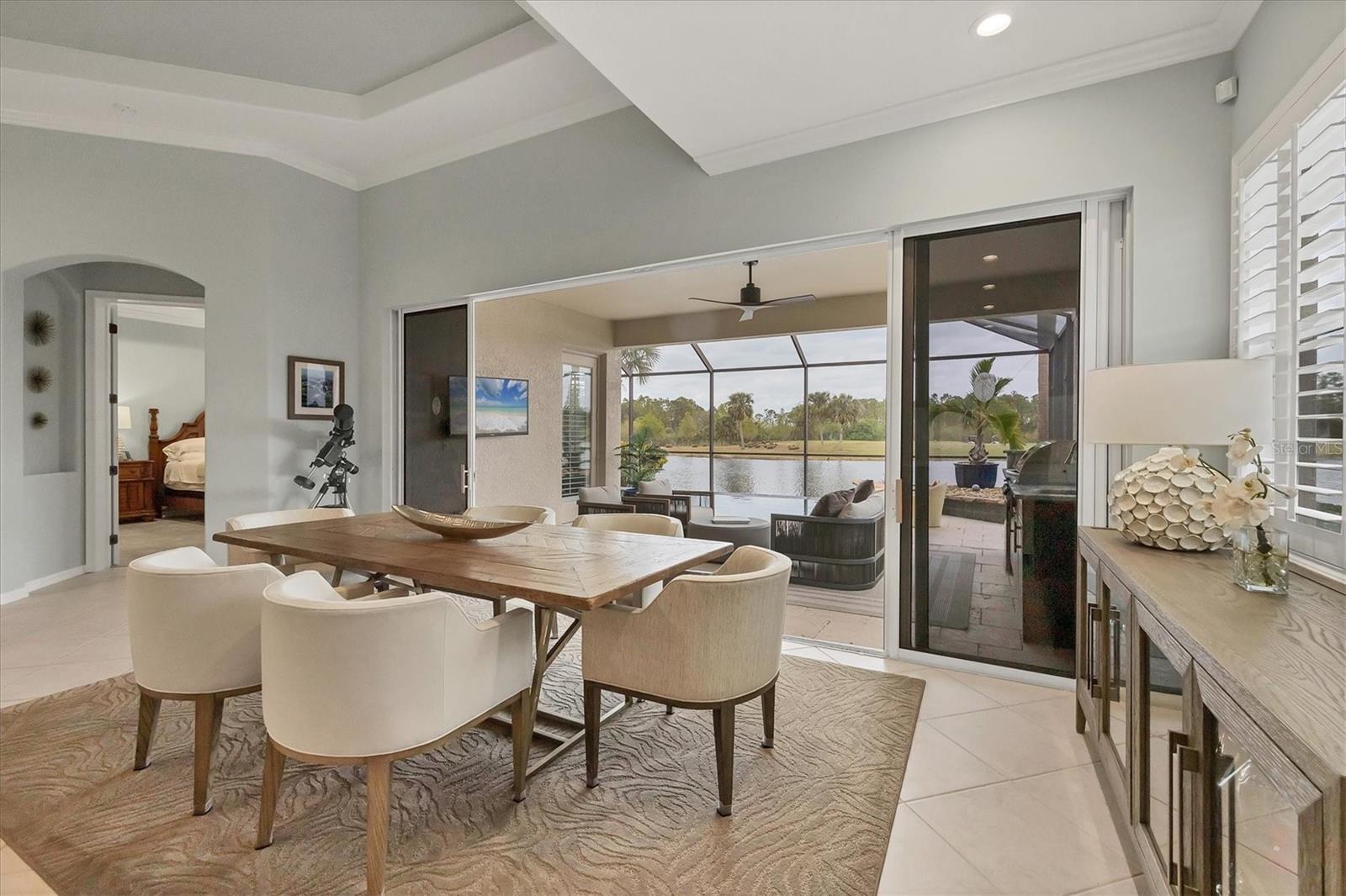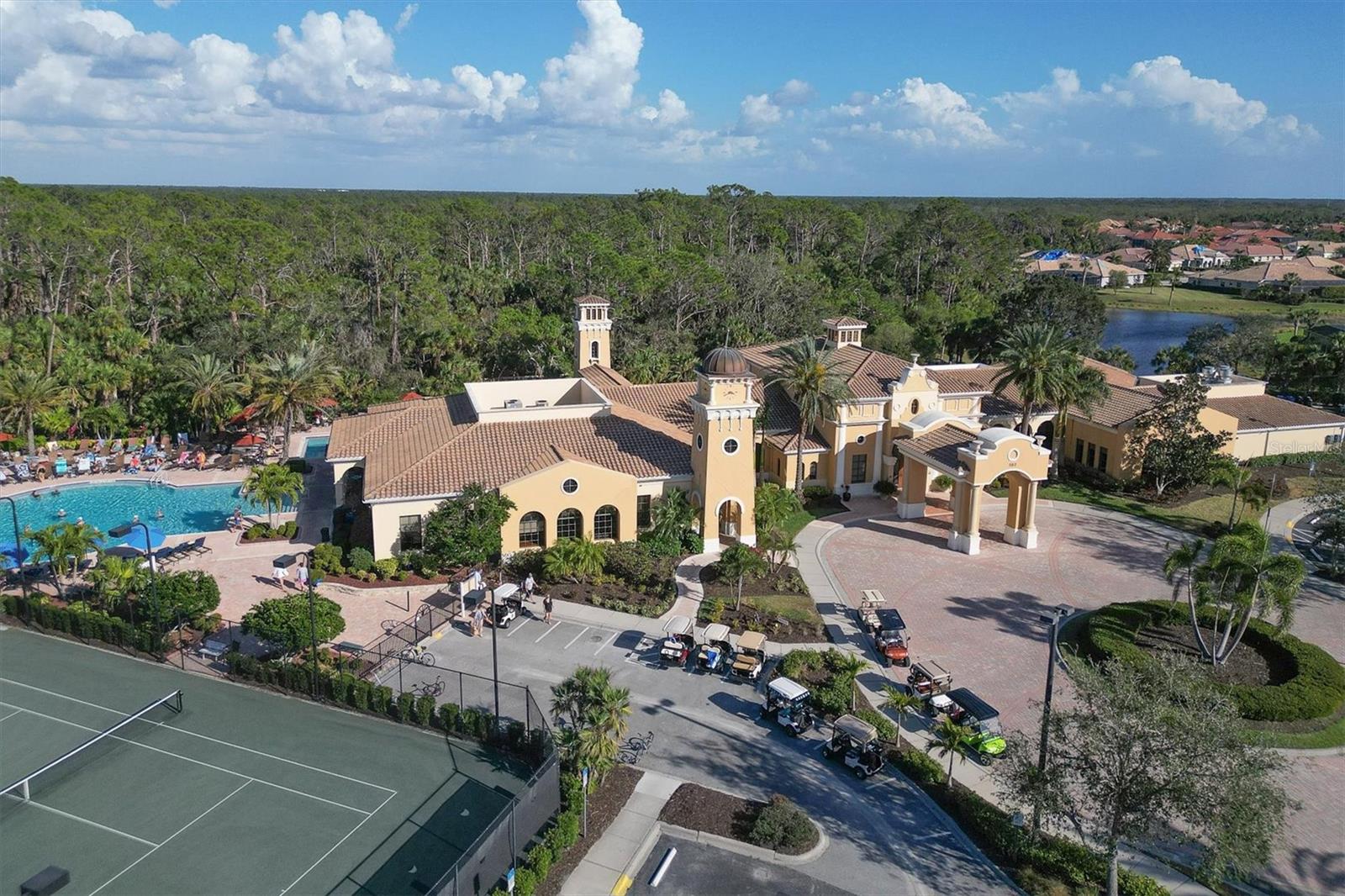 This one is a W-O-W and looks like a Model Home! Seller is offering a HOMEOWNER WARRANTY with Pool coverage! Sited on one of the most coveted lots in this UPSCALE and amenity-rich golf community, this home is impeccable, updated and move in ready! A quiet cul-de-sac location backing to water and the 13th hole (a great par 3; watch the golfers tee off!) ... what better place to call home! Upon entering, you'll sense a calm, soothing vibe as the fresh paint, neutral flooring, upgraded light fixtures and ceiling fans, and general decor exude an elegant coastal contemporary flair. The split Floor Plan is ideal with 3 beds, 2 baths, PLUS a Den, PLUS a "new" kitchen, PLUS a designer pool and dramatic firepit, PLUS a water view, PLUS a golf view! AND ... THE KITCHEN IS A SHOWSTOPPER WITH ALL THE BEST BELLS & WHISTLES -- Cafe appliances, frameless soft-close cabinetry, gorgeous quartz counter-height island, "coastal" backsplash, quartz countertops, 36" range, AND beverage center! The primary suite is large with beautiful new, neutral carpet, two closets (one, walk-in), views of the pool and golf course, and an ensuite bathroom, complete with split vanities, a separate shower, makeup vanity, soaking tub and private water closet. Bedrooms 2 and 3 are also spacious with beautiful neutral carpet, ceiling fans, and plentiful closet space. The living areas are open and comfortable with volume ceilings, and all eyes lead to the large, inviting, PRIVATE lanai, covered in gorgeous tumbled travertine flooring and a newly resurfaced pool with a COMPLETE OUTDOOR KITCHEN – the perfect spot to relax, share a bottle of wine, take a dip, or watch the golfers. The HOA fees cover basic cable, the guard-gated entry, exterior maintenance of the grounds, and all the extras of living in The Venetian -- clubhouse, fitness center, resort AND lap pool, tennis pickle ball, River Club dining, and awesome Riverwalk!