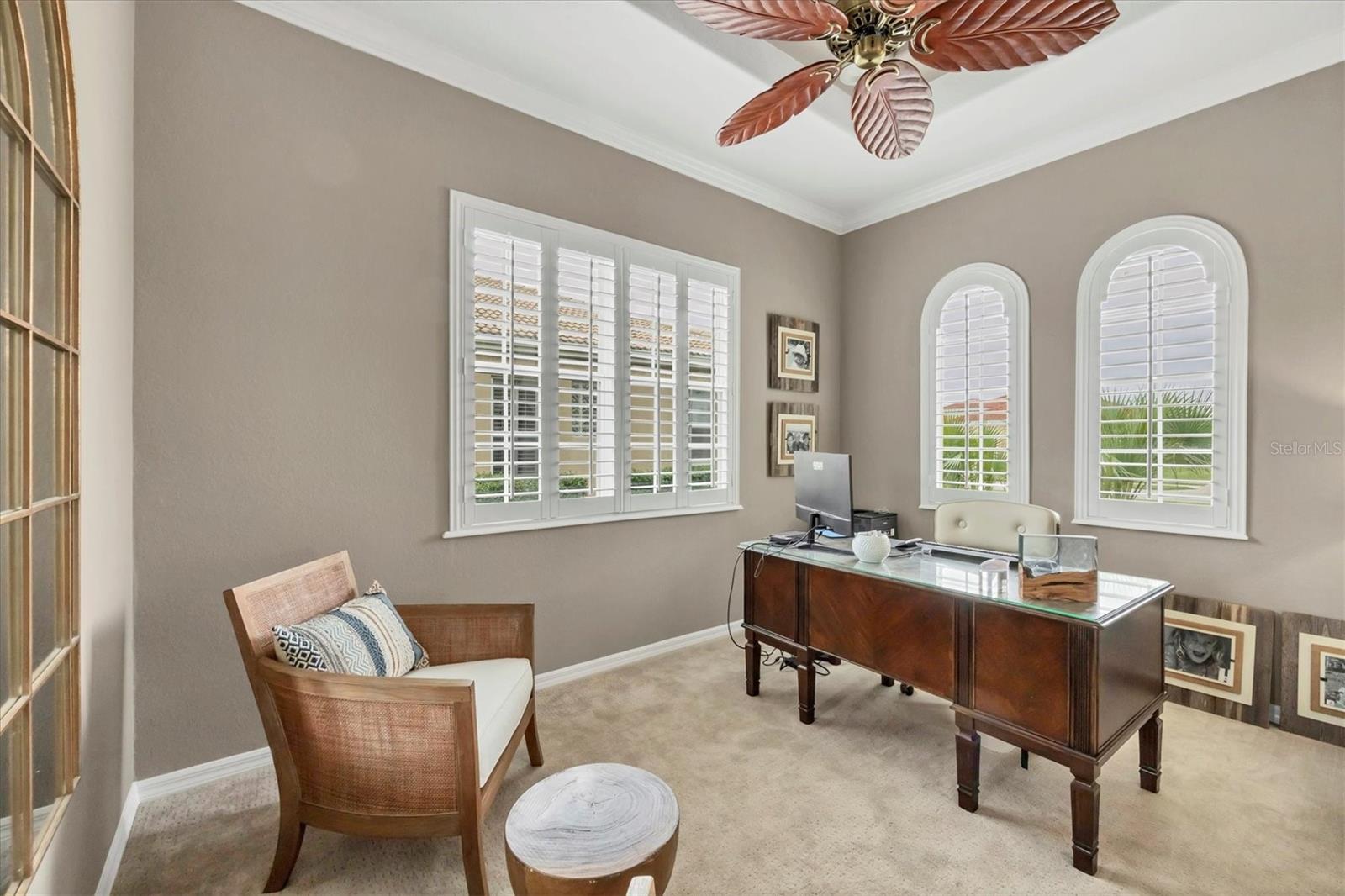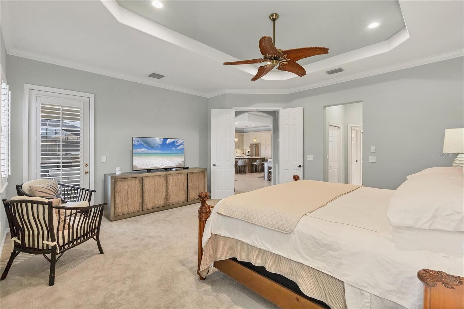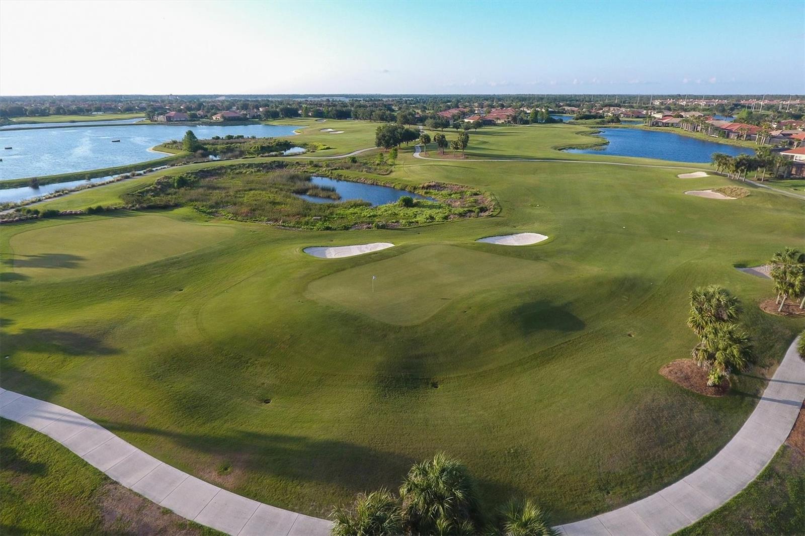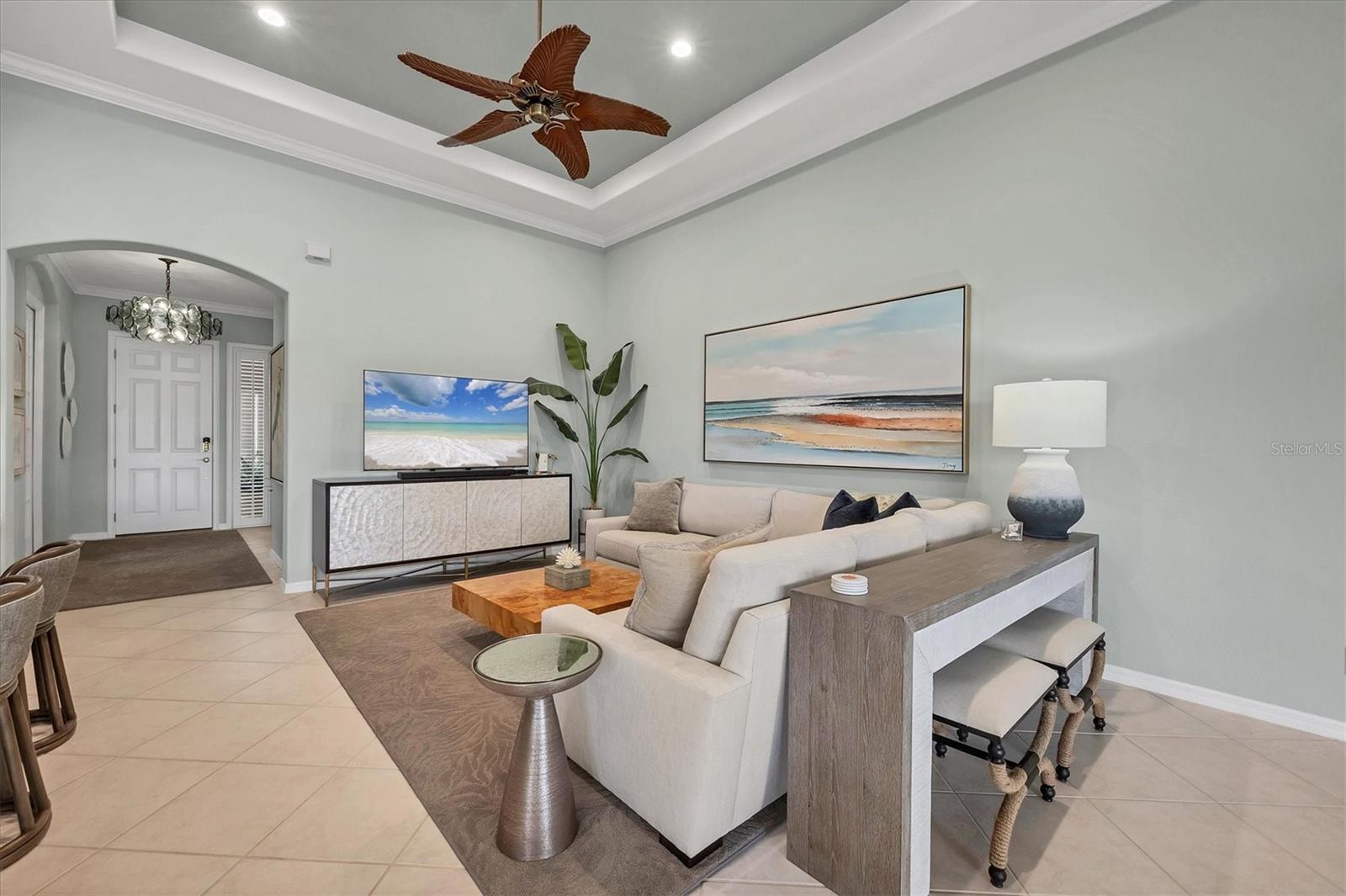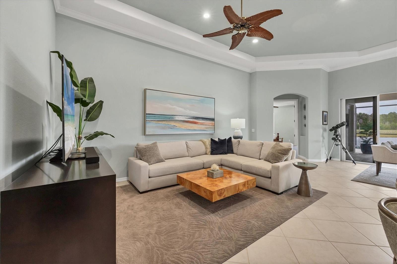 This one is a W-O-W and looks like a Model Home! Seller is offering a HOMEOWNER WARRANTY with Pool coverage! Sited on one of the most coveted lots in this UPSCALE and amenity-rich golf community, this home is impeccable, updated and move in ready! A quiet cul-de-sac location backing to water and the 13th hole (a great par 3; watch the golfers tee off!) ... what better place to call home! Upon entering, you'll sense a calm, soothing vibe as the fresh paint, neutral flooring, upgraded light fixtures and ceiling fans, and general decor exude an elegant coastal contemporary flair. The split Floor Plan is ideal with 3 beds, 2 baths, PLUS a Den, PLUS a "new" kitchen, PLUS a designer pool and dramatic firepit, PLUS a water view, PLUS a golf view! AND ... THE KITCHEN IS A SHOWSTOPPER WITH ALL THE BEST BELLS & WHISTLES -- Cafe appliances, frameless soft-close cabinetry, gorgeous quartz counter-height island, "coastal" backsplash, quartz countertops, 36" range, AND beverage center! The primary suite is large with beautiful new, neutral carpet, two closets (one, walk-in), views of the pool and golf course, and an ensuite bathroom, complete with split vanities, a separate shower, makeup vanity, soaking tub and private water closet. Bedrooms 2 and 3 are also spacious with beautiful neutral carpet, ceiling fans, and plentiful closet space. The living areas are open and comfortable with volume ceilings, and all eyes lead to the large, inviting, PRIVATE lanai, covered in gorgeous tumbled travertine flooring and a newly resurfaced pool with a COMPLETE OUTDOOR KITCHEN – the perfect spot to relax, share a bottle of wine, take a dip, or watch the golfers. The HOA fees cover basic cable, the guard-gated entry, exterior maintenance of the grounds, and all the extras of living in The Venetian -- clubhouse, fitness center, resort AND lap pool, tennis pickle ball, River Club dining, and awesome Riverwalk!