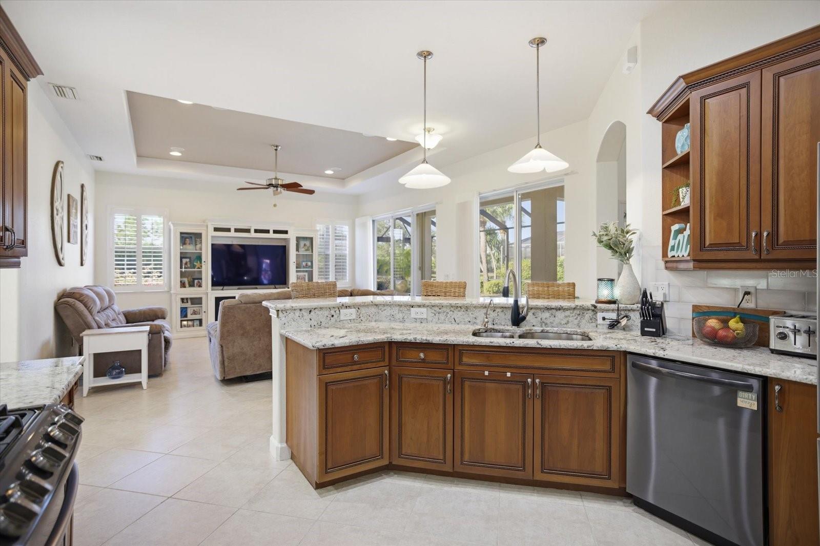 YOUR PIECE OF PARADISE AWAITS in the highly sought-after gated community of Venetian Golf & River Club! Perfectly positioned on a quiet, private lot backing to a tranquil lake, this beautifully maintained Angelico Model offers the ideal blend of luxury, comfort, and Florida lifestyle living. This spacious home features 3 bedrooms, 2 baths, a family room, formal living room, and formal dining room, providing flexible living and entertaining space. The open kitchen is the heart of the home, complete with 42” wood cabinetry, granite countertops, under-cabinet lighting, pantry, breakfast bar, and dining nook overlooking the pool and peaceful water views. Recent upgrades provide peace of mind and modern convenience, including a new HVAC system installed in 2023, brand new refrigerator, and brand new dishwasher. Step outside to your private outdoor oasis — a screened lanai with summer kitchen (gas hookup), surround sound wiring, and sparkling pool overlooking the lake, perfect for entertaining or relaxing evenings. Impact hurricane glass windows and doors throughout offer both security and energy efficiency. The spacious primary suite features tray ceilings and serene lake views through triple sliding doors, while the ensuite bath offers a soaking Jacuzzi tub and walk-in shower for a spa-like retreat. Additional highlights include: • Central vacuum • Large diagonal tile flooring • Security system • Surround sound in family room • Premium water-view homesite Located just minutes from Gulf beaches, shopping, and dining, residents enjoy exclusive access to the River Club amenities including: • Resort & lap pools • Fitness center & aerobics studio • Fine dining overlooking a 70-acre nature park along the Myakka River • Har-Tru tennis courts • Championship 18-hole golf course Experience luxury, privacy, and the best of Florida living all in one exceptional home.