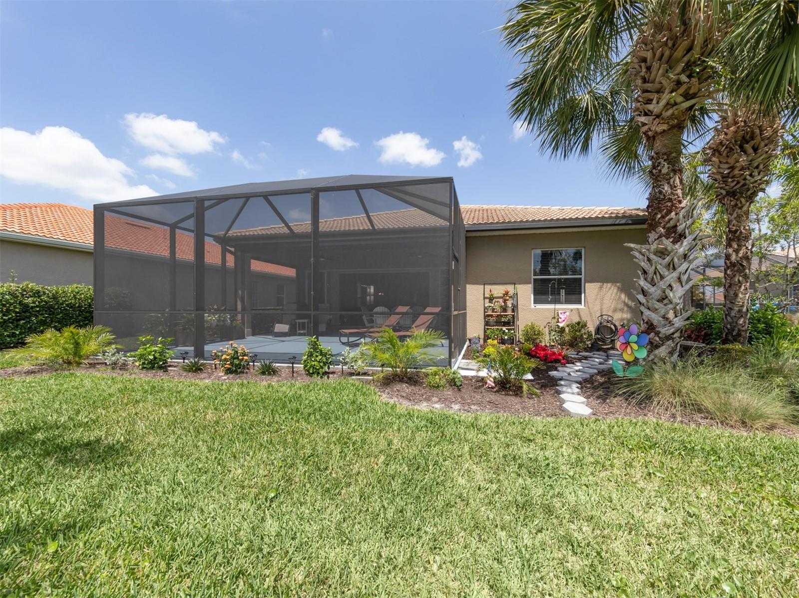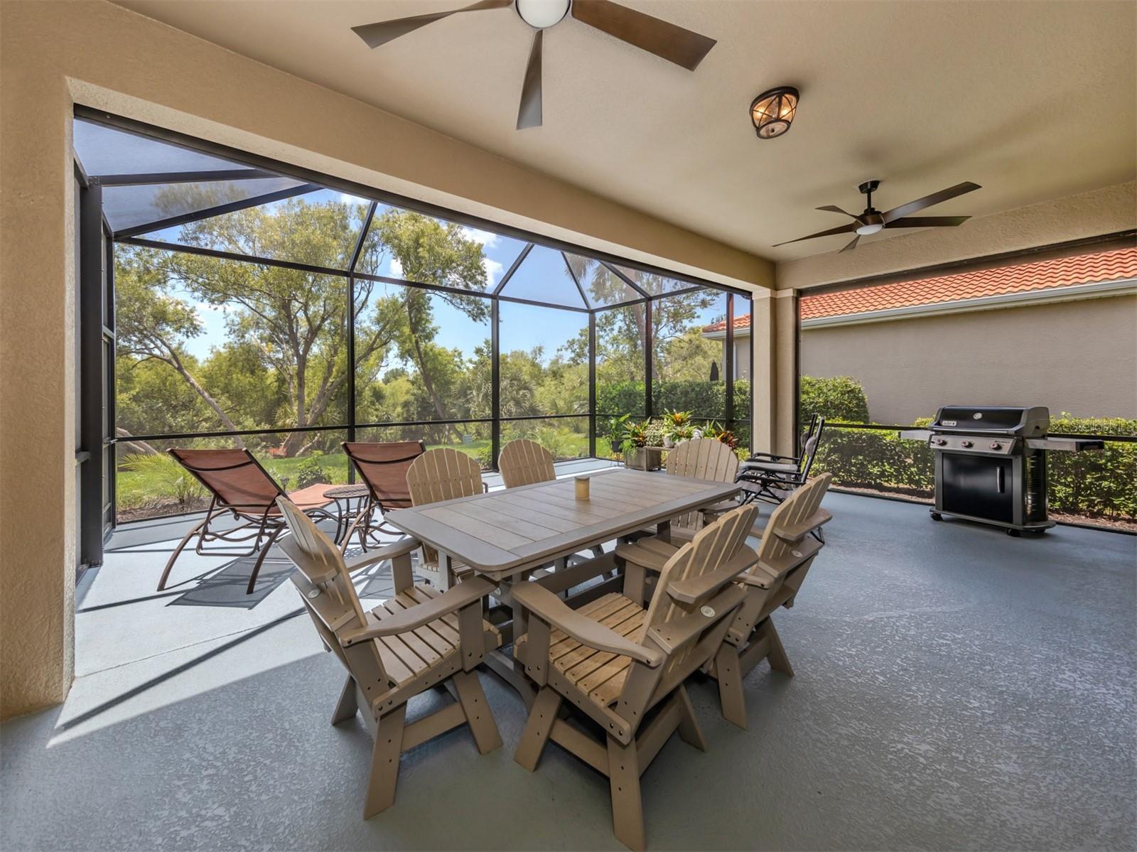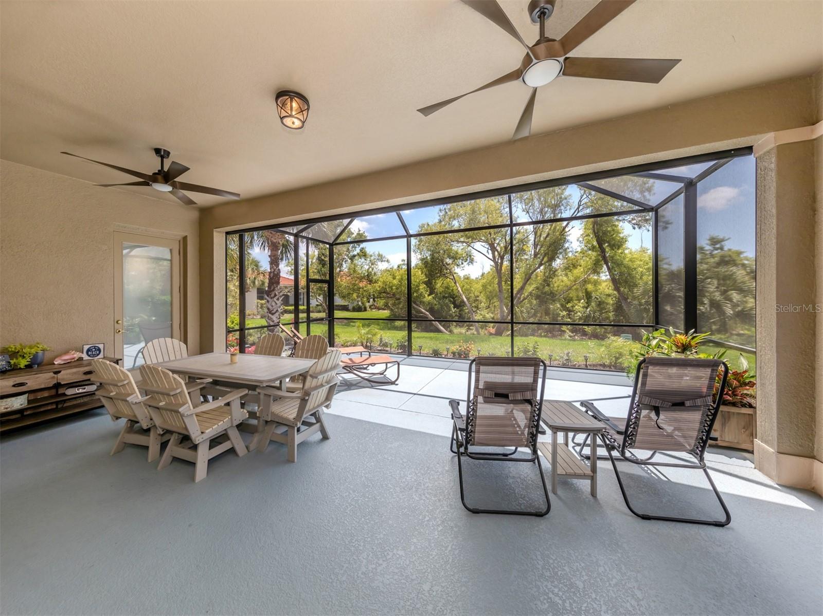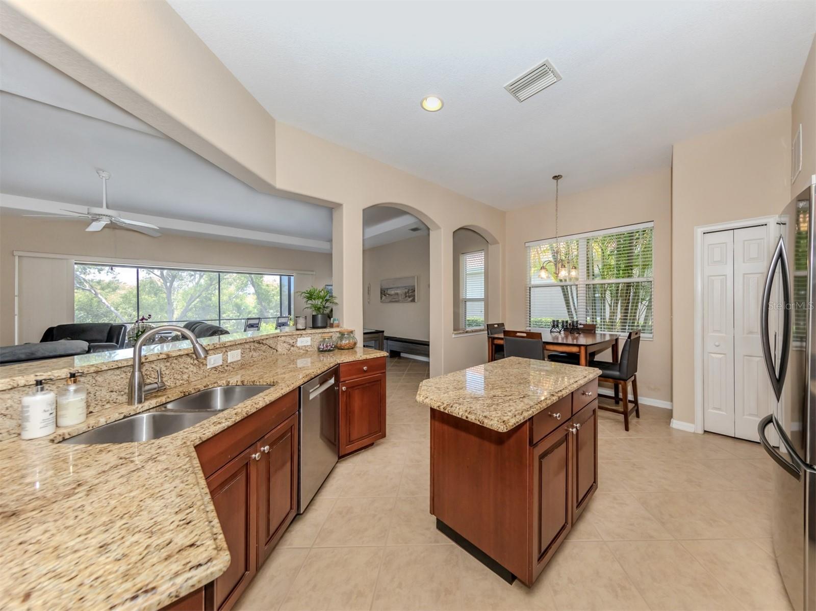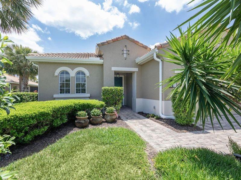 Enjoy a quality built home by WCI, an Extended Fioretti Model in the beautiful highly desired Venetian Golf and River Club. This one story single family home is situated on a quiet cal-de-sac street in the beautifully manicured gated community. Home offers you two large bedrooms, two full bathrooms, a versatile den/office and a bright open floor plan living room, dining room and kitchen. Upon entering the home, your vision draws you to the beautiful expansive glass sliding pocket doors which bring you to the VERY large newly installed extended lanai and private tree lined backyard. Living and entertaining will come with ease in this lovely home with high ceilings, new ceiling fixtures and fans, granite countertop breakfast bar, lots of cabinetry, a center island, gas range, new LG refrigerator, new Bosch Dishwasher, eat-in-area and pantry. The primary suite offers a spacious retreat with a patio door leading to the lanai, a large walk-in closet, dual sinks, garden soaking tub, separate shower and charming block window. The second bedroom sits separately in the front of the house with direct access to the guest bathroom. The den/office provides flexible space located just off the kitchen. Recently painted Inside and outside home features motorized rolldown hurricane screens, full house impact windows, new gutters, new shower in guest bathroom, new kitchen appliances, attractive 18" diagonal tile floors and new landscaping in the backyard. This exceptionally maintained home is move-in ready. After breakfast on your large, partly sunny and partly shaded lanai bike or walk to River Club Amenity Center. Treat yourself to lunch and a cocktail at the Tiki Bar alongside the Resort Size Swimming Pool and separate Lap Pool. Both pools are saltwater heated and chilled! Enjoy staying active at the onsite 6 TruClay Tennis Courts, 3 new Pickle Ball Courts, fully equipped gym and Fitness Center. Take a walk on the nature trail boardwalk that leads you to a deck view of the Myakka River. Breakfast, lunch and dinner can also be enjoyed at the Clubhouse. If you enjoy golf, the Venetian Golf Club by Heritage is within our gates, an optional membership is available to Venetian residents. Living in this paradise home is just a short drive from the beautiful Casey Key Gulf beaches, downtown historic Venice shopping and dining, legacy bike trails, arts and theatre and state-of-art Sarasota Hospital.