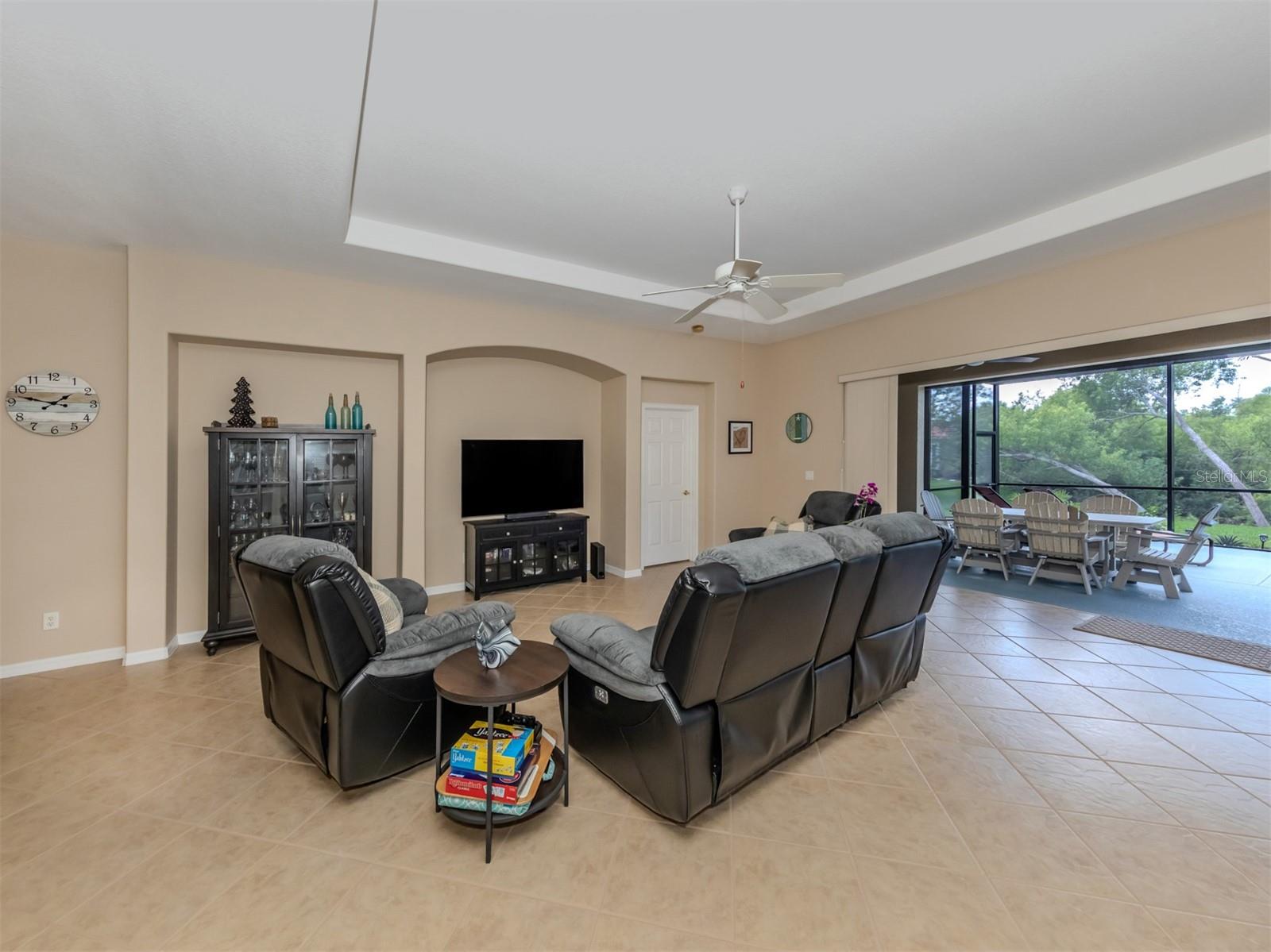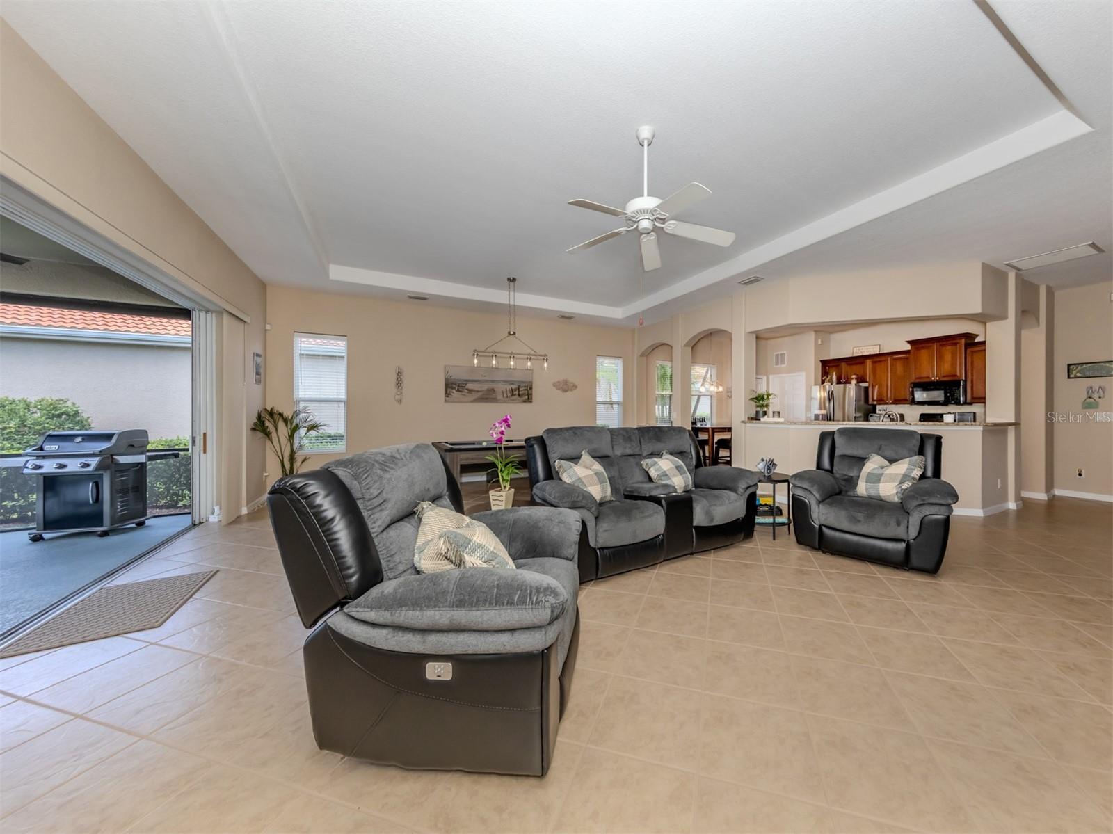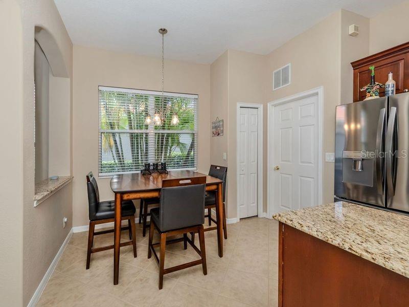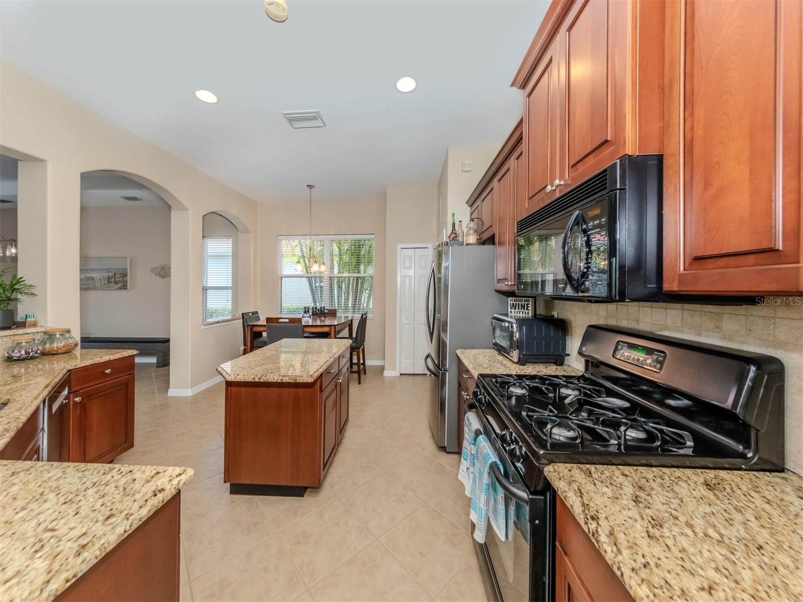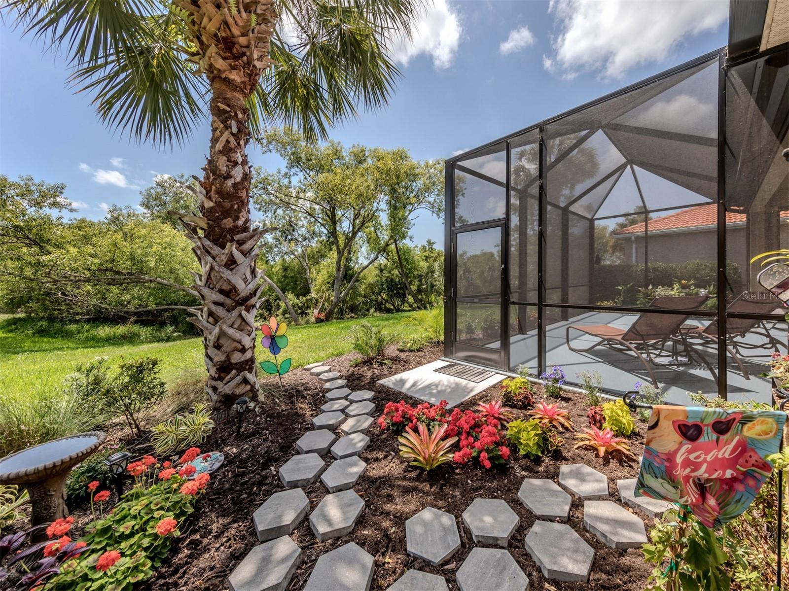 Enjoy a quality built home by WCI, an Extended Fioretti Model in the beautiful highly desired Venetian Golf and River Club. This one story single family home is situated on a quiet cal-de-sac street in the beautifully manicured gated community. Home offers you two large bedrooms, two full bathrooms, a versatile den/office and a bright open floor plan living room, dining room and kitchen. Upon entering the home, your vision draws you to the beautiful expansive glass sliding pocket doors which bring you to the VERY large newly installed extended lanai and private tree lined backyard. Living and entertaining will come with ease in this lovely home with high ceilings, new ceiling fixtures and fans, granite countertop breakfast bar, lots of cabinetry, a center island, gas range, new LG refrigerator, new Bosch Dishwasher, eat-in-area and pantry. The primary suite offers a spacious retreat with a patio door leading to the lanai, a large walk-in closet, dual sinks, garden soaking tub, separate shower and charming block window. The second bedroom sits separately in the front of the house with direct access to the guest bathroom. The den/office provides flexible space located just off the kitchen. Recently painted Inside and outside home features motorized rolldown hurricane screens, full house impact windows, new gutters, new shower in guest bathroom, new kitchen appliances, attractive 18" diagonal tile floors and new landscaping in the backyard. This exceptionally maintained home is move-in ready. After breakfast on your large, partly sunny and partly shaded lanai bike or walk to River Club Amenity Center. Treat yourself to lunch and a cocktail at the Tiki Bar alongside the Resort Size Swimming Pool and separate Lap Pool. Both pools are saltwater heated and chilled! Enjoy staying active at the onsite 6 TruClay Tennis Courts, 3 new Pickle Ball Courts, fully equipped gym and Fitness Center. Take a walk on the nature trail boardwalk that leads you to a deck view of the Myakka River. Breakfast, lunch and dinner can also be enjoyed at the Clubhouse. If you enjoy golf, the Venetian Golf Club by Heritage is within our gates, an optional membership is available to Venetian residents. Living in this paradise home is just a short drive from the beautiful Casey Key Gulf beaches, downtown historic Venice shopping and dining, legacy bike trails, arts and theatre and state-of-art Sarasota Hospital.