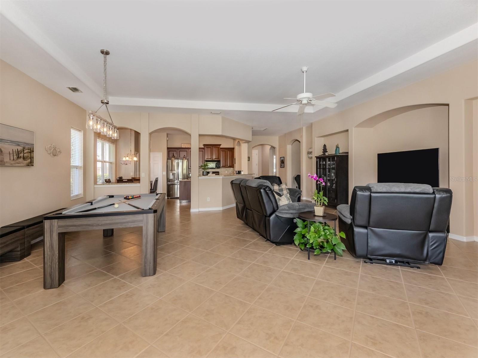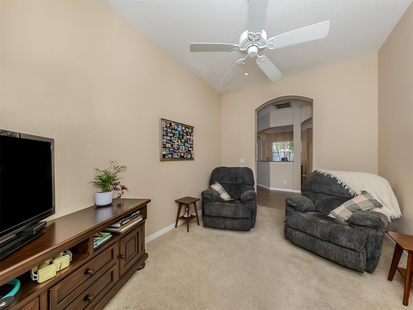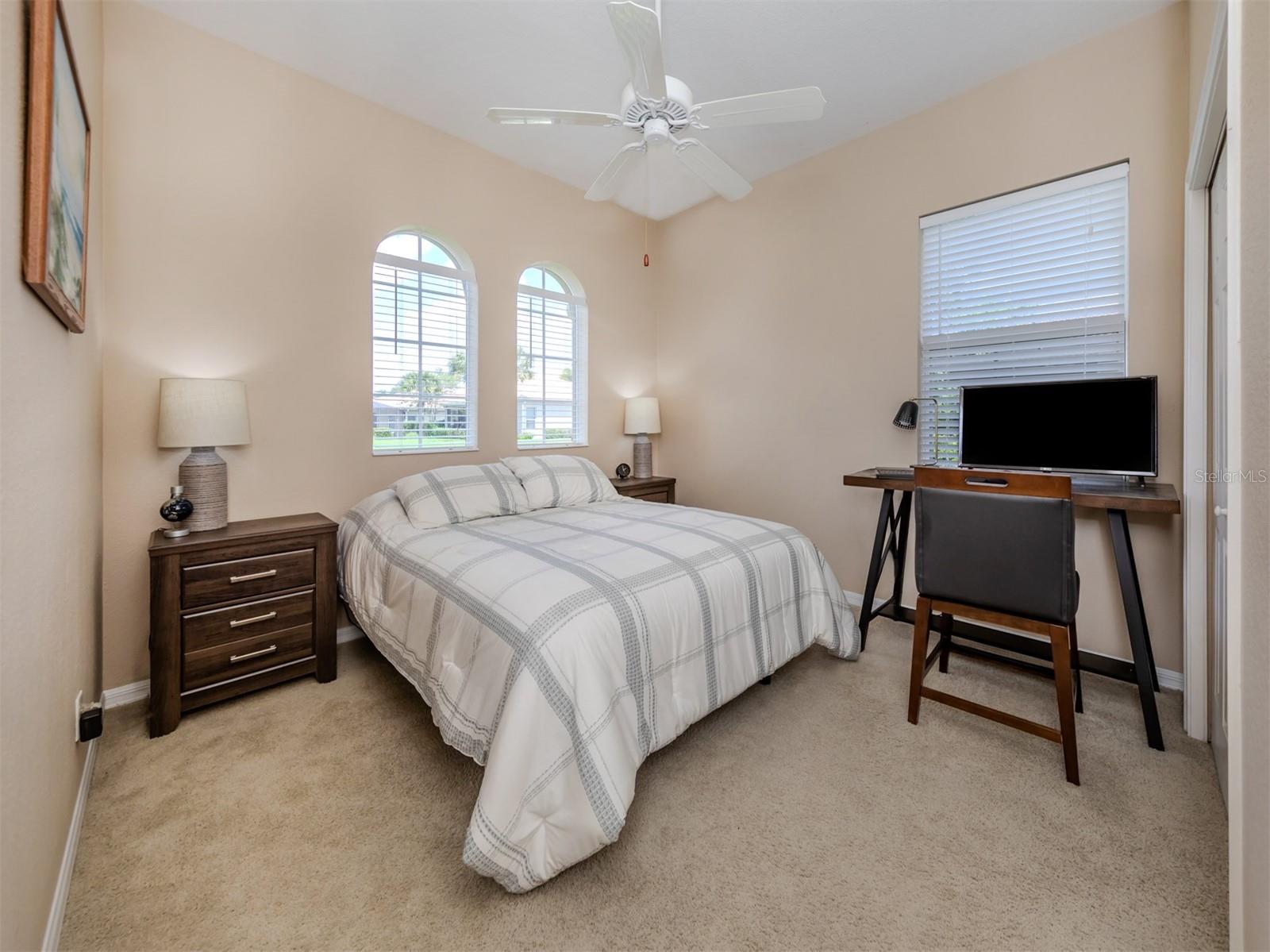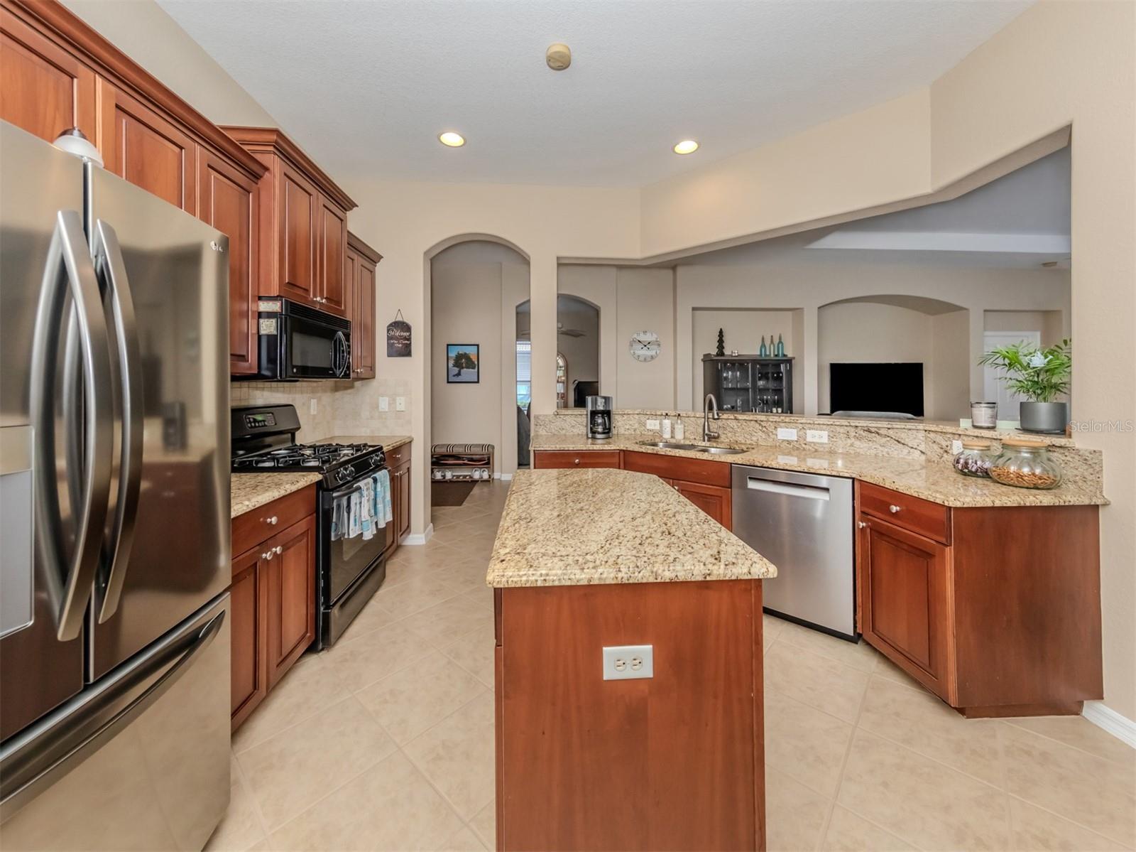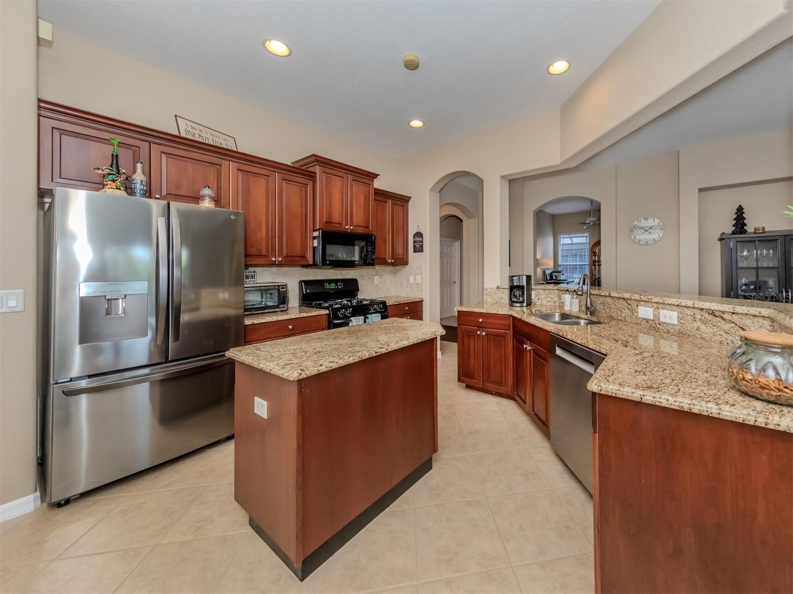 Enjoy a quality built home by WCI, an Extended Fioretti Model in the beautiful highly desired Venetian Golf and River Club. This one story single family home is situated on a quiet cal-de-sac street in the beautifully manicured gated community. Home offers you two large bedrooms, two full bathrooms, a versatile den/office and a bright open floor plan living room, dining room and kitchen. Upon entering the home, your vision draws you to the beautiful expansive glass sliding pocket doors which bring you to the VERY large newly installed extended lanai and private tree lined backyard. Living and entertaining will come with ease in this lovely home with high ceilings, new ceiling fixtures and fans, granite countertop breakfast bar, lots of cabinetry, a center island, gas range, new LG refrigerator, new Bosch Dishwasher, eat-in-area and pantry. The primary suite offers a spacious retreat with a patio door leading to the lanai, a large walk-in closet, dual sinks, garden soaking tub, separate shower and charming block window. The second bedroom sits separately in the front of the house with direct access to the guest bathroom. The den/office provides flexible space located just off the kitchen. Recently painted Inside and outside home features motorized rolldown hurricane screens, full house impact windows, new gutters, new shower in guest bathroom, new kitchen appliances, attractive 18" diagonal tile floors and new landscaping in the backyard. This exceptionally maintained home is move-in ready. After breakfast on your large, partly sunny and partly shaded lanai bike or walk to River Club Amenity Center. Treat yourself to lunch and a cocktail at the Tiki Bar alongside the Resort Size Swimming Pool and separate Lap Pool. Both pools are saltwater heated and chilled! Enjoy staying active at the onsite 6 TruClay Tennis Courts, 3 new Pickle Ball Courts, fully equipped gym and Fitness Center. Take a walk on the nature trail boardwalk that leads you to a deck view of the Myakka River. Breakfast, lunch and dinner can also be enjoyed at the Clubhouse. If you enjoy golf, the Venetian Golf Club by Heritage is within our gates, an optional membership is available to Venetian residents. Living in this paradise home is just a short drive from the beautiful Casey Key Gulf beaches, downtown historic Venice shopping and dining, legacy bike trails, arts and theatre and state-of-art Sarasota Hospital.