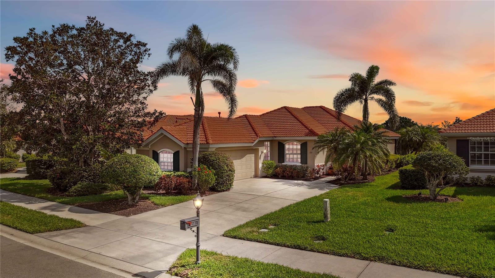 Nestled in the sought-after Venetian Golf and River Club, this meticulously maintained furnished home offers a tranquil, sweeping view of the lake and preserve, paired with breathtaking sunset vistas over your private pool. This residence features cherry wood cabinets with convenient roll-out shelves, stone countertops, and tile laid on the diagonal in kitchen, living room and dining room. The home boasts custom plantation shutters, recessed lighting, dimmer switches, and ceiling fans, providing both elegance and comfort in every room. For golf enthusiasts, the community offers a championship 18-hole golf course where membership is optional, or take a leisurely stroll to the River Club where you'll find elegant dining, a welcoming lounge, an aerobics studio, a fitness center, pickleball, and tennis courts with a pro shop, and two resort-style pools. Nature lovers will appreciate the 70-acre Nature Park, with a boardwalk leading to the Myakka River for an outdoor adventure. Conveniently located near downtown Venice, this home offers access to boutique shopping and fine dining, and is just a short drive from the stunning Gulf beaches. This is a must-see home for those who appreciate luxury living in a serene and active community.