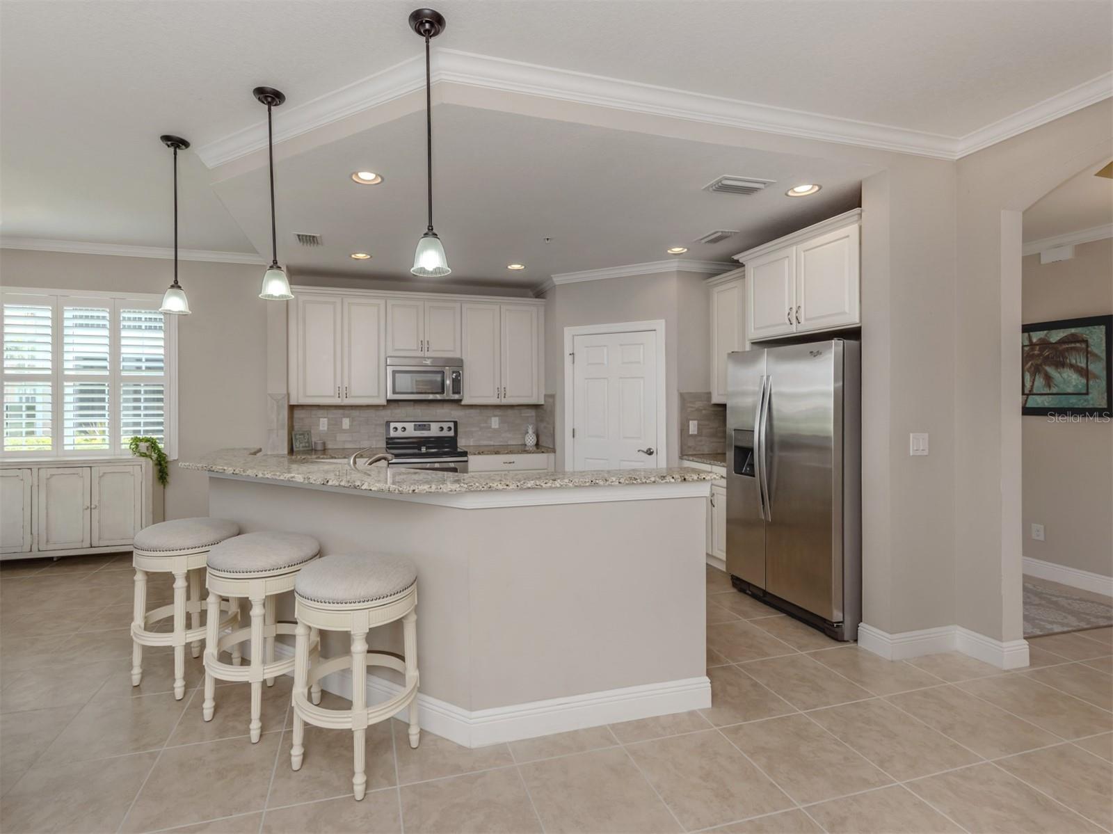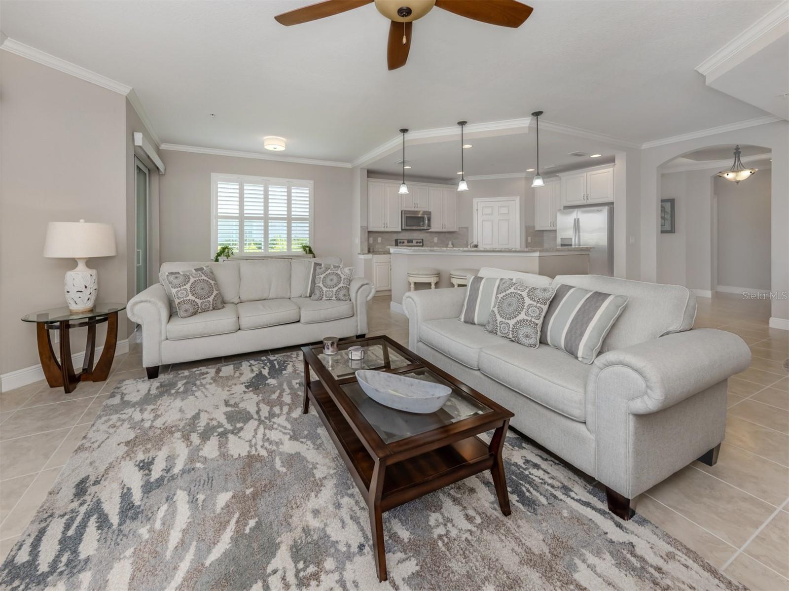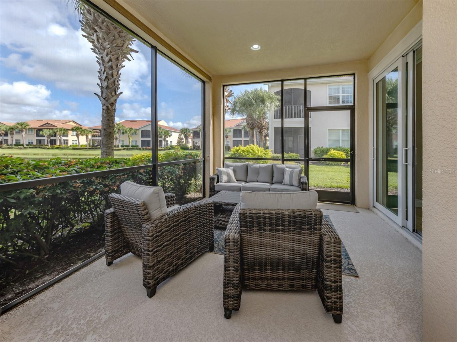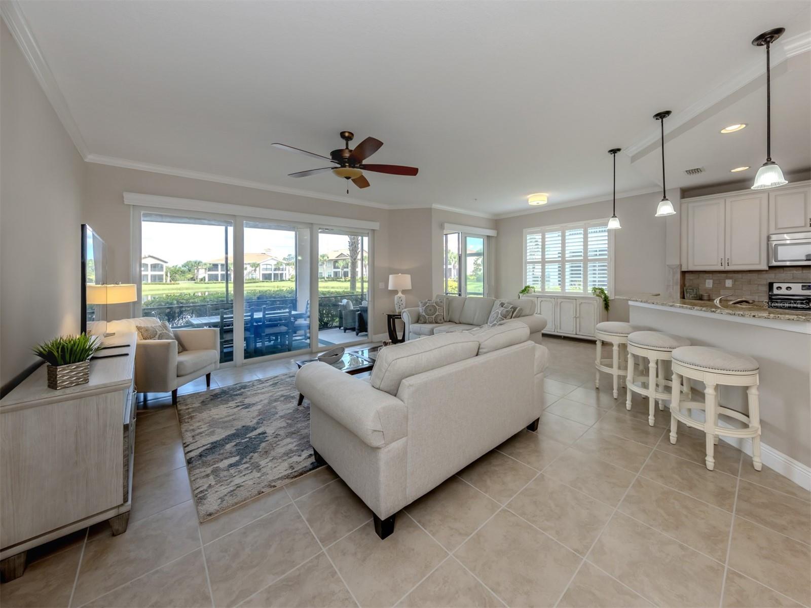 Come live the MAINTENANCE-FREE lifestyle in this beautifully designed Corsica model condo TURN- KEY FURNISHED Carriage home, perfect for everyday comfort and effortless entertaining. This spacious IMPECCABLY MAINTAINED 3 bedroom, 2-bath home offers 1,744 sq ft of open, airy living space with serene views of a tranquil pond and water feature. Start your mornings with coffee at the breakfast bar, in the café-style dining nook, or out on the screened lanai, all overlooking peaceful water vistas. Natural light fills the space through sliding glass doors from the great room, café, and owner’s suite, creating a warm and inviting atmosphere. The open kitchen features light cabinetry, granite countertops, stainless steel appliances, and tile flooring, flowing seamlessly into the great room and formal dining area—ideal for both relaxed living and entertaining. Tray ceilings in the formal dining room, owner’s suite, and second bedroom add a touch of elegance throughout. The owner’s suite includes a custom, walk-in closet, dual sinks, and a walk-in shower, offering a comfortable and private retreat. Upgrades include plantation shutters and crown molding. Located in the sought-after Venetian Golf and River Club in North Venice—just 10 minutes from Gulf beaches and shopping—this community offers a vibrant and active lifestyle. The River Club features fine dining with views of a 70-acre nature park along the Myakka River. Residents have access to a full fitness center, aerobics studio, lap pool, resort-style pool with cabana bar, six Har-Tru tennis courts, and newly added pickleball courts. Golfers will appreciate the scenic 18-hole championship course that winds through the lush surroundings. Just minutes from downtown Venice and the beaches, this light-filled condo offers more than just a home...it is a lifestyle. Come see it for yourself and take in the view.