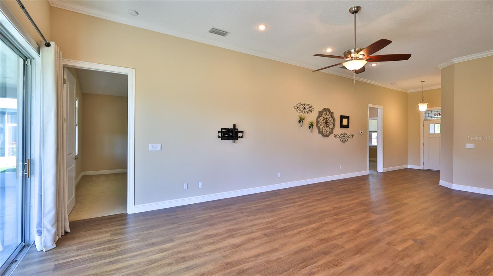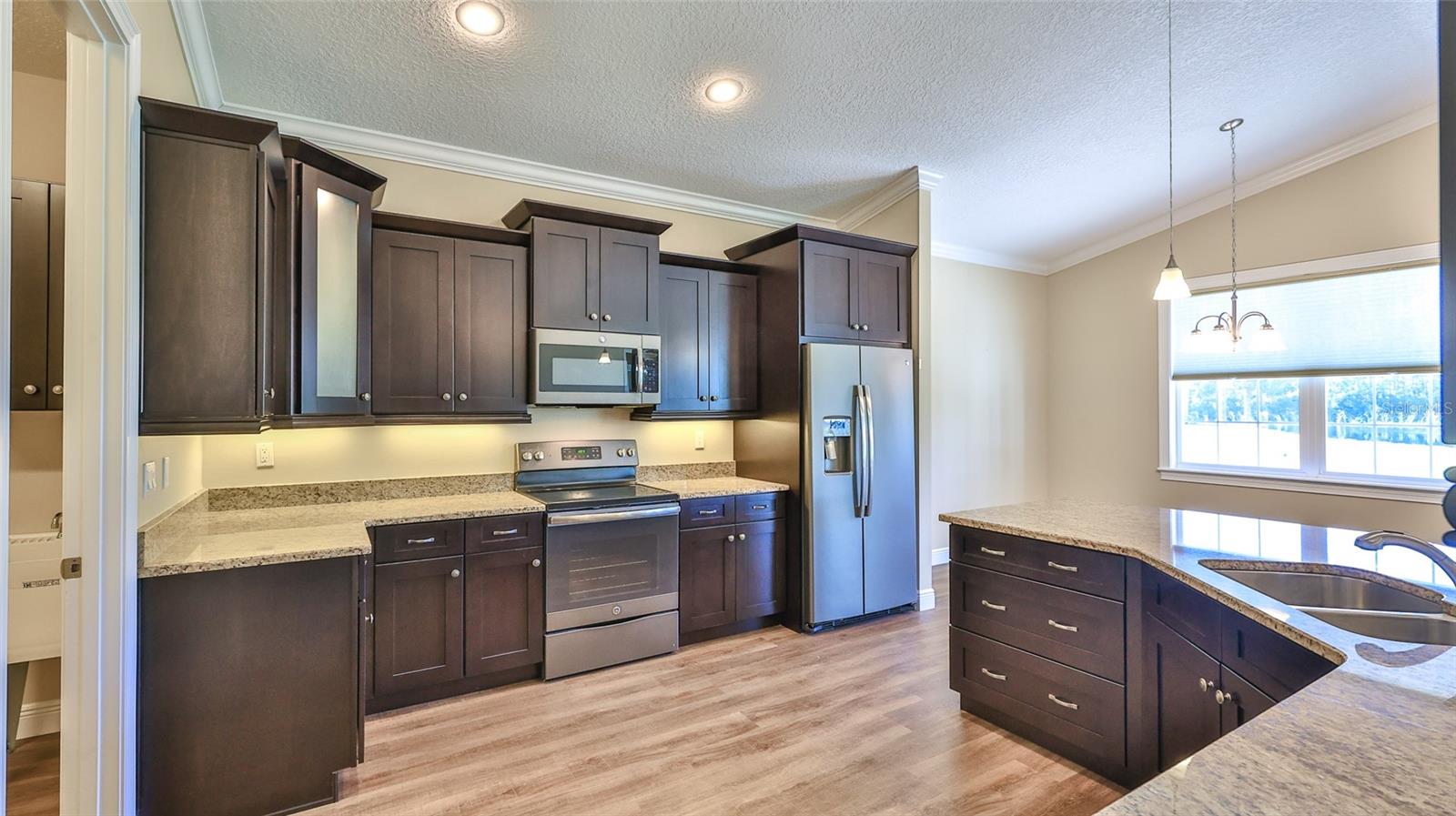 LAKEFRONT - Gorgeous two-bedroom, two bath concrete block home is nestled on a beautiful, landscaped lot and overlooks one of the many lake/ponds in the community. This spacious home features an open floor plan and is great for visiting with family and friends. The kitchen features GE slate appliances, wood cabinets with soft close doors and drawers, granite countertops, undercabinet lighting and more. Other features include vaulted ceilings, crown molding, upgraded luxury vinyl plank flooring in the main living areas, foam insulation in the block walls, an oversized garage (22’x26’) and pavered front porch and driveway. The primary bedroom has a spacious walk in closet and the primary bath features double sinks, granite countertops, linen closet and a zero-entry shower. Enjoy spectacular sunsets from your screened patio. Not a lot rental community, own your own land. Lighthouse Cove is a gated community where golf carts are a second means of transportation. Enjoy a large, heated swimming pool, recently renovated clubhouse, pickleball courts, shuffleboard, boat launch for shallow water boats, recreational picnic area on the river and a fishing pier. It is a boating/fishing/shrimping paradise located a short distance from the Mosquito Lagoon. Watch the rockets launch from the fishing pier. Don’t miss out on a great opportunity to live in Paradise. A must see! All measurements approximate! Information deemed accurate but not guaranteed.