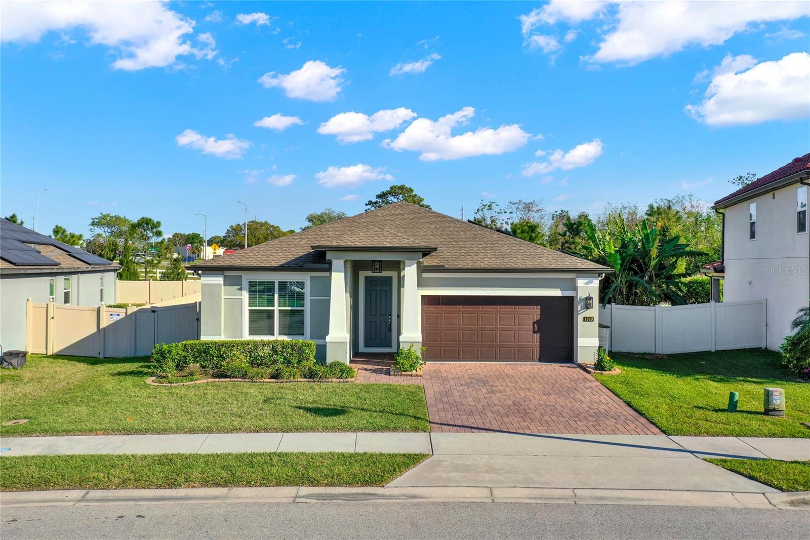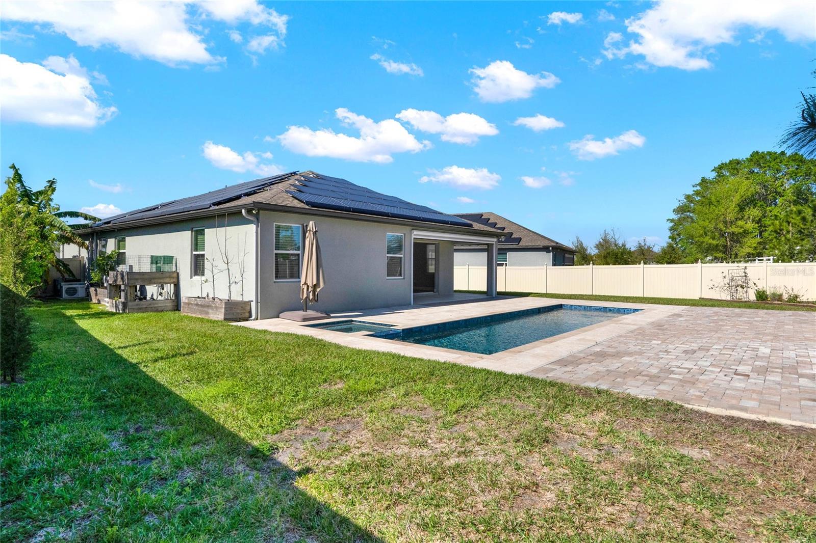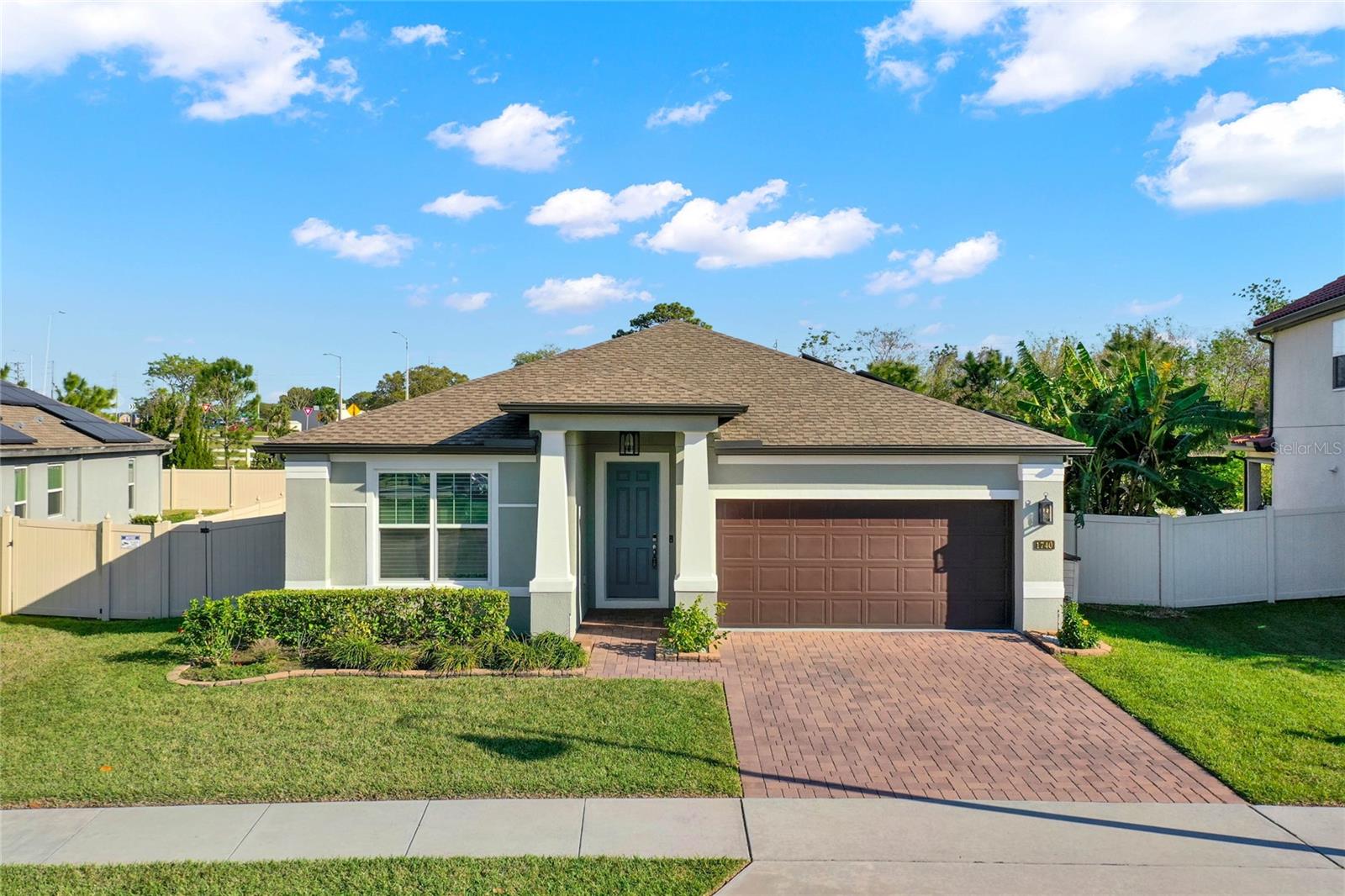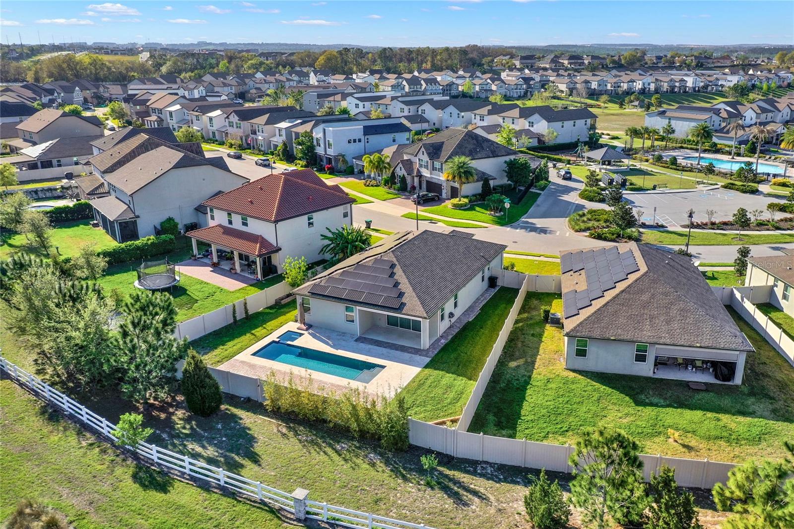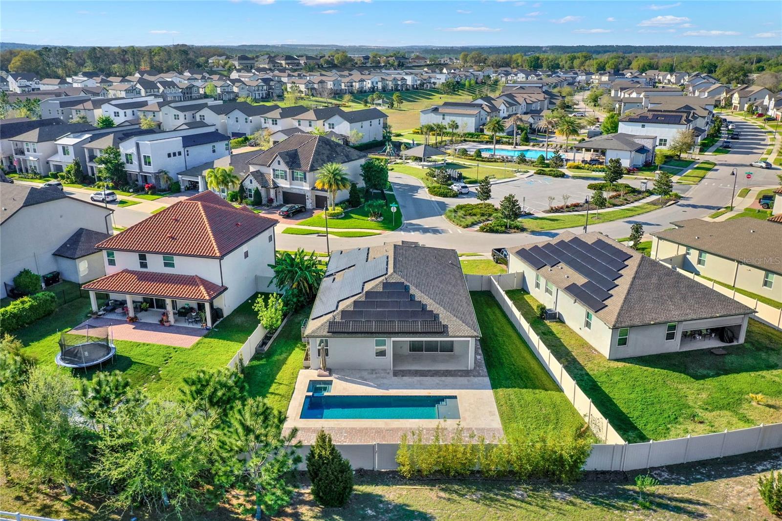 **Video Tour Available** Welcome to Oakland Trails which is situated on the West Orange Trail and in-between the popular downtowns of both Winter Garden and Clermont! This is a Meritage home that was built with beauty and energy efficiencies in-mind. The owners took it a step further by placing Tesla solar panels on the roof to easily support the whole-home and pool energy needs each month. There are 2 Tesla walls in the garage as well. The location of this home is ideal as it’s across the street from the community pool and mailboxes. Enter to find beautiful tile plank flooring, tray ceilings, and upgraded lighting fixtures. The gourmet kitchen has double ovens, a steam dishwasher, quartz countertops, tile backsplash and walk-in pantry. Entertaining is easy with the dedicated dining room which is spacious and still open to the kitchen and family rooms. Fill the home with sound as Sonos speakers were installed in the dining room and kitchen. Relaxation awaits in the primary suite with a luxurious garden tub, frameless shower with upgraded tile, dual vanities, dual walk-in closets and dedicated AC unit. The secondary bedrooms share a bathroom with a quartz countertop. The set of triple sliding glass doors extends the living space to the covered patio with automatic screens, heated and salt water lap pool, spa and spacious backyard. The French travertine tile is stunning and you’ll even find a fruiting Blue Banana tree! The garage has a dedicated AC unit as well, epoxy flooring and overhead storage. Additional upgrades include custom shelving in the laundry room, Ring doorbell, ADT security system and gutters. Oakland Trails is near the Turnpike and 429 so it’s easy to move around town. Don’t miss your chance to see this beautiful home!