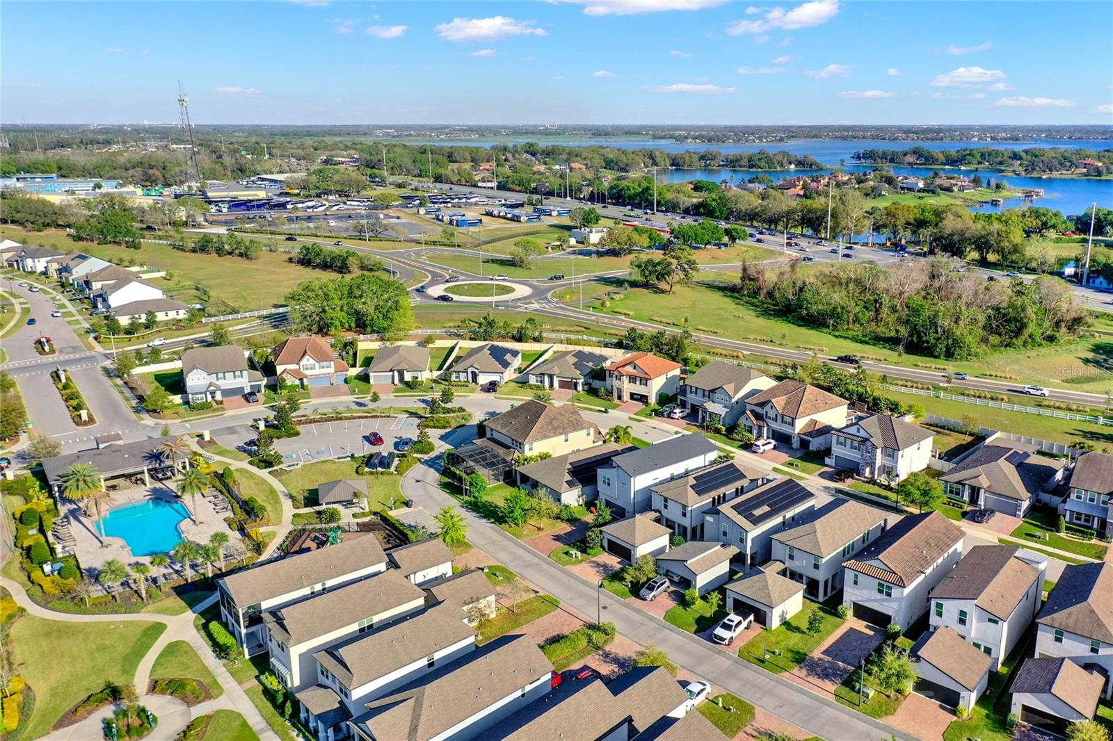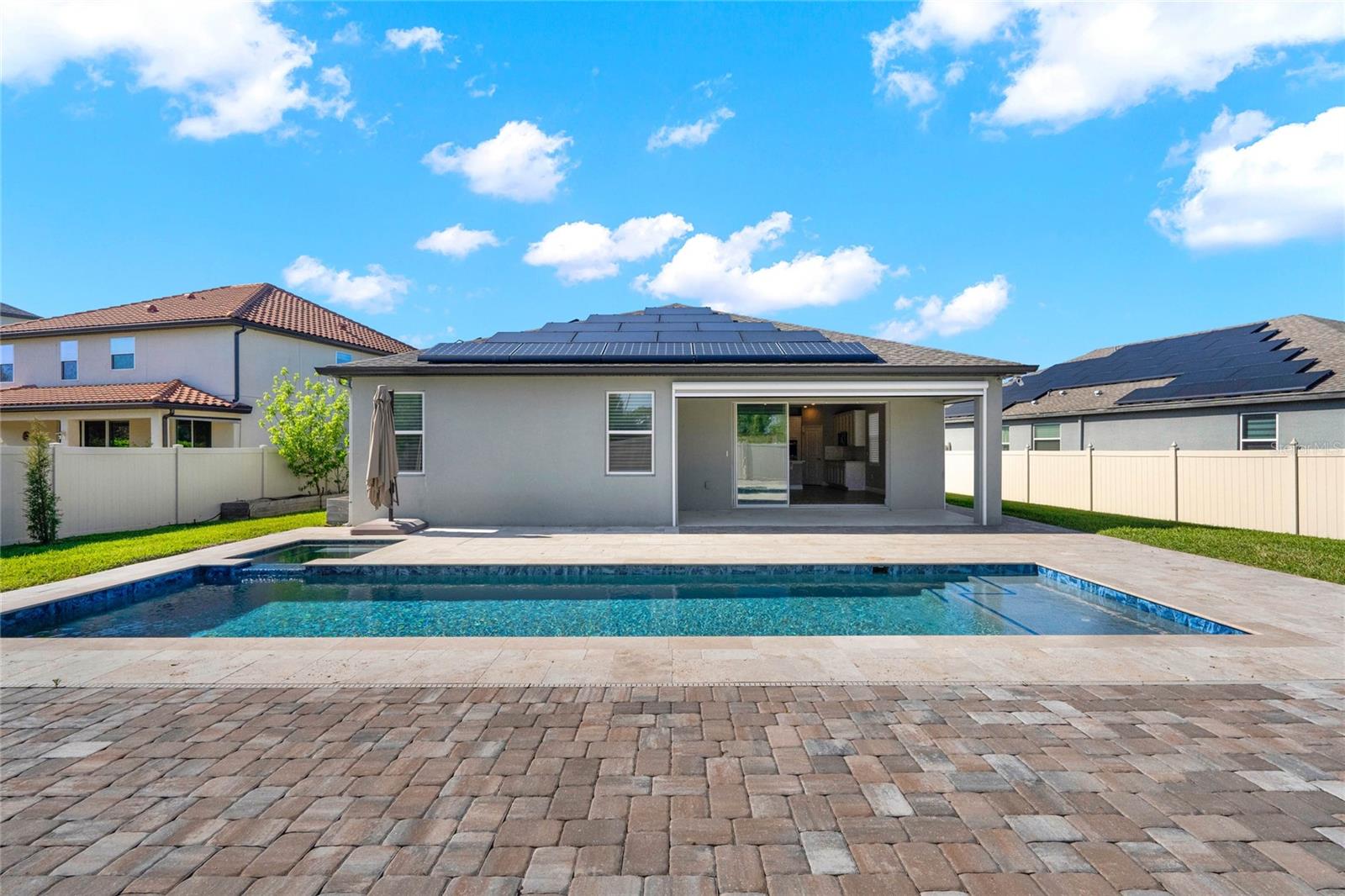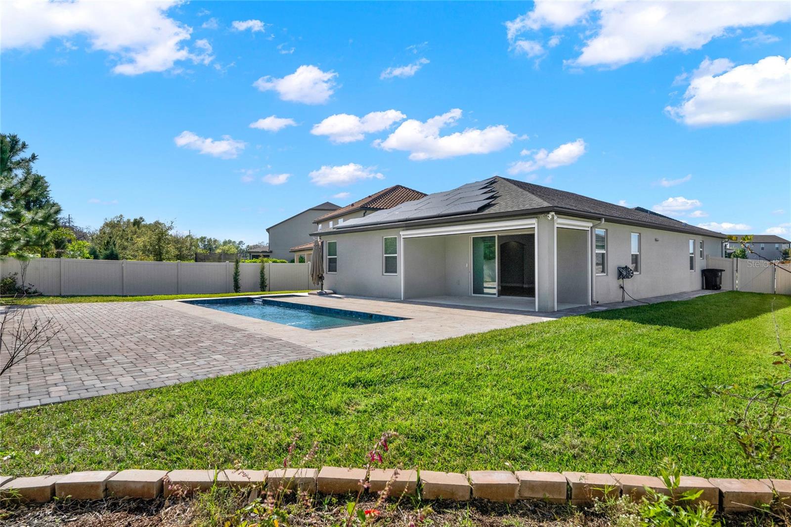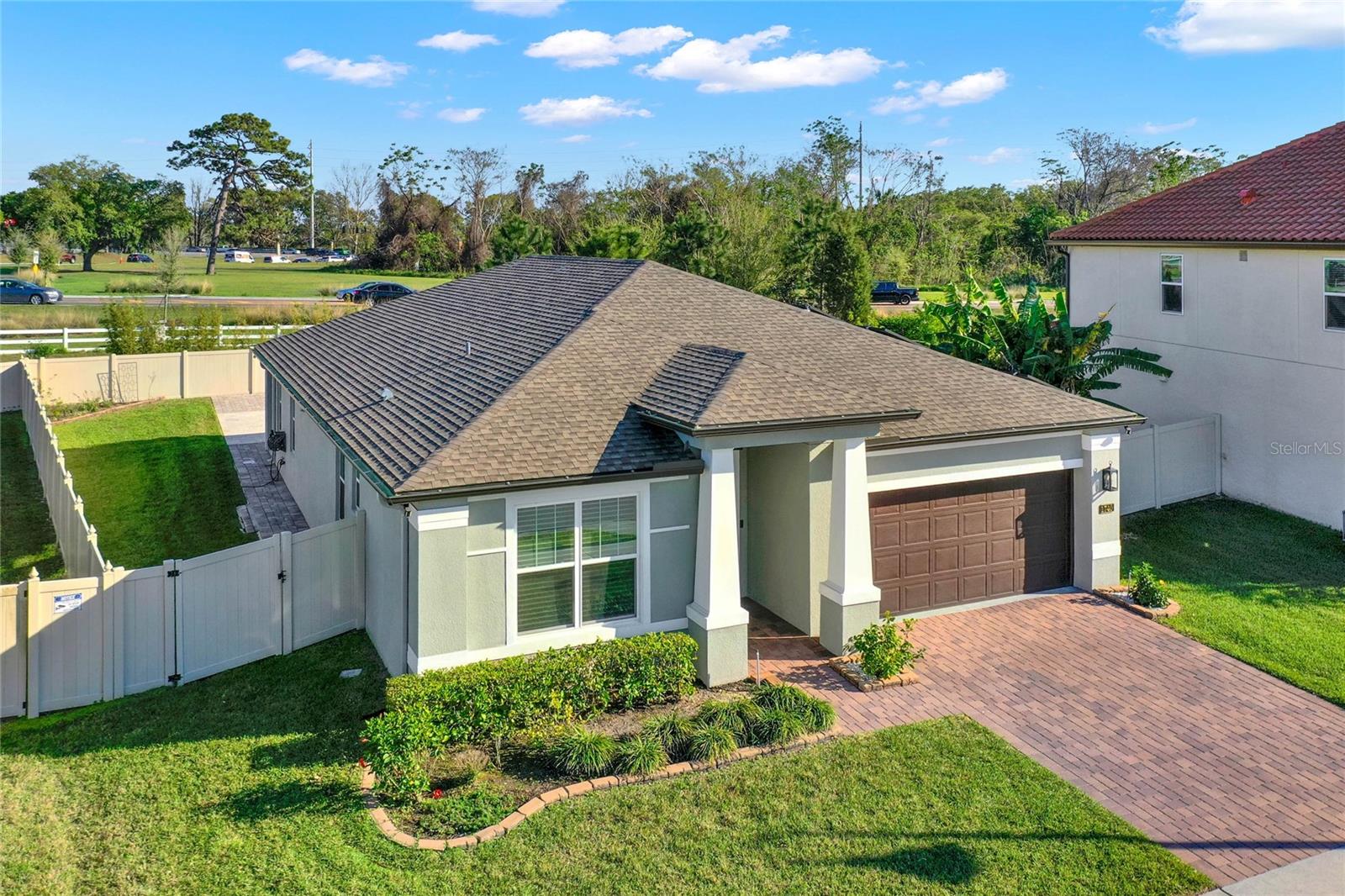 **Video Tour Available** Welcome to Oakland Trails which is situated on the West Orange Trail and in-between the popular downtowns of both Winter Garden and Clermont! This is a Meritage home that was built with beauty and energy efficiencies in-mind. The owners took it a step further by placing Tesla solar panels on the roof to easily support the whole-home and pool energy needs each month. There are 2 Tesla walls in the garage as well. The location of this home is ideal as it’s across the street from the community pool and mailboxes. Enter to find beautiful tile plank flooring, tray ceilings, and upgraded lighting fixtures. The gourmet kitchen has double ovens, a steam dishwasher, quartz countertops, tile backsplash and walk-in pantry. Entertaining is easy with the dedicated dining room which is spacious and still open to the kitchen and family rooms. Fill the home with sound as Sonos speakers were installed in the dining room and kitchen. Relaxation awaits in the primary suite with a luxurious garden tub, frameless shower with upgraded tile, dual vanities, dual walk-in closets and dedicated AC unit. The secondary bedrooms share a bathroom with a quartz countertop. The set of triple sliding glass doors extends the living space to the covered patio with automatic screens, heated and salt water lap pool, spa and spacious backyard. The French travertine tile is stunning and you’ll even find a fruiting Blue Banana tree! The garage has a dedicated AC unit as well, epoxy flooring and overhead storage. Additional upgrades include custom shelving in the laundry room, Ring doorbell, ADT security system and gutters. Oakland Trails is near the Turnpike and 429 so it’s easy to move around town. Don’t miss your chance to see this beautiful home!