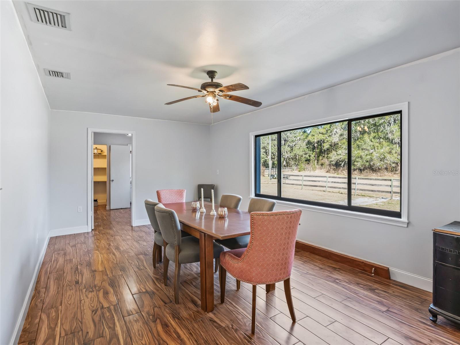 Welcome to this beautifully renovated, gated 2.9-acre equestrian property located in the highly sought-after Meadow Wood Farms community, known for its peaceful setting, established neighborhood, and access to scenic horse trails. The property features a three-bedroom, two-and-a-half-bath home with a spacious two-car garage, thoughtfully remodeled for open-concept living. Both the living room and kitchen showcase stunning floor-to-ceiling fireplaces, creating warm and inviting gathering spaces. The home offers a large dining room with a picture window overlooking the barn, an indoor laundry room with storage closet, and an enclosed Florida room, perfect for relaxing or entertaining. The renovated kitchen is a showstopper, featuring updated cabinetry, a tower pantry, newer appliances, above-cabinet lighting, a farmhouse sink, butcher block countertops, new hardware, and a center island with bar seating for two. Unique stained wood accents throughout the home add character and charm. The primary suite comfortably accommodates a king-size bed and includes a large closet and a beautifully updated bathroom with a walk-in shower, detailed tile and stone flooring, vanity, and bronzed hardware. Two additional bedrooms provide flexibility, with one offering French doors leading to the enclosed sunroom. The guest bathroom is conveniently located, while the half bath offers easy access from the outdoors, ideal for country living. Equestrian amenities include a three-stall horse barn with feed and tack room, rear stall doors opening to private turnout, and three separate fenced paddocks. The property is beautifully shaded with mature trees and is high and dry with no flood concerns. Perfect for those seeking country living with room for horses, this exceptional property offers space, privacy, and functionality in a fantastic neighborhood. Be sure to ask for the feature sheet detailing all renovations. Schedule your private showing today. A Farm Truck Conveys with Purchase if buyer would like it! ONLY 7 Minutes from the World Equestrian Center!