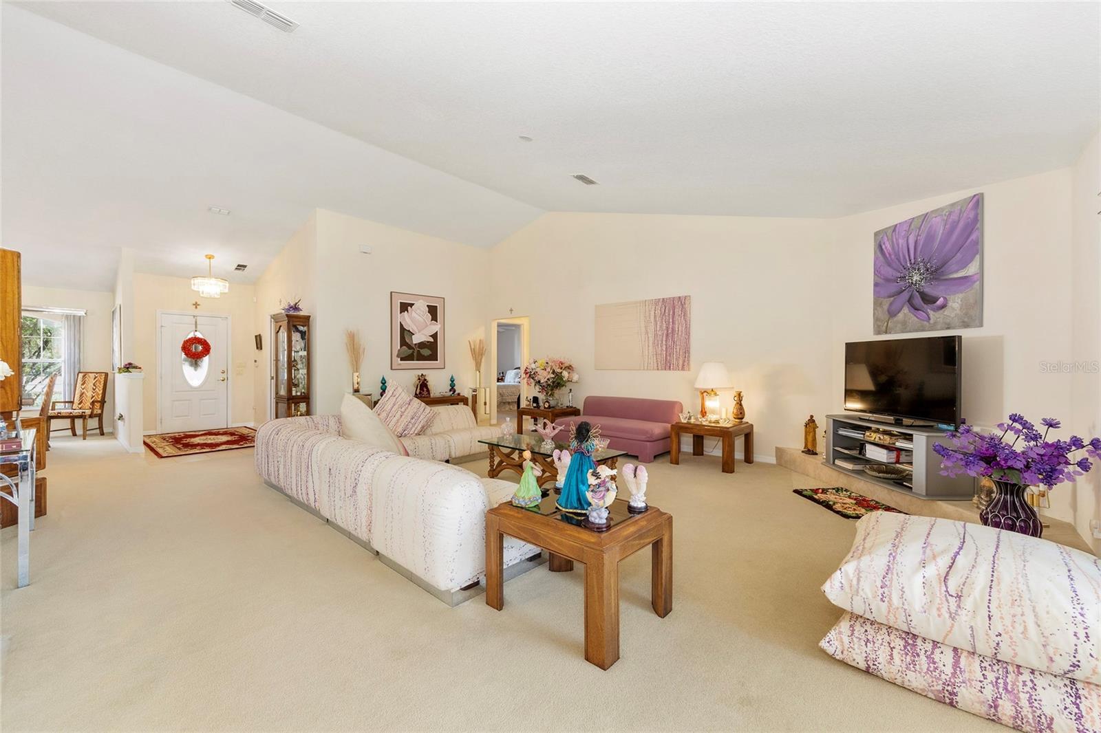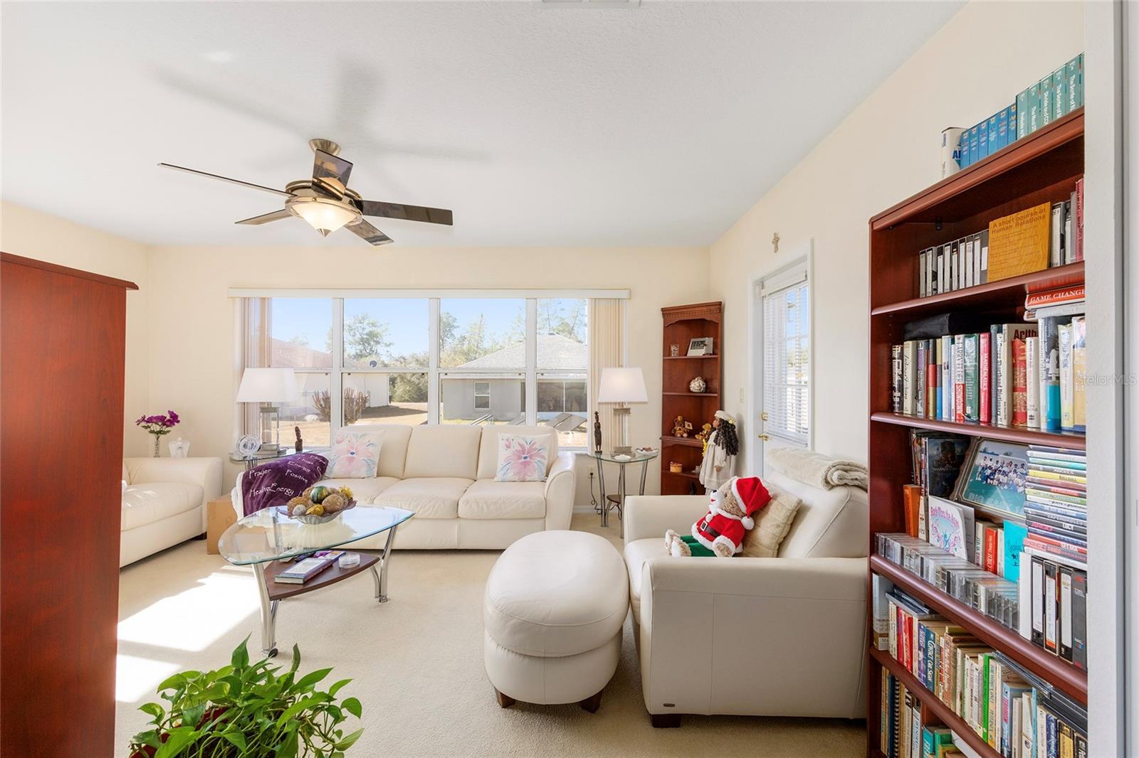 Extraordinary homes like this don’t come to market very often—usually because family, friends, or even the agent themselves snap them up first. This well-thought-out floor plan offers 2,539 square feet of living space, plus an additional 200 square feet under A/C in the finished lanai/family room. The home features beautiful mature landscaping, a color-sealed driveway, and a yard light, along with attractive stonework on the front elevation. Inside, you’ll find a large foyer, an ADT security system, three bedrooms, a separate office with pocket doors, and a spacious enclosed lanai with carpet flooring, insulated windows, and A/C—currently used as the family room. The primary bedroom is generously sized with nook built in for an armoire or work station and includes a large walk-in closet. The ensuite bathroom features a walk-in shower, Jacuzzi tub, dual sinks and a built-in linen closet. The kitchen offers beautiful cabinetry, a porcelain double-bowl sink, abundant counter space, and stainless steel appliances, including a five-burner gas range. A skylight fills the kitchen with natural light, enhancing the adjacent casual dining area with bay window—perfect for everyday meals. A formal dining room on the opposite side of the kitchen is ideal for hosting larger gatherings. This is a one-owner, custom-built home, carefully cleaned and maintained since new. Roof replaced in 2023 and A/C replaced in 2019. If you’re in the market for a large, one-of-a-kind custom home in Marion Oaks, Ocala, make plans to see this fine home today.