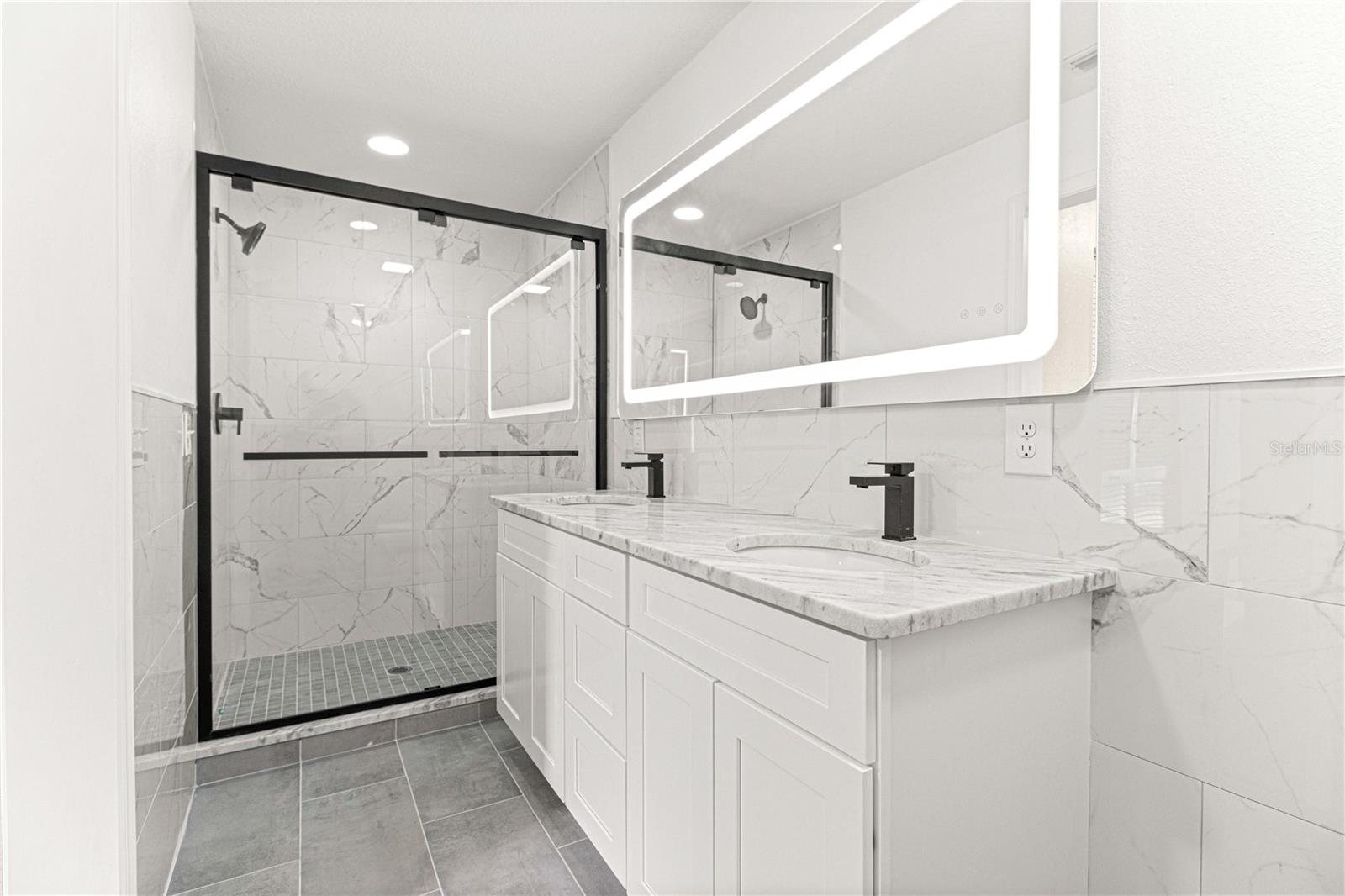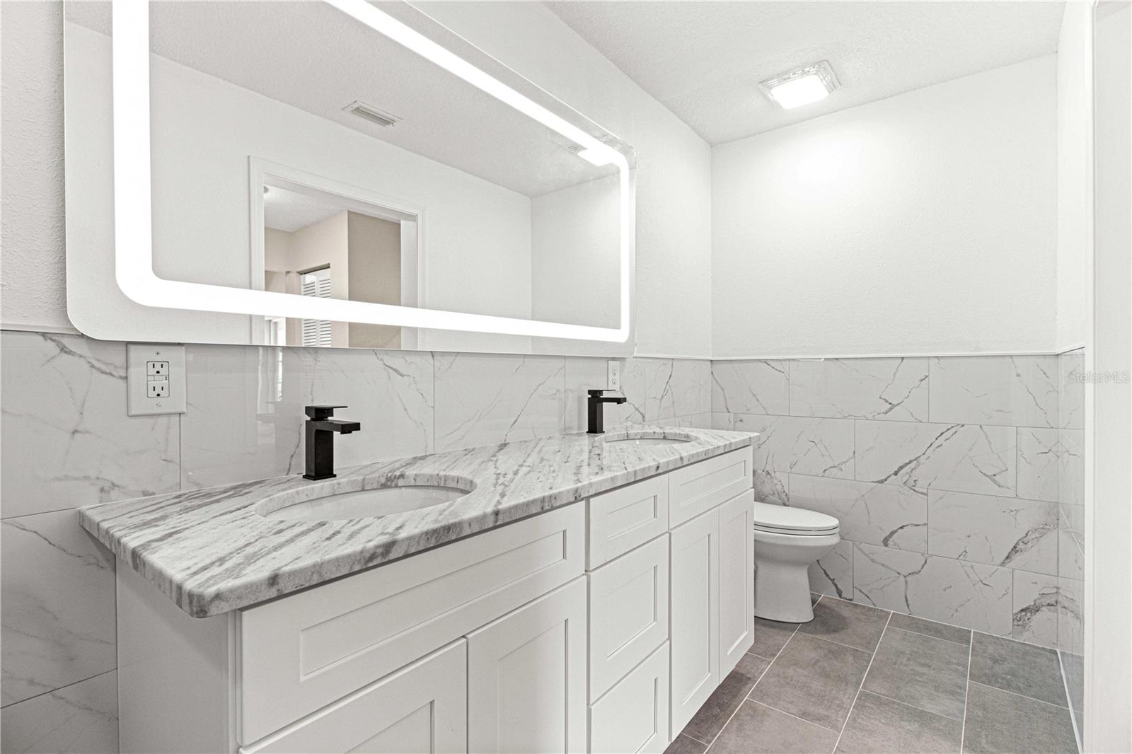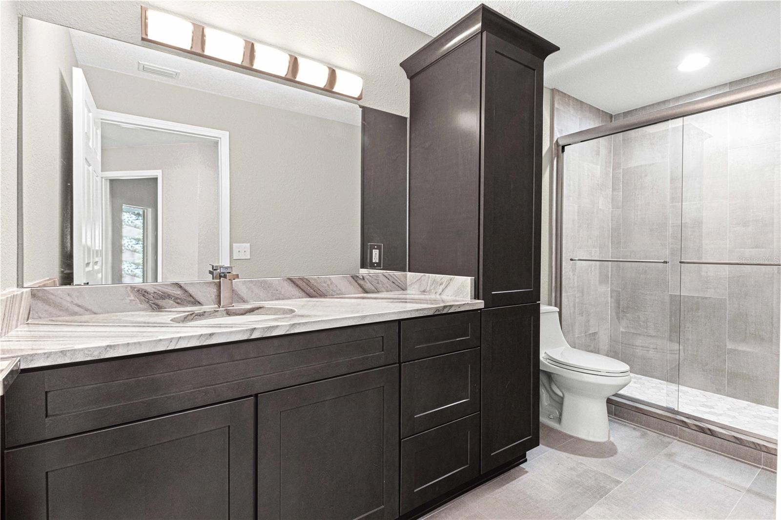 Completely remodeled and move-in ready, this beautifully updated 2 bedroom, 2 bath home is situated in Williamsburg within the highly desirable 55+ community of On Top of the World in Ocala. Step inside to volume ceilings and vinyl plank flooring that create a bright, open feel throughout the main living areas. The brand new kitchen is thoughtfully designed with 42 inch upper cabinets, soft close cabinetry and drawers, granite countertops, tile backsplash, breakfast bar seating, and brand new stainless steel appliances. The primary suite features a walk-in closet, additional linen closet, dual sinks with marble countertops, a tiled step-in shower with glass doors, and a sleek anti-fog mirror for a modern touch. The guest bathroom is fully updated with granite countertops, soft close cabinetry, and a tiled step-in shower with glass doors. The guest bedroom offers a large built-in closet, and an additional hallway linen closet provides even more storage. Enjoy outdoor living with a courtyard, screened lanai, and 1 car garage. Modern ceiling fans are installed throughout, and the HVAC was replaced in 2022 for added peace of mind. Residents enjoy resort-style amenities including pools, golf courses, recreation centers, fitness facilities, walking trails, and a full calendar of social activities. Thoughtfully renovated and truly move-in ready, this home offers both style and lifestyle.Due to recent weather conditions, the current landscaping may not reflect the photos. This is weather related and not due to lack of maintenance.