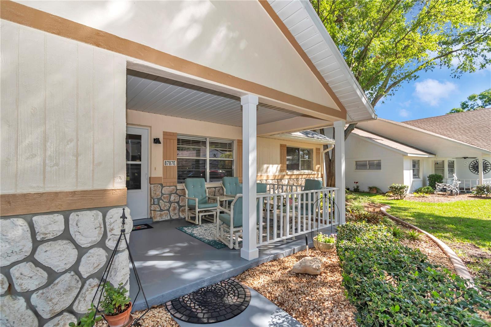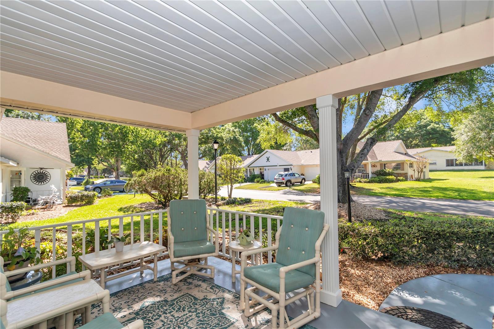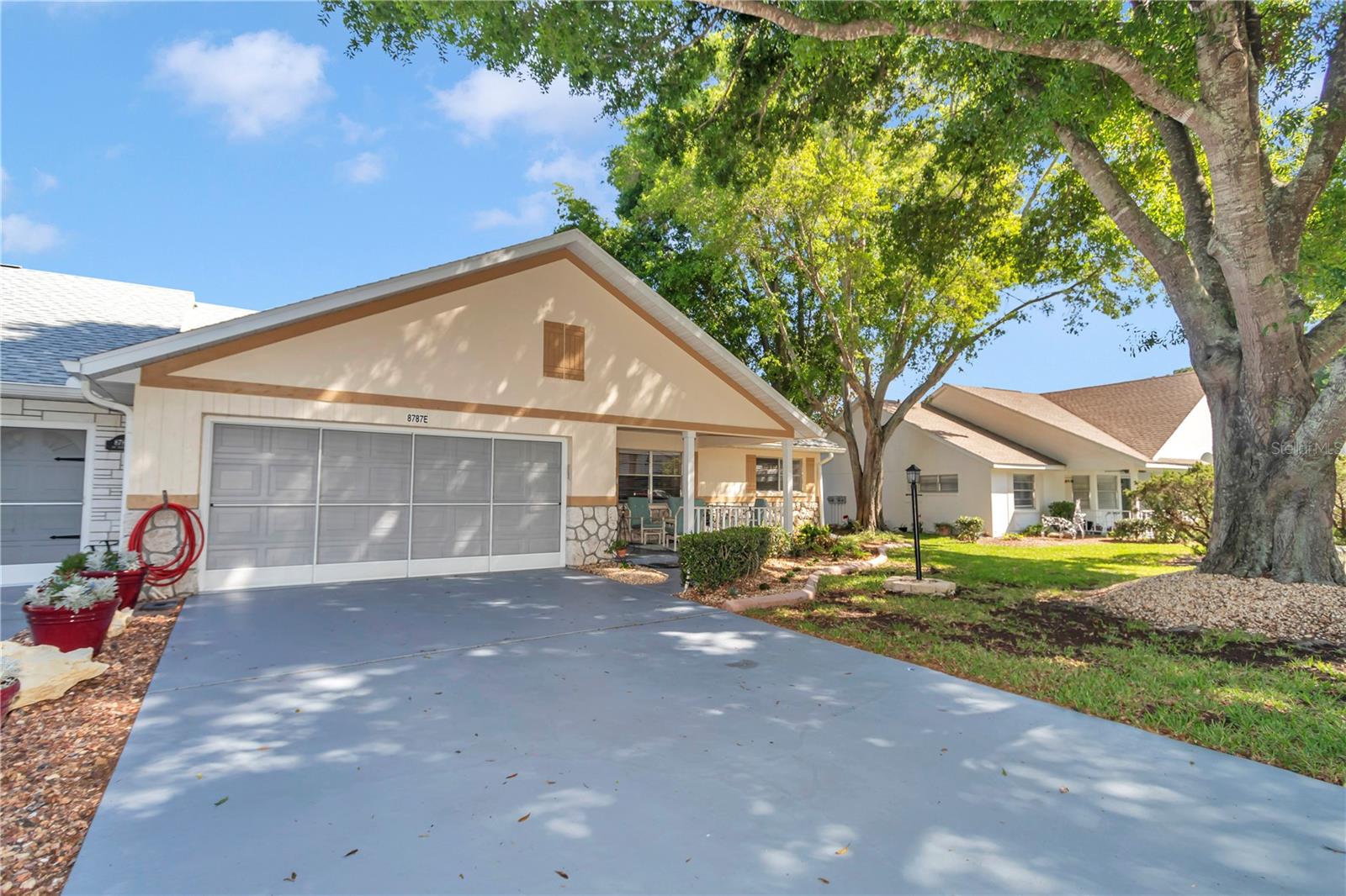 Live ON TOP OF THE WORLD in one of Florida's Premier Retirement Communities in this spacious end unit Bostonian villa, located on a quiet tree lined street. This home features a freshly painted interior along with the garage, hardwood floors throughout main living area including closets, new kitchen appliances, a 30-year architectural shingle roof installed in 2021, Florida Room with central air and new windows, updated ceiling fans, newer hot water heater and new water softener installed last year. As you approach the home, you are met with a welcoming front porch perfect for a relaxing evening at home. Notice the beautiful leaded glass entrance door as you step inside to the open concept living room/dining room. To the right are the bedrooms, to the back left is the kitchen, keeping room, Florida room, and garage entrance. The guest bedroom with lots of natural light and generous sized closet is in the front right of the home. The guest/hall bath with water efficient toilet and a tub with tile surround divides the bedrooms. The generous size master bedroom is in the back right of the home for privacy. This bedroom also has lots of natural light with the end unit transient windows, a spacious walk-in closet with Closet by Design shelving, en suite bath with step-in shower, and comfort height toilet. Moving back through the living room/dining room you enter the kitchen with a breakfast nook before seeing the kitchen with large island and new appliances. The Florida room is adjacent to the kitchen and usable year 'round with temperature control and newer windows. Outside the Florida room is a small patio area perfect for a grill. The two-car garage is complete with a screen door with ample room for your cars, laundry area and additional storage. The monthly HOA fee includes basic cable, roof repair, exterior painting every seven years, exterior maintenance and insurance, landscaping, 24/7 guarded gates and all the amenities that OTOW has to offer; three pools (2 outside & 1 inside), two state of the art fitness centers, pickleball, billiards, archery range, corn hole, bocce ball, tennis, shuffleboard, horse shoes, remote control flying field and race cars, 175+ clubs, library, and much, much more!