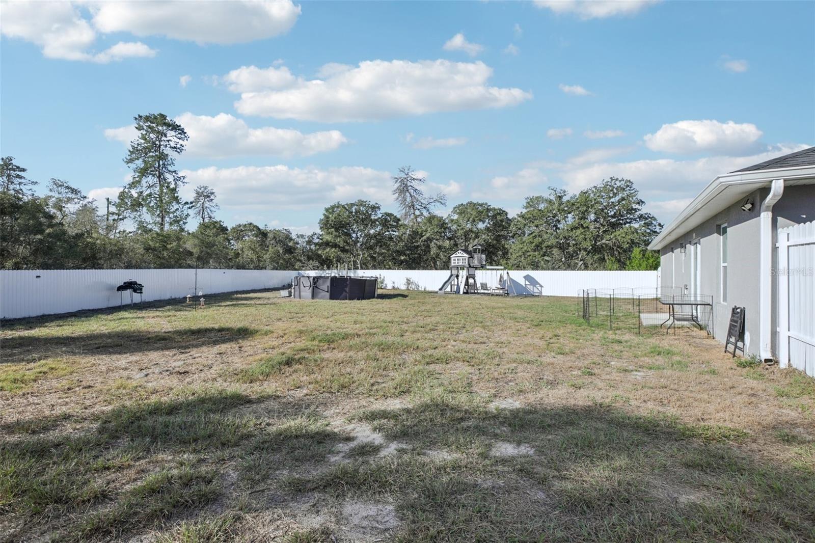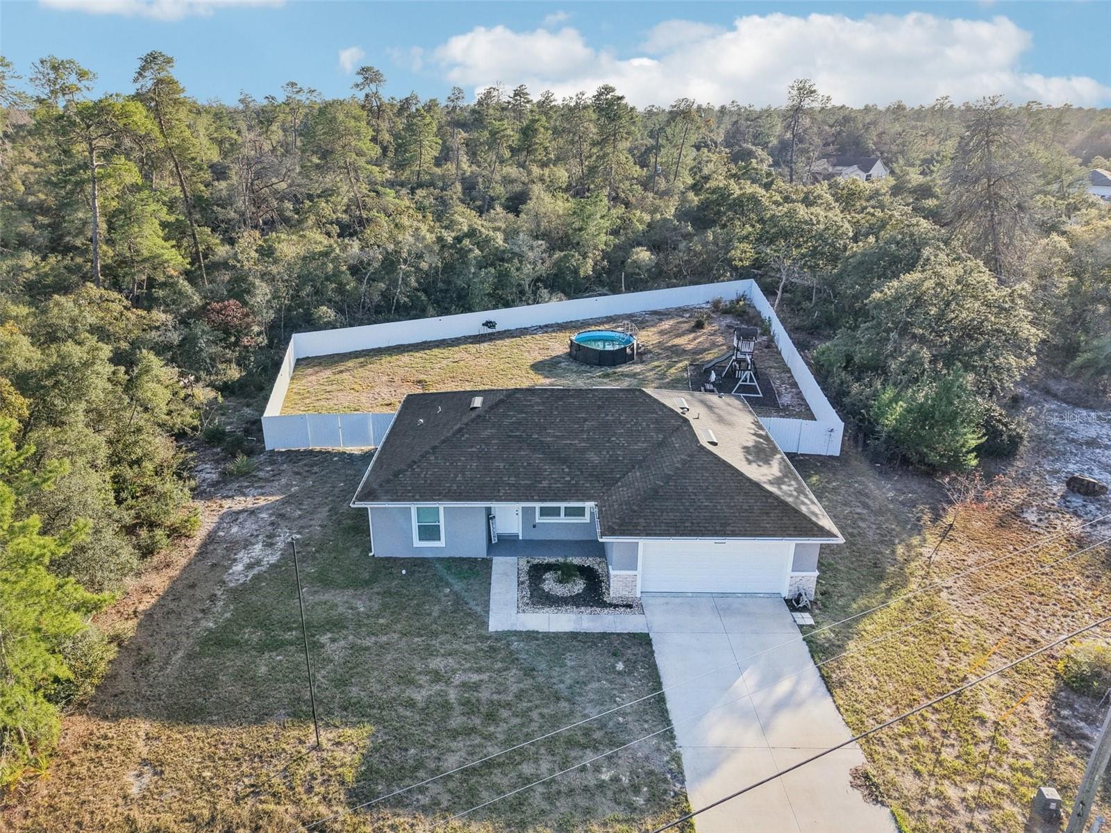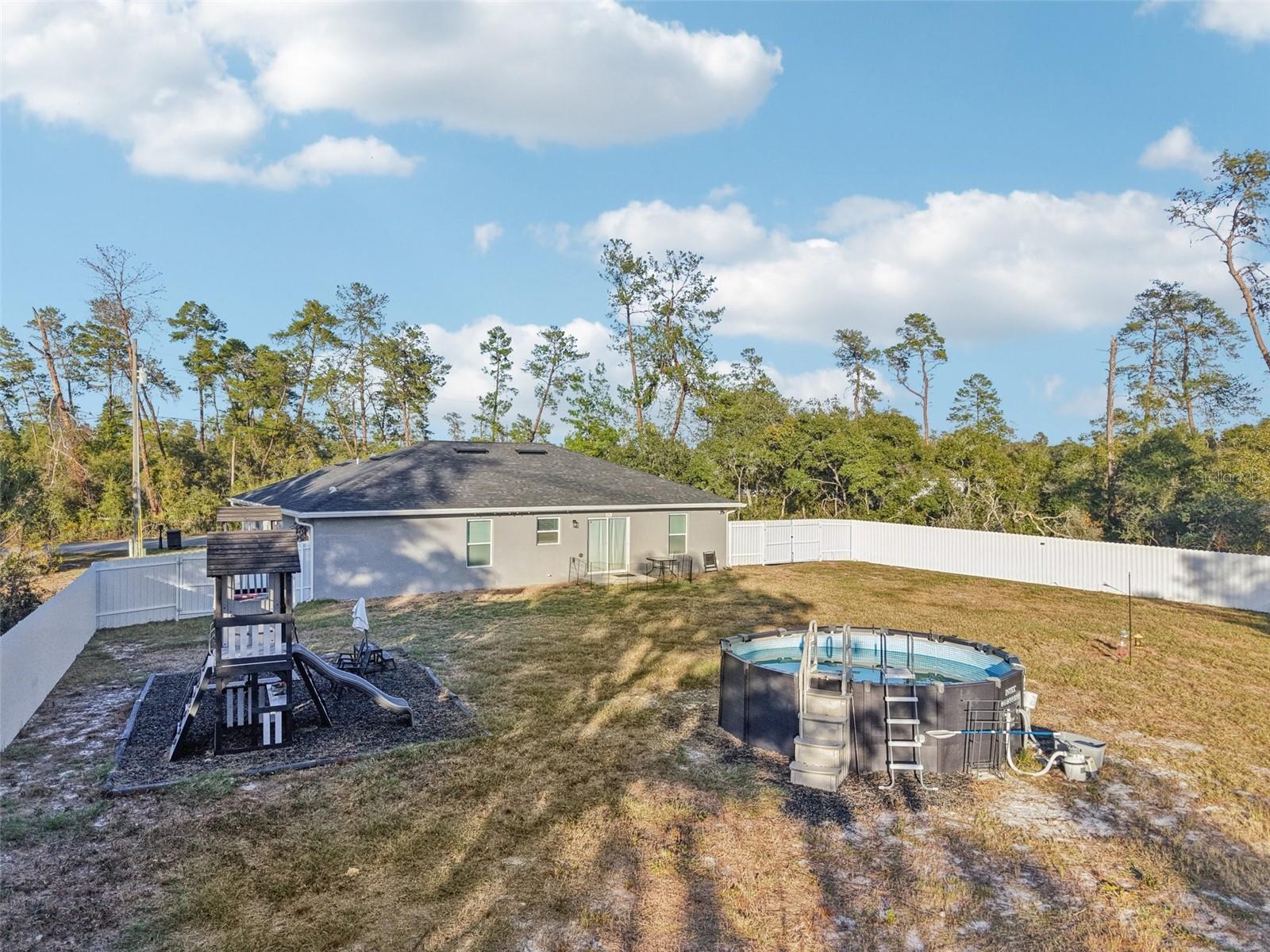One or more photo(s) has been virtually staged. Welcome to this inviting single-family home located in the Marion Oaks community of Ocala, Florida. Offering 3 bedrooms, 2 bathrooms, and 1,368 square feet of living space, this home sits on over a quarter of an acre, providing plenty of room to enjoy both indoor and outdoor living. Upon entering, you are welcomed by an open floor plan that connects the living room, dining area, and kitchen, creating a comfortable and functional layout. The main living area features vaulted ceilings that enhance the sense of space and natural light. The kitchen is equipped with stainless steel appliances, a center island, and a sliding glass door off the dining area that leads directly to the backyard. The split-bedroom floor plan offers added privacy. The primary suite features an en suite bathroom with dual sinks and a beautifully tiled walk-in shower. Two additional bedrooms and a second full bathroom complete the interior layout. Step outside to the spacious, fully fenced backyard, where you’ll find a playground and an above-ground pool, along with ample space for outdoor activities. Conveniently located near golf courses, natural preserves, and with easy access to major highways, this home offers a great combination of comfort, space, and accessibility. Mortgage savings may be available for buyers of this listing.